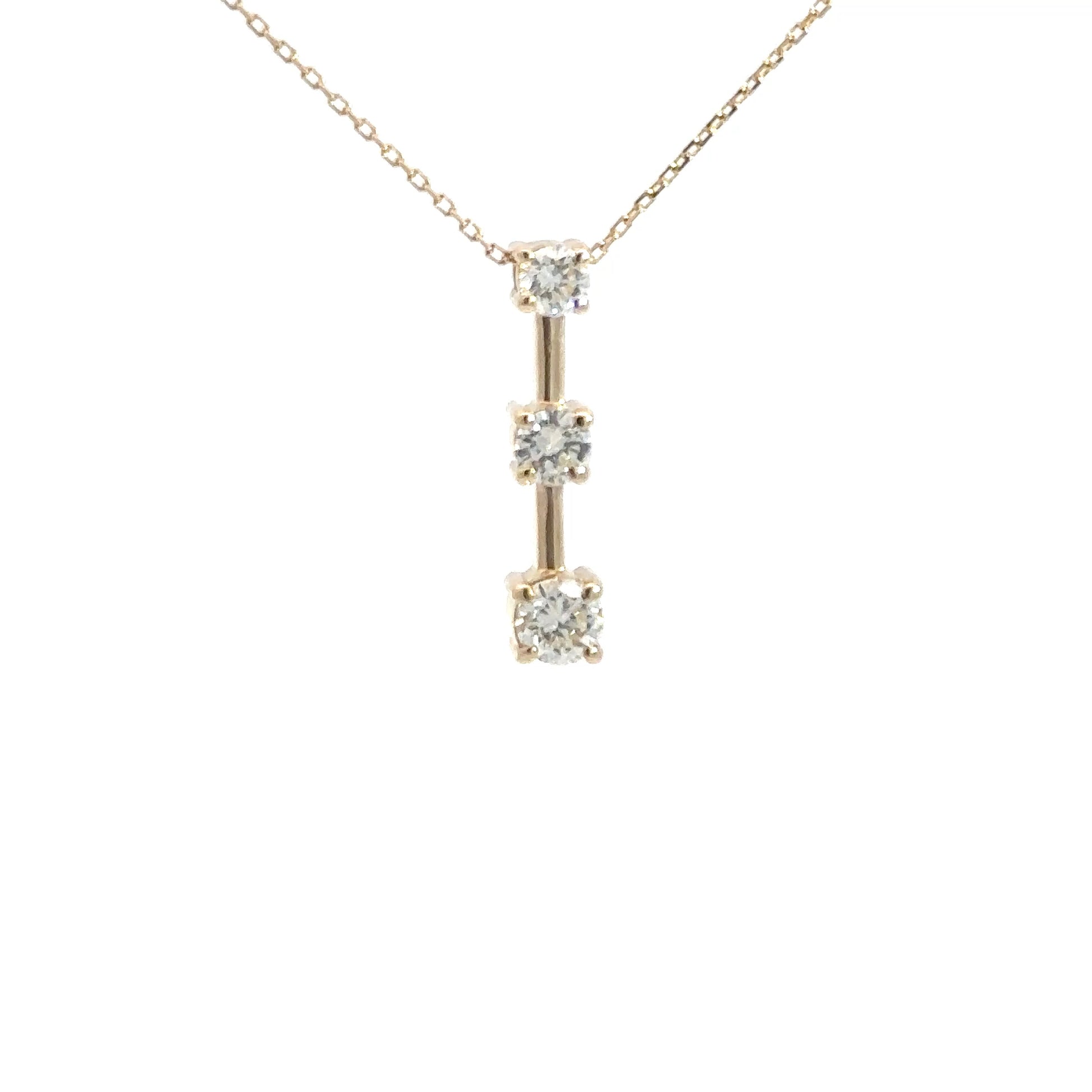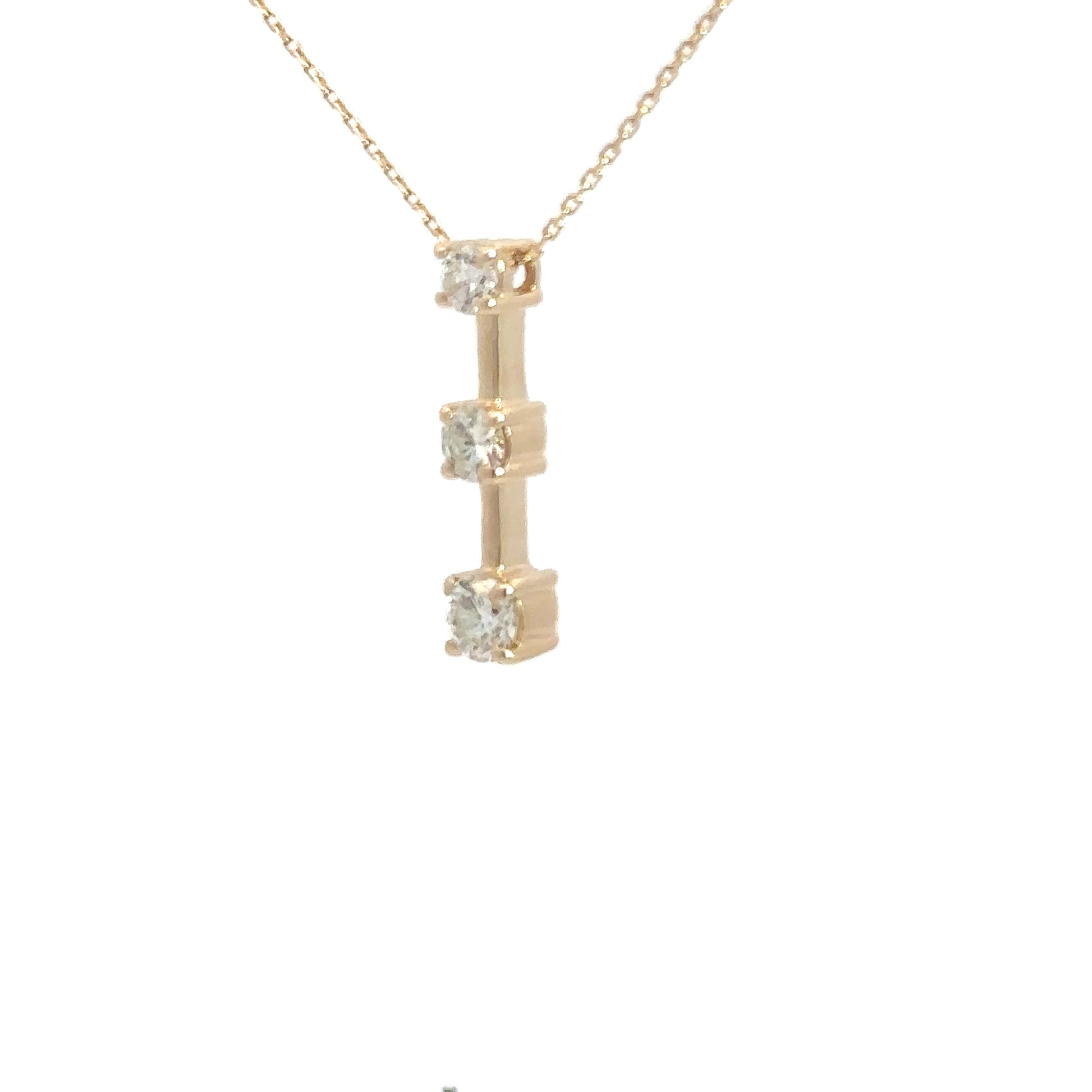 Crafted from 14k yellow gold, this exquisite pendant features three sparkling round brilliant diamonds arranged in a vertical row. The diamonds, ranging from smallest to largest, are separated by elegant gold bars, creating a stunning display. With a total weight of approximately 1cttw, these diamonds boast a clarity of SI3 and a body color of (G-H).