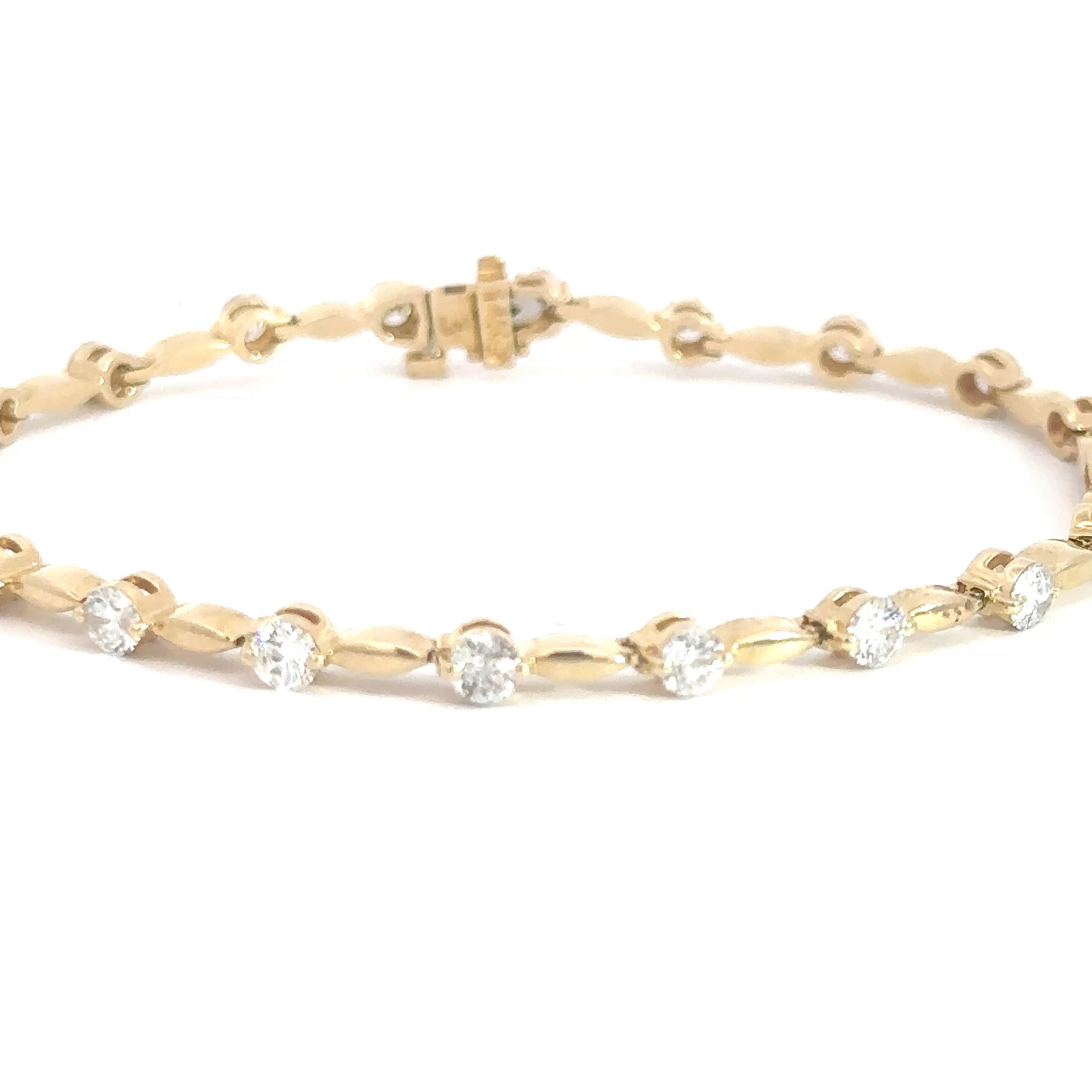 Crafted from 14k yellow gold, this diamond bracelet boasts 20 round brilliant diamonds set within yellow gold links. With a total weight of 2.29cttw, the diamonds exhibit a clarity of SI2 and a body color of (G-H).