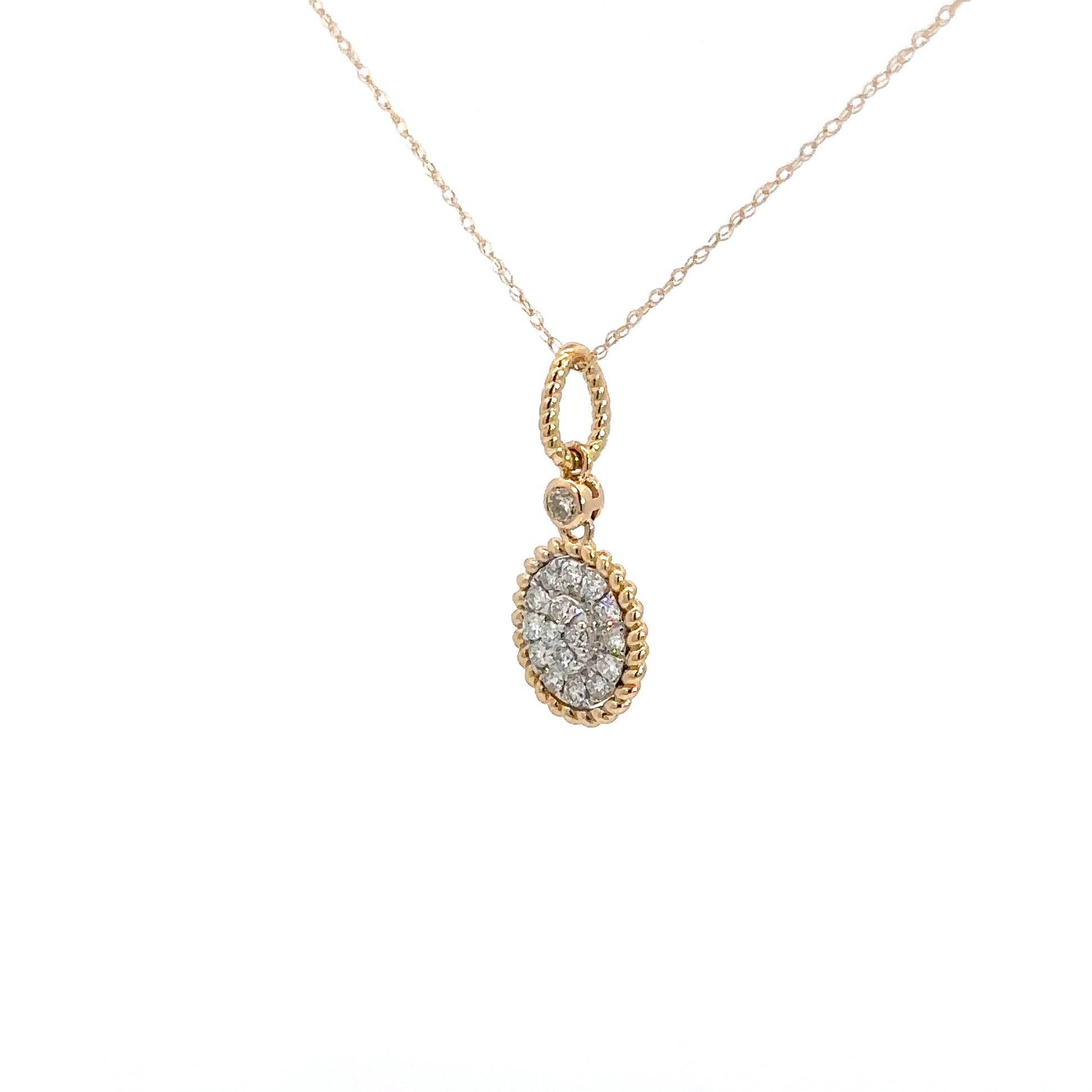 This elegant 14k yellow gold pendant features a stunning oval cluster of 17 round brilliant diamonds, totaling approximately .30 carats. With a clarity of SI2 and a near-colorless G-H grade, each diamond shines brilliantly. The pendant is accented by a delicate yellow gold beaded edge and a bezel-set diamond that links the piece, creating a captivating and refined look. Perfect for adding timeless sparkle to any outfit.