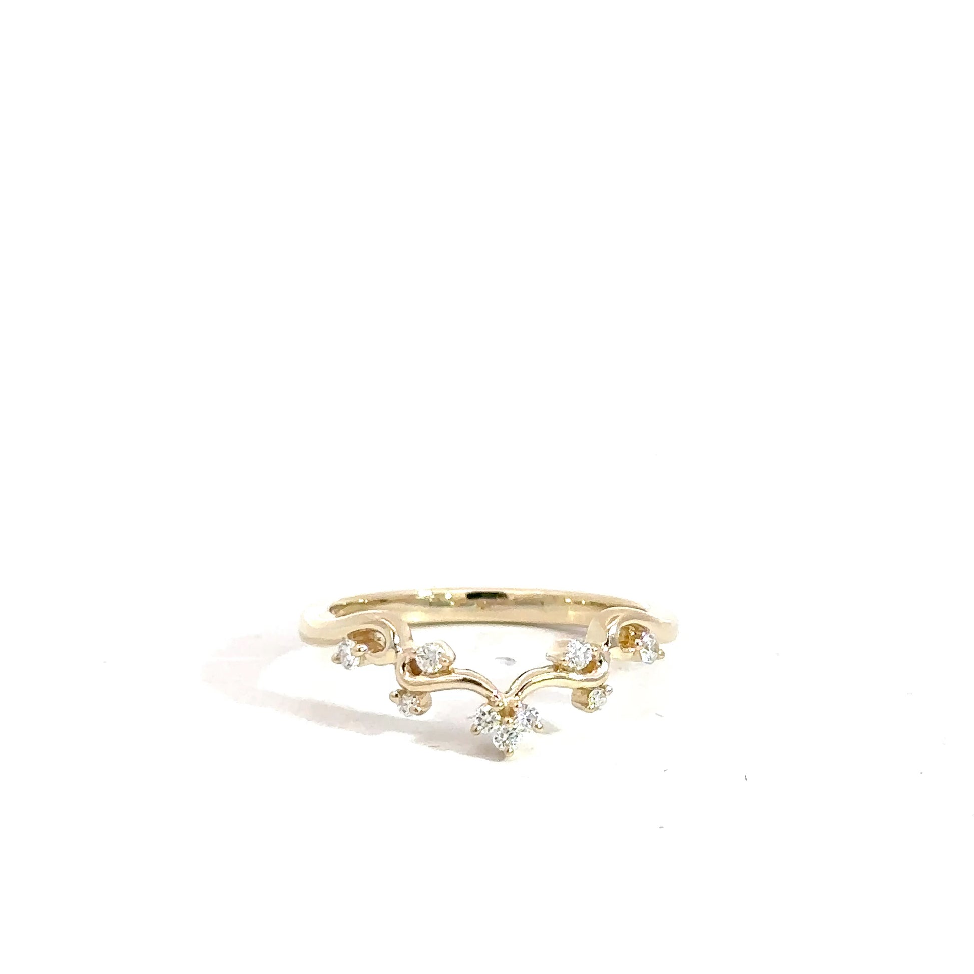 Elegantly curved to complement any engagement ring, this 14k yellow gold contour band features nature-inspired artistry with sparkling round brilliant diamonds. The .12 carat total weight of SI2 clarity diamonds in F-G color creates a sophisticated shimmer that enhances your center stone while adding dimension to your bridal set. A timeless choice for those seeking refined beauty and lasting value.