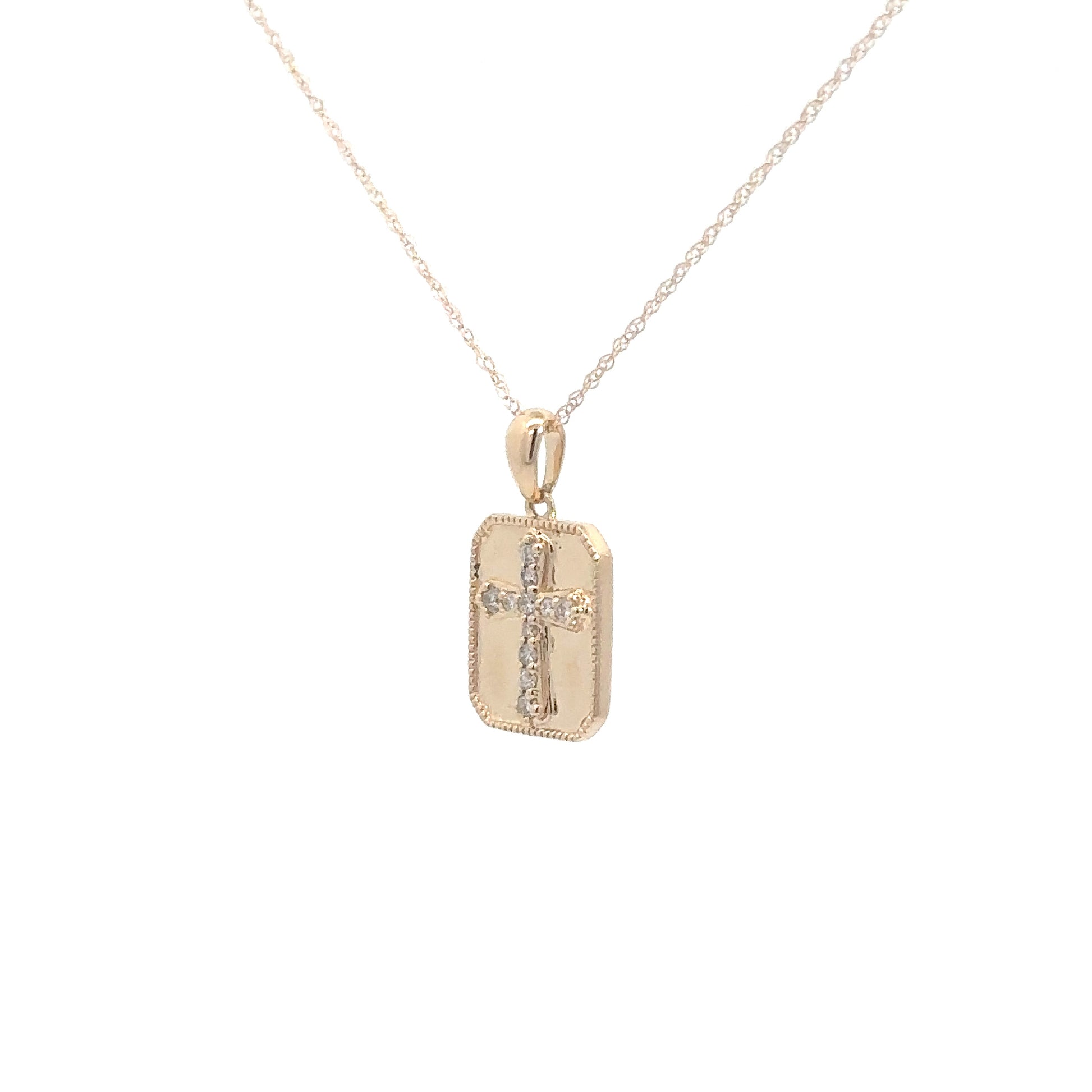 This elegant lady’s 14k yellow gold diamond cross features a dog tag style backing crafted from yellow gold, adorned with round brilliant diamonds arranged in a graceful cross pattern.