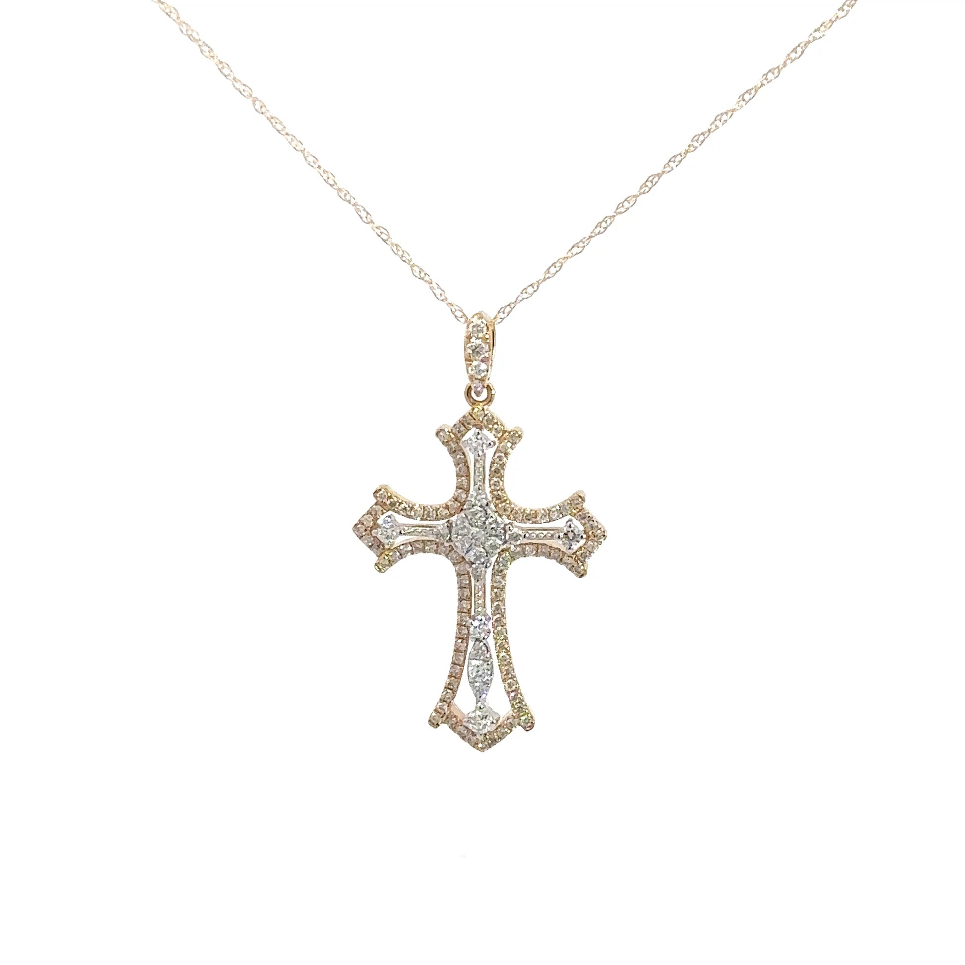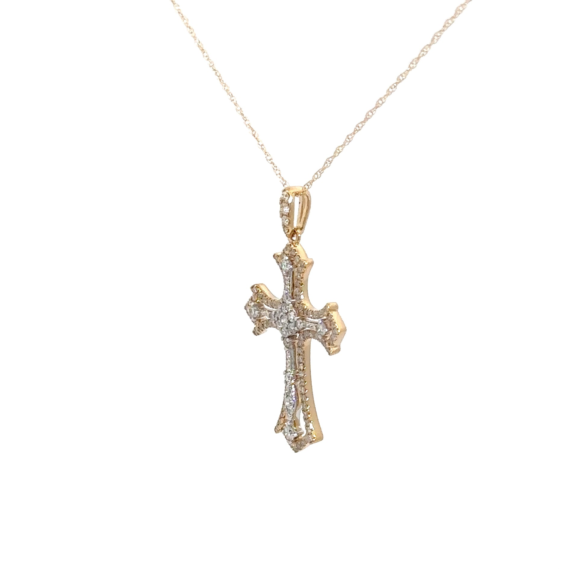 This elegant lady’s 14k yellow gold cross features 111 round brilliant diamonds arranged in a distinctive pattern, totaling approximately .45 carats. Its refined design makes it a timeless and captivating piece.