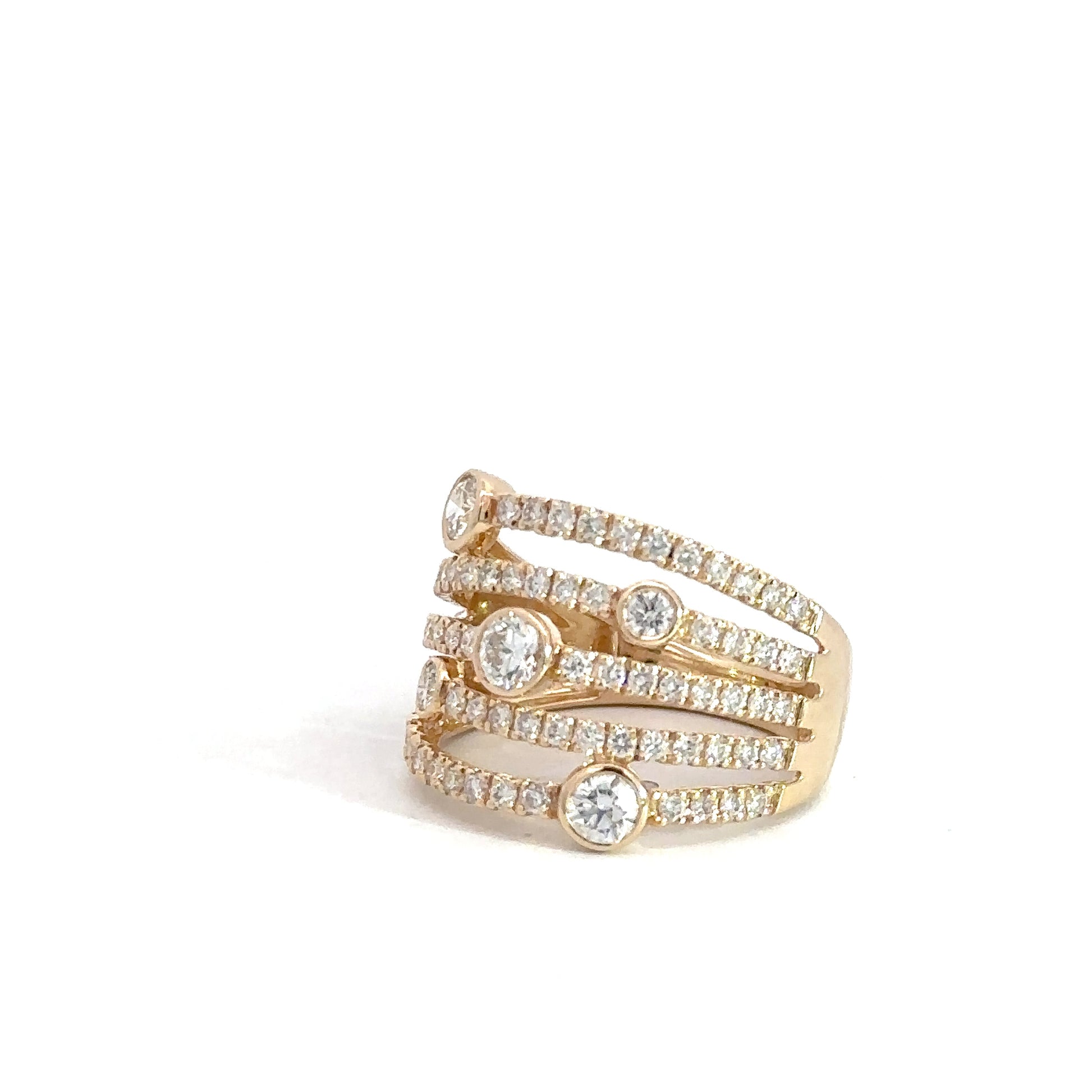 Elevate your jewelry collection with this stunning 14k yellow gold diamond fashion ring, designed to turn heads and spark conversation. Featuring five rows of expertly set diamonds—both bezel and prong settings—this piece delivers maximum sparkle and sophistication. With approximately 1.50 carats of total diamond weight, you'll enjoy brilliant radiance that catches light from every angle. Perfect for special occasions or everyday elegance, this ring combines timeless craftsmanship with contemporary style for a look that's unmistakably luxurious.