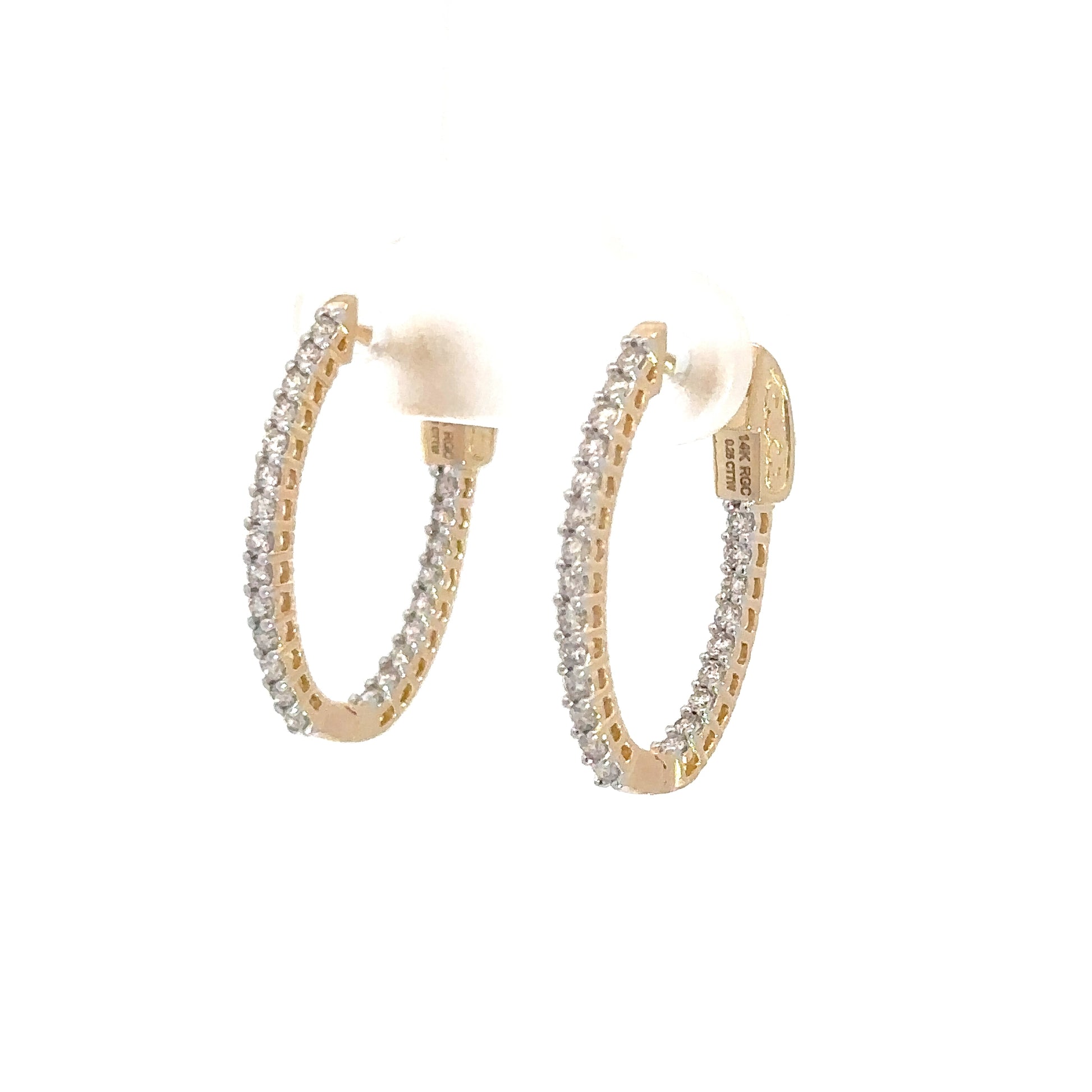 Elevate your jewelry collection with these stunning 14k yellow gold diamond in/out hoops that deliver sparkle from every angle. Featuring round brilliant diamonds positioned both inside and outside the hoop, these earrings create a captivating play of light whether you're facing forward or turning your head. With approximately .50 carats of SI2 clarity diamonds in G-H color, you get genuine brilliance and beauty at an exceptional value. Perfect for everyday elegance or special occasions, these versatile hoops complement any style while making a sophisticated statement.