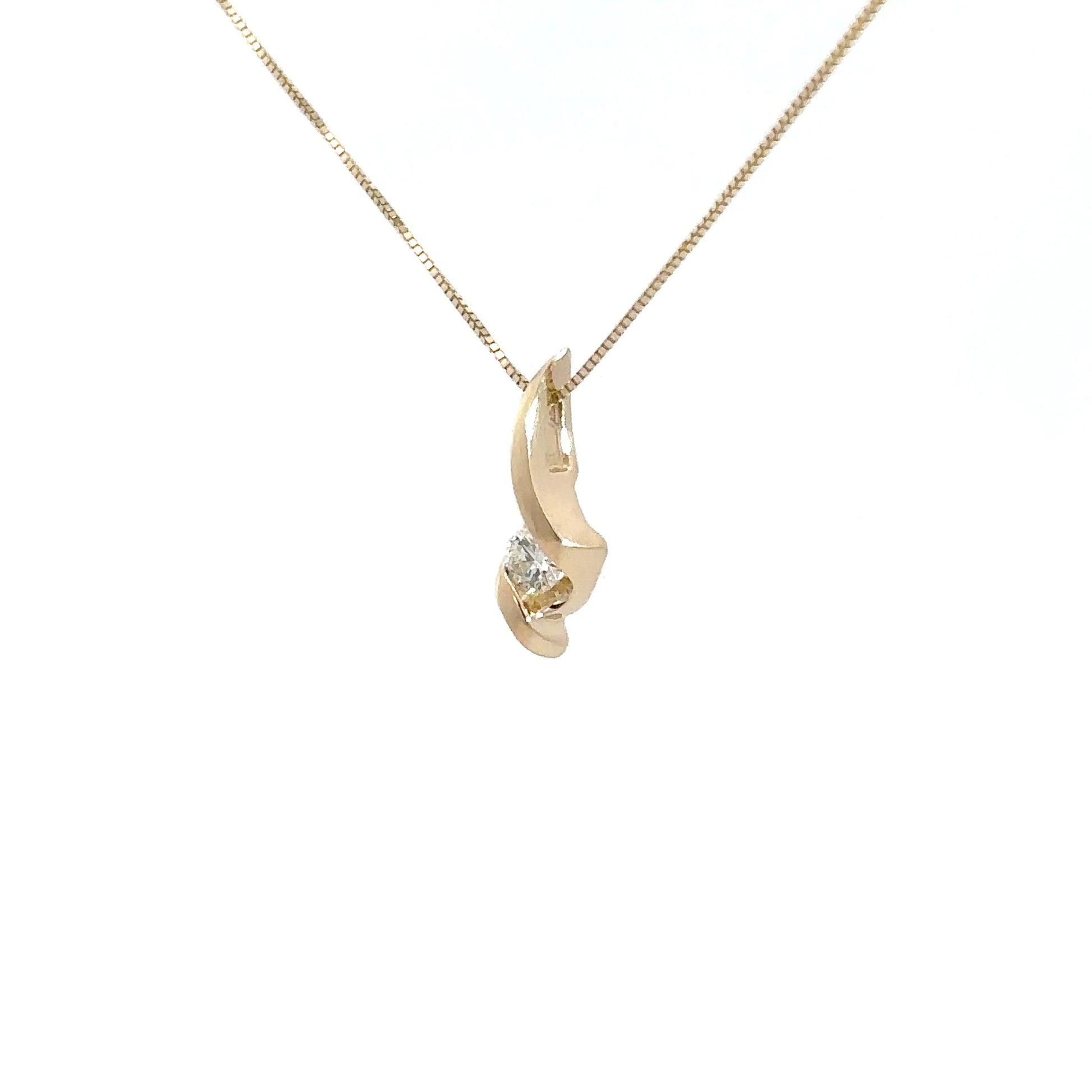Elevate your everyday elegance with this stunning 14k yellow gold diamond pendant. Featuring a radiant round brilliant diamond at its heart, this piece combines timeless sophistication with modern appeal. The carefully crafted yellow gold setting showcases approximately 1/8 carat total weight of diamond brilliance, making it the perfect accessory to complement any occasion—from casual days to special moments. A versatile investment piece that brings understated luxury to your jewelry collection.