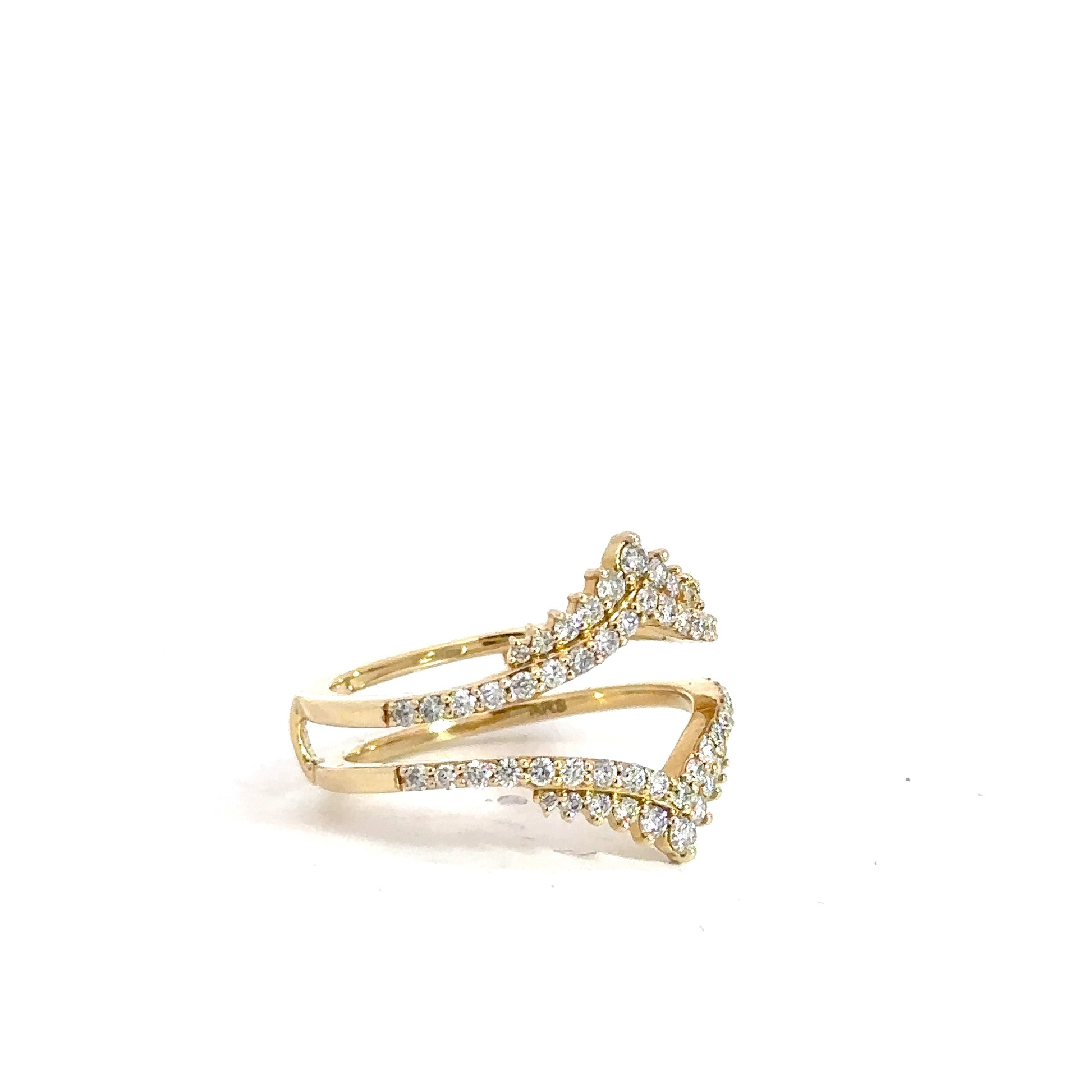 This elegant 14k yellow gold ring jacket features two rows of sparkling round brilliant diamonds arranged in a graceful v shape on each side. With a total diamond weight of approximately .65 carats, it beautifully enhances any ring it accompanies.