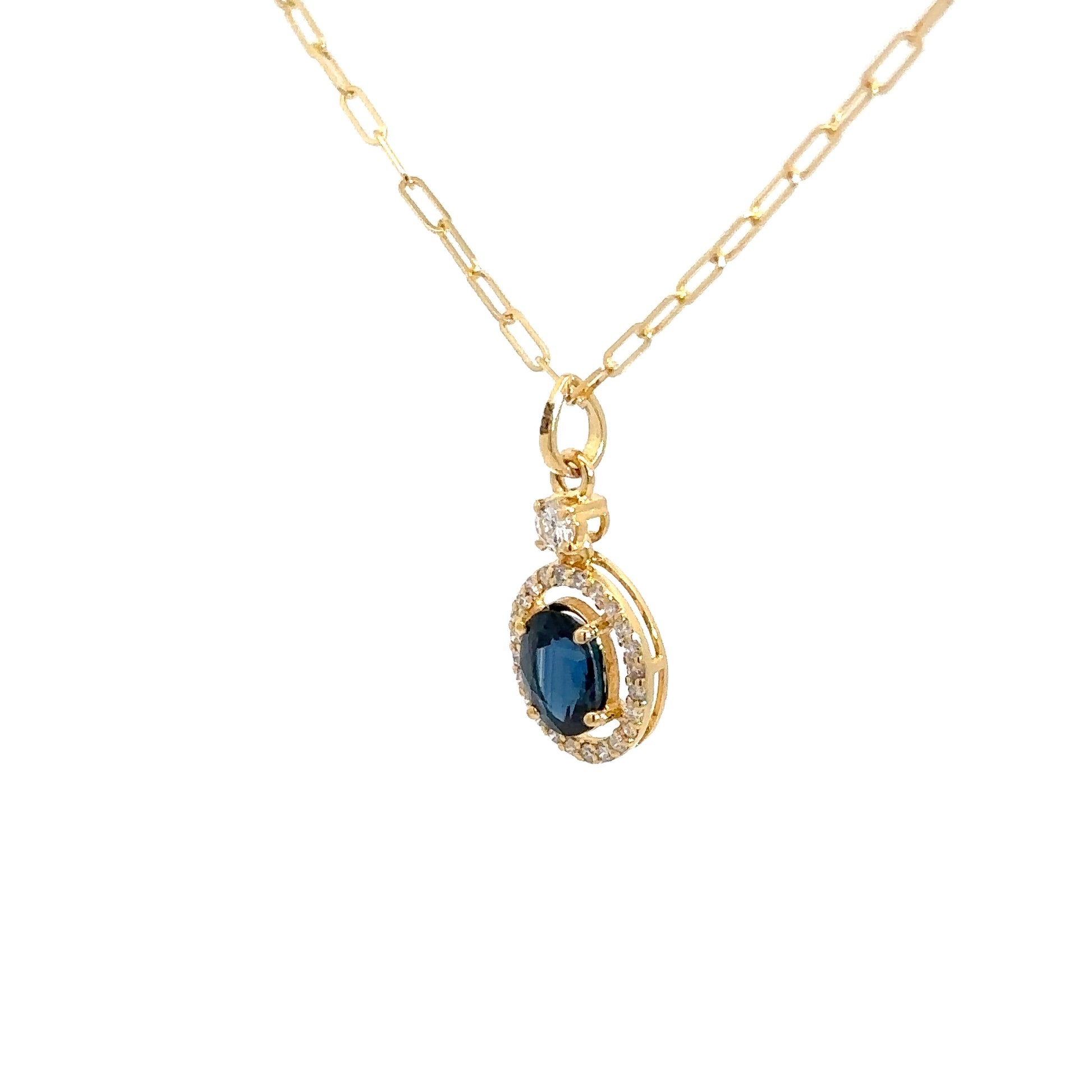 This elegant lady’s pendant features a 14k yellow gold setting with a stunning oval sapphire at its center, encircled by a halo of sparkling round brilliant diamonds. A prong-set diamond connects the pendant to the bail, enhancing its refined design. The piece hangs gracefully from a delicate paperclip chain, making it a timeless addition to any jewelry collection.