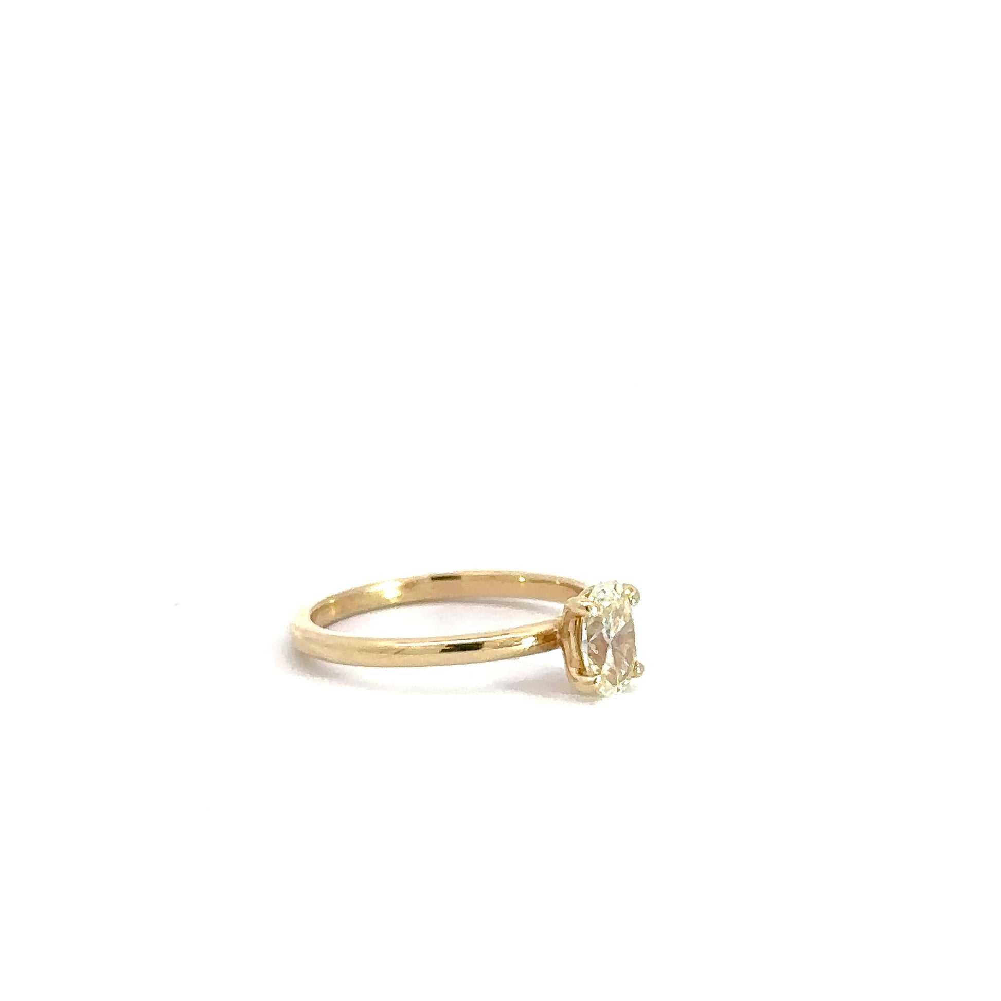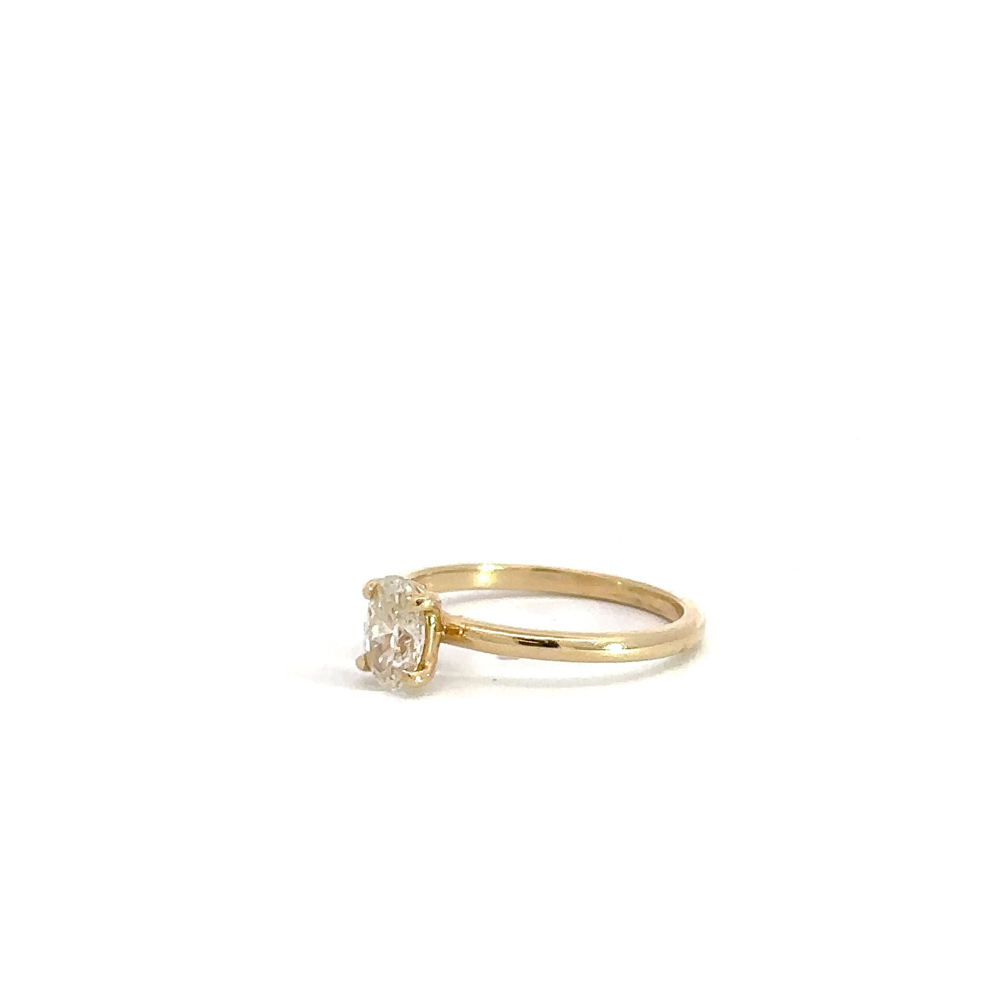 This 14k yellow gold diamond engagement ring features a .66cttw oval diamond with a clarity of SI1 and a body color of J.