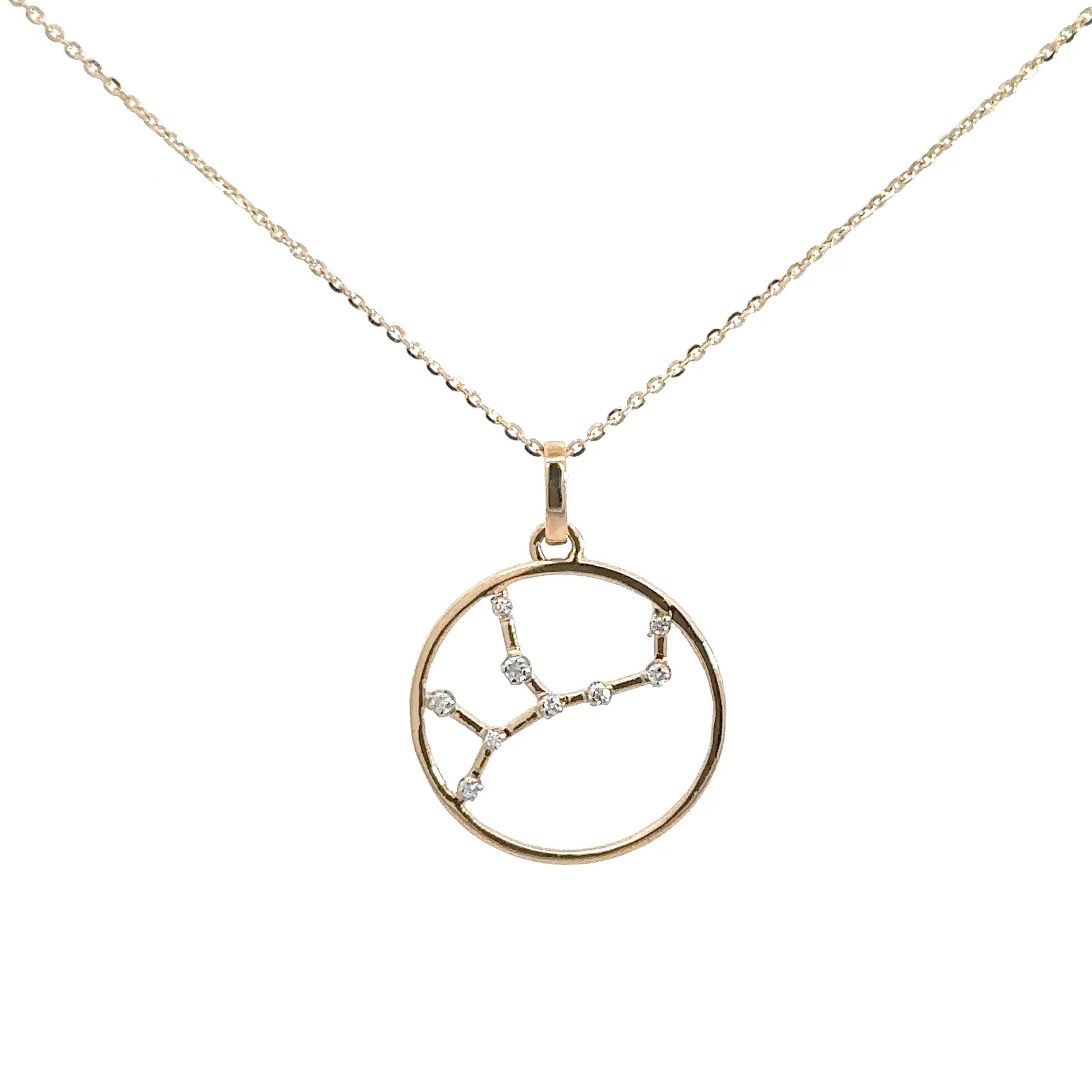 Celebrate your cosmic identity with this stunning 14k yellow gold pendant featuring the Aquarius constellation. Nine sparkling round brilliant diamonds map out your zodiac sign in celestial elegance, totaling approximately .08 carats. Perfect for astrology enthusiasts or as a meaningful gift, this piece combines timeless gold craftsmanship with personalized symbolism. A sophisticated way to wear your sign close to your heart.