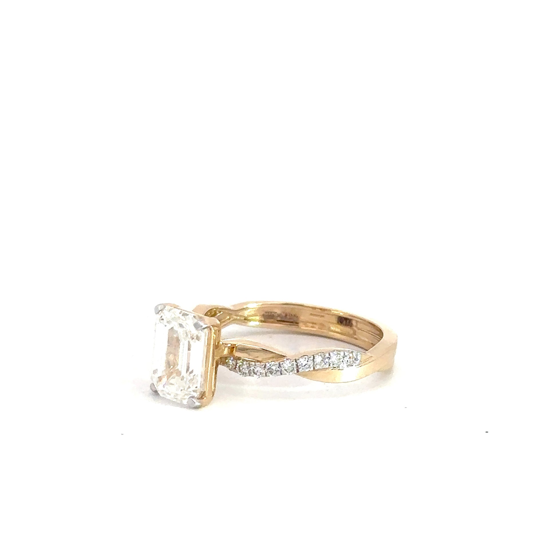 This elegant 14k yellow gold engagement ring features a stunning emerald cut lab-grown diamond at its center. Surrounding the main stone, sparkling round brilliant lab-grown diamonds gracefully twist alongside a sleek band. Together, these diamonds provide an impressive total weight of approximately 2.23 carats, offering timeless beauty and ethical brilliance.