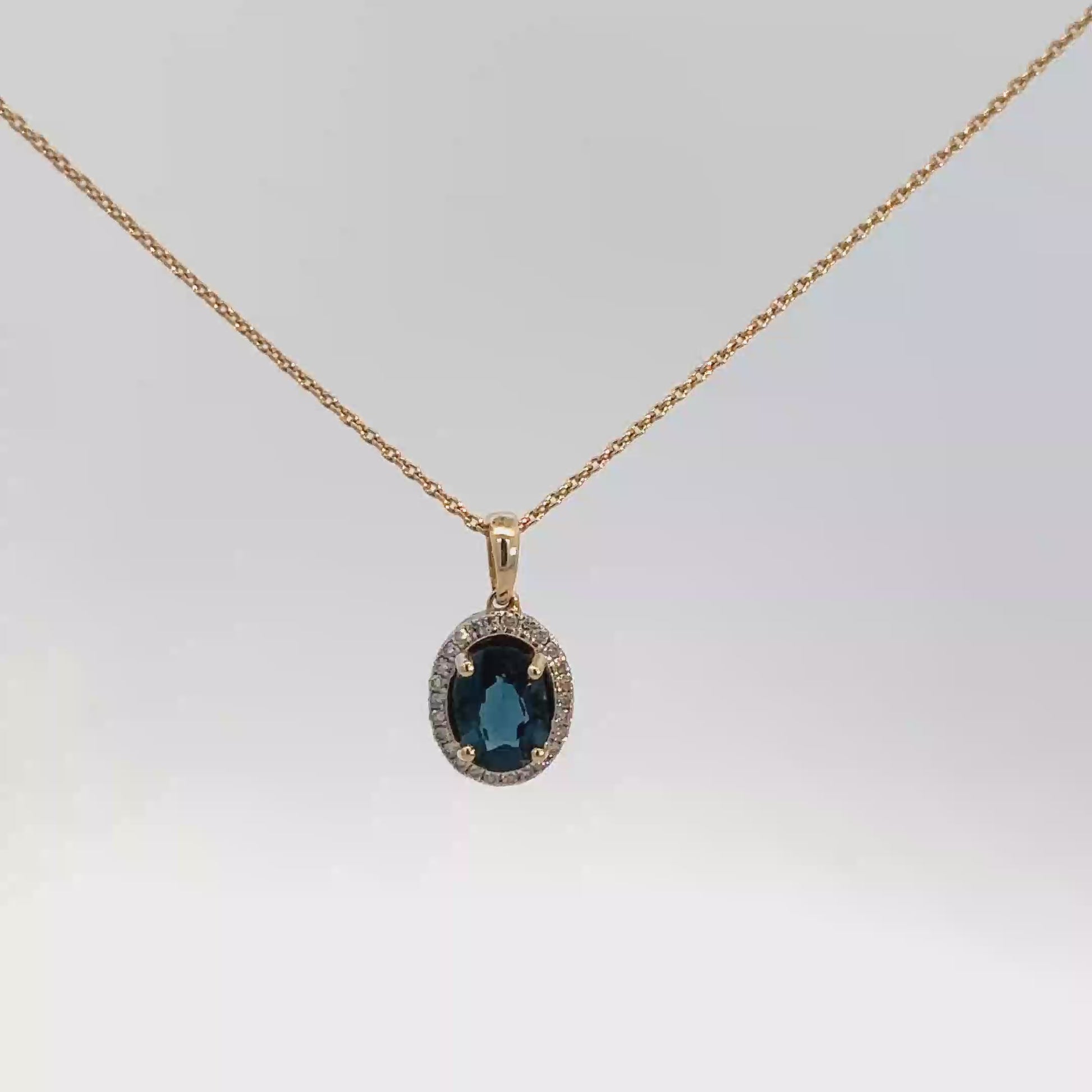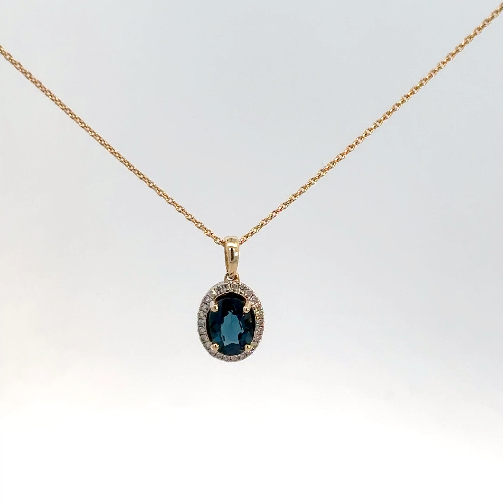 Indulge in the luxurious elegance of this 14k yellow gold pendant featuring a 8x6mm oval-shaped london blue topaz enveloped in a halo of sparkling diamonds, totaling approximately .12cttw. Elevate your style with this exquisite piece, reminiscent of art and fashion.