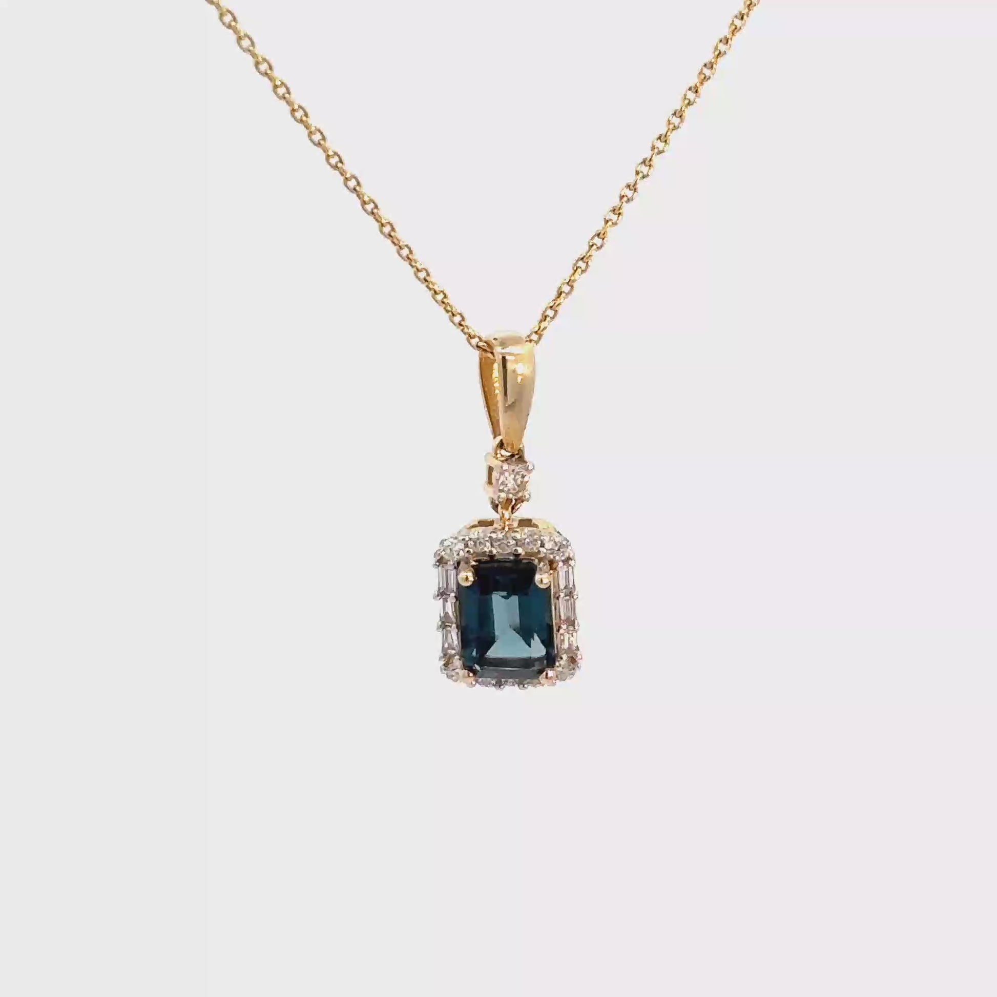 This 14k yellow gold pendant showcases a 7x5mm emerald cut London Blue Topaz with a surrounding diamond halo. The halo consists of round brilliant and baguette diamonds that connect to a central round diamond at the bail. The diamonds have a total weight of approximately 1/4cttw with a clarity of SI and a body color of (F-G).