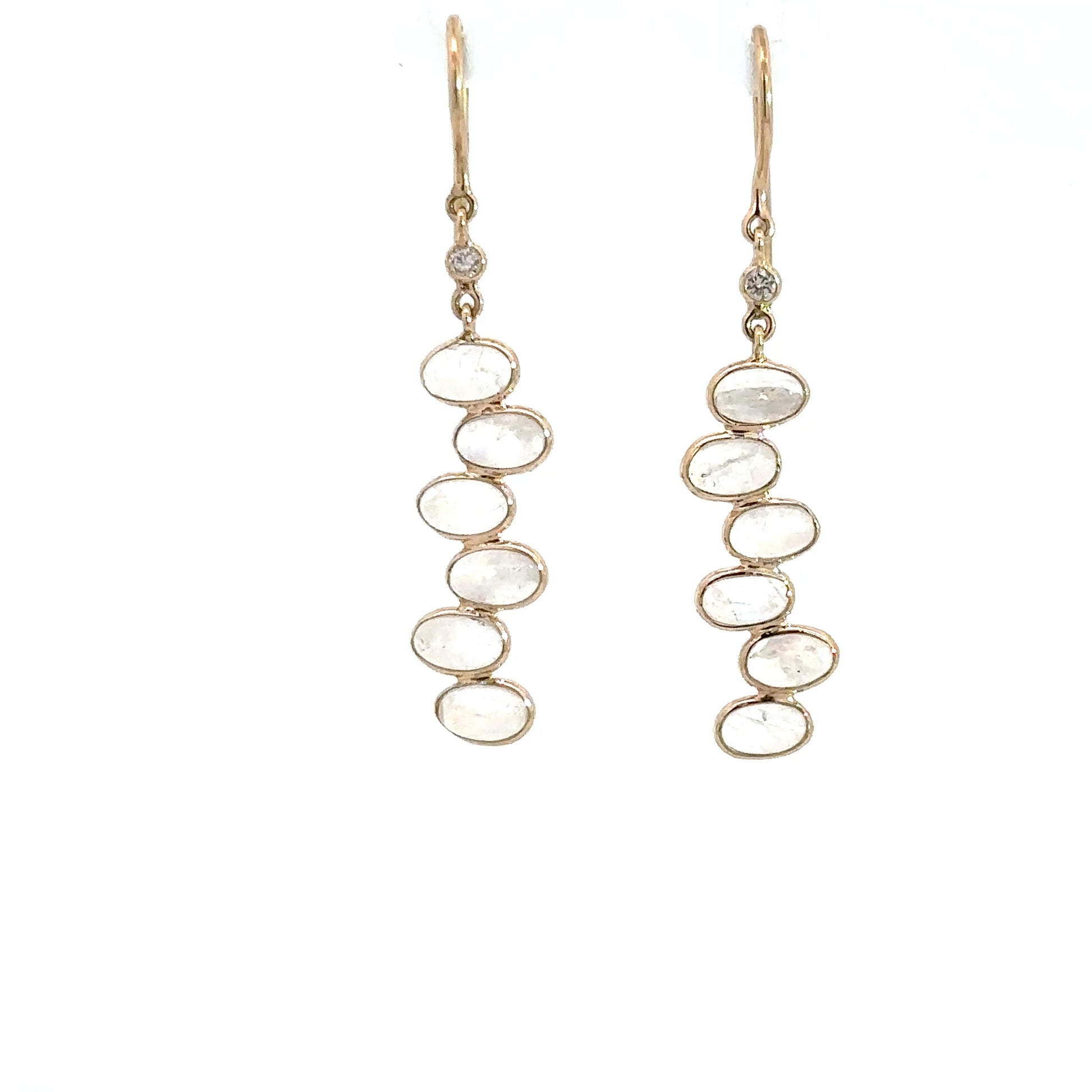 Elegant 14k yellow gold dangle earrings featuring multiple bezel-set moonstones, designed to captivate and enhance any look.