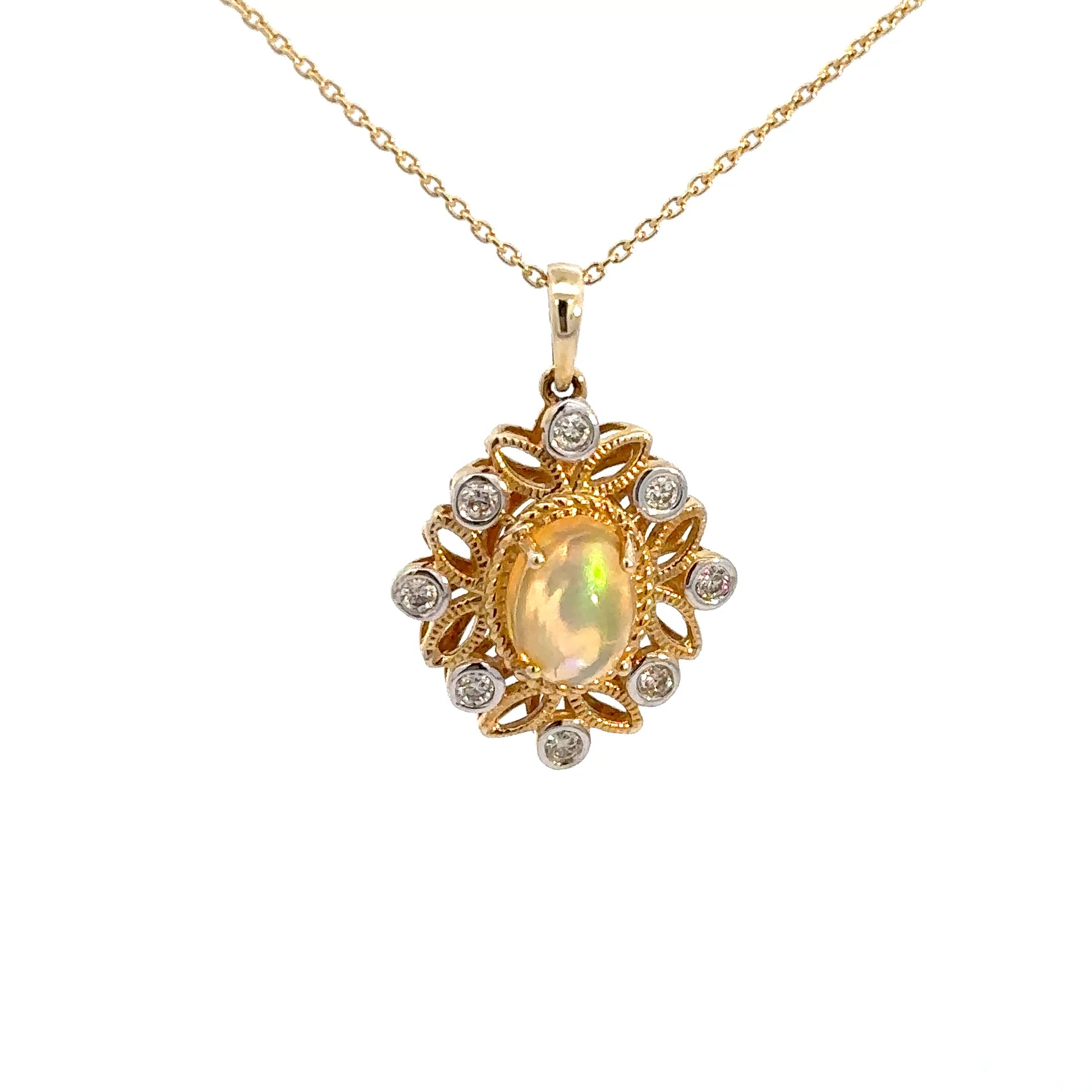 This stunning oval opal pendant necklace features a beautifully crafted design that captures the light with every movement. The centerpiece is an exquisite 8x8mm opal surrounded by sparkling diamonds. The diamonds have an approximate total weight of .13cttw that are bezel set. All of this is encased in a delicate yellow gold frame.