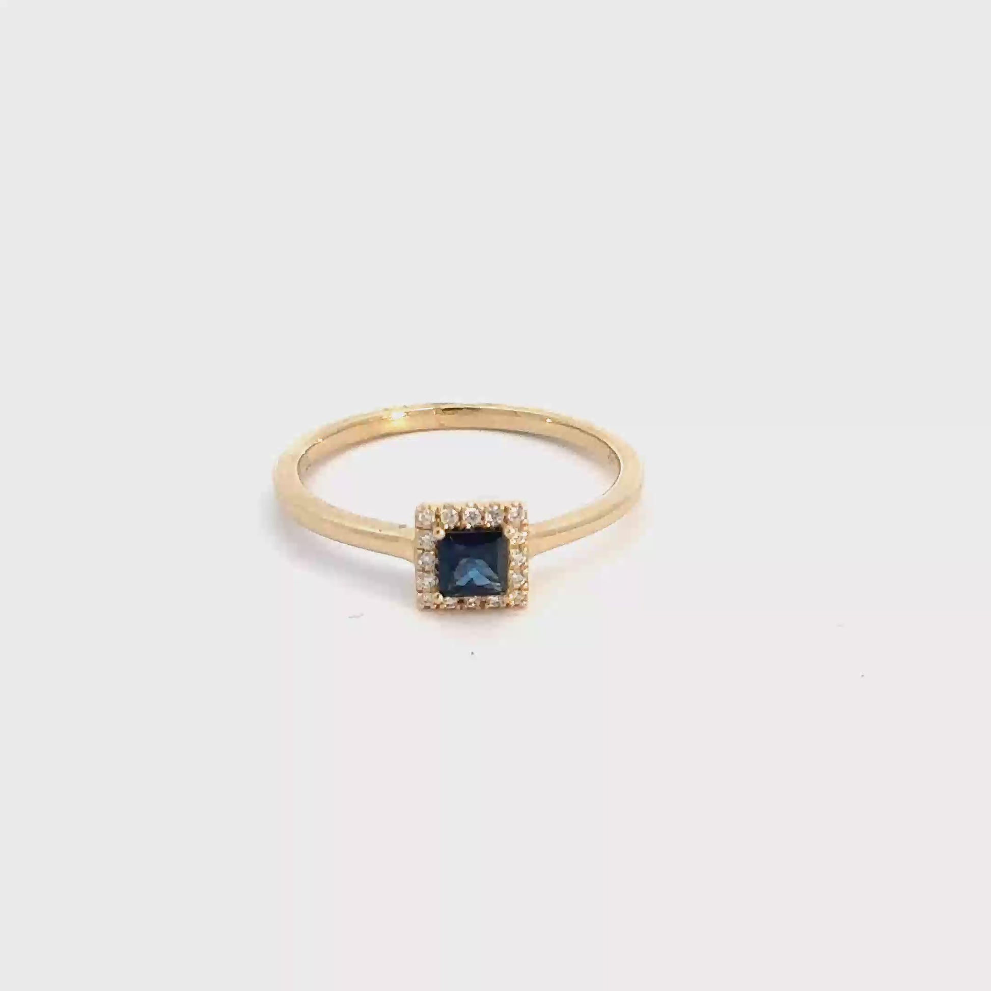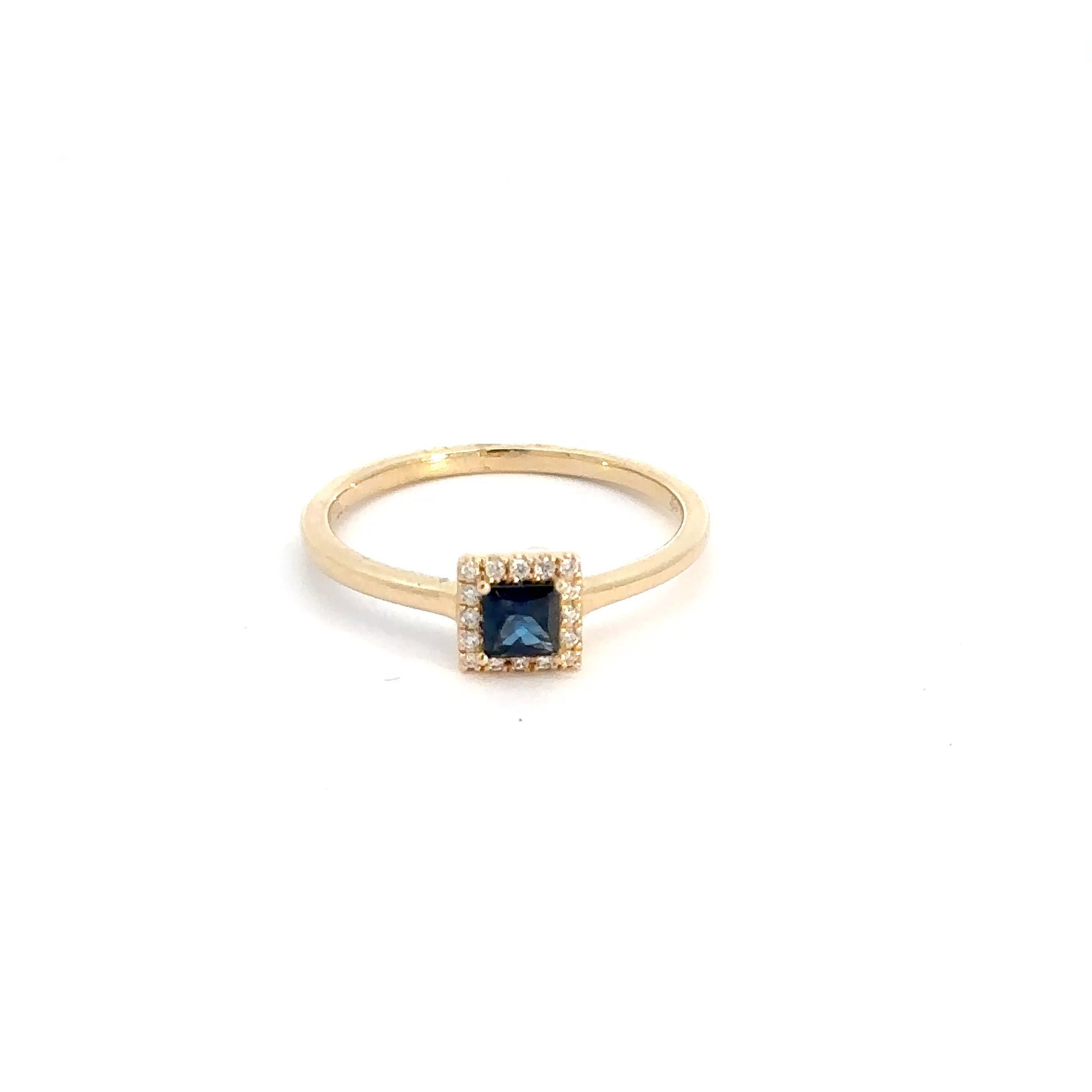Crafted from 14k yellow gold, this exquisite ring boasts a princess cut sapphire surrounded by a halo of stunning round brilliant diamonds. With a total weight of approximately .05cttw, the diamonds add a touch of brilliance to this regal piece.