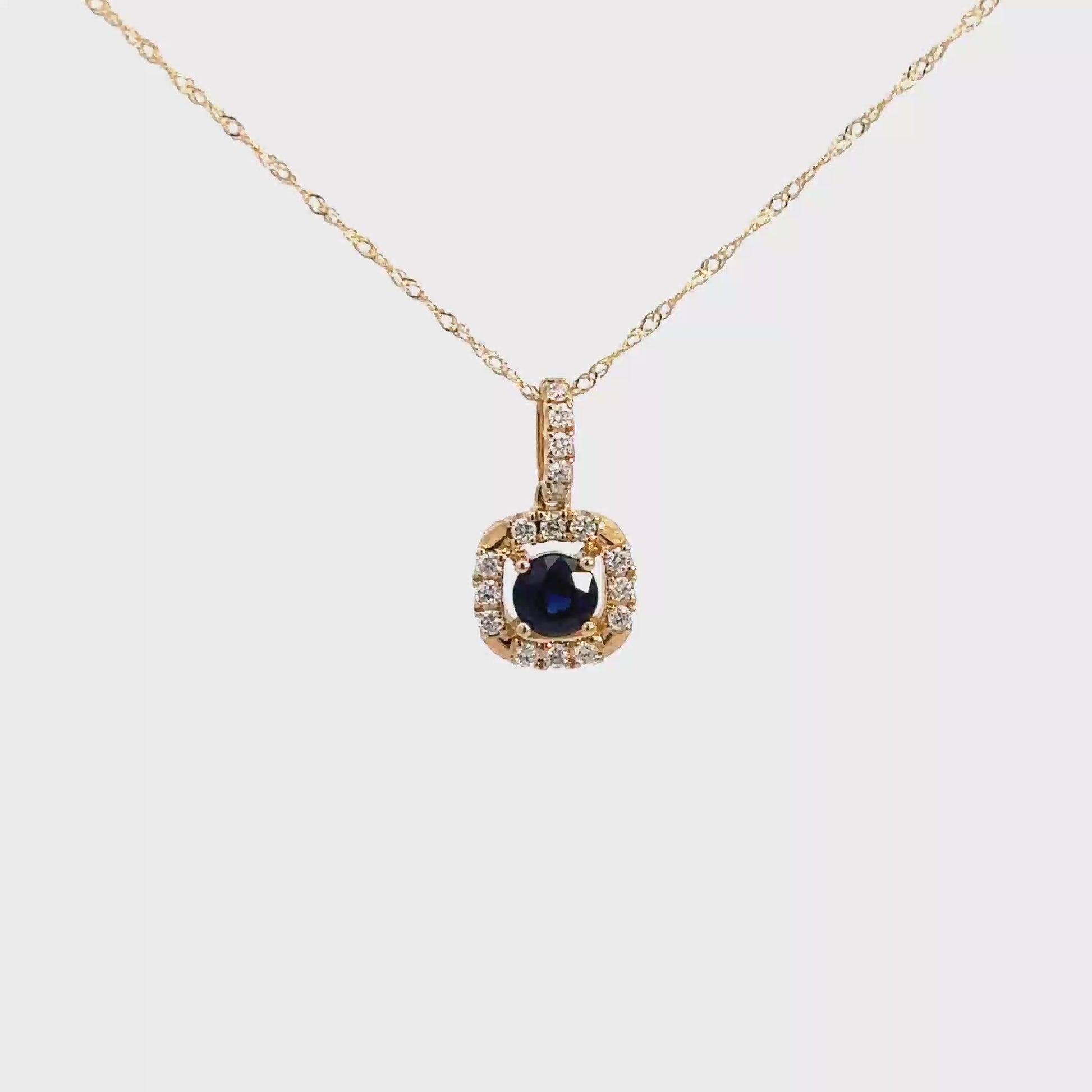 This pendant features a round sapphire at its center, encircled by 17 round brilliant diamonds. The bail also contains diamonds, with a total weight of approximately .17cttw. These diamonds have a clarity of SI1-SI2 and a body color of (G-H). Made of 14k yellow gold, this is a stunning piece of jewelry.