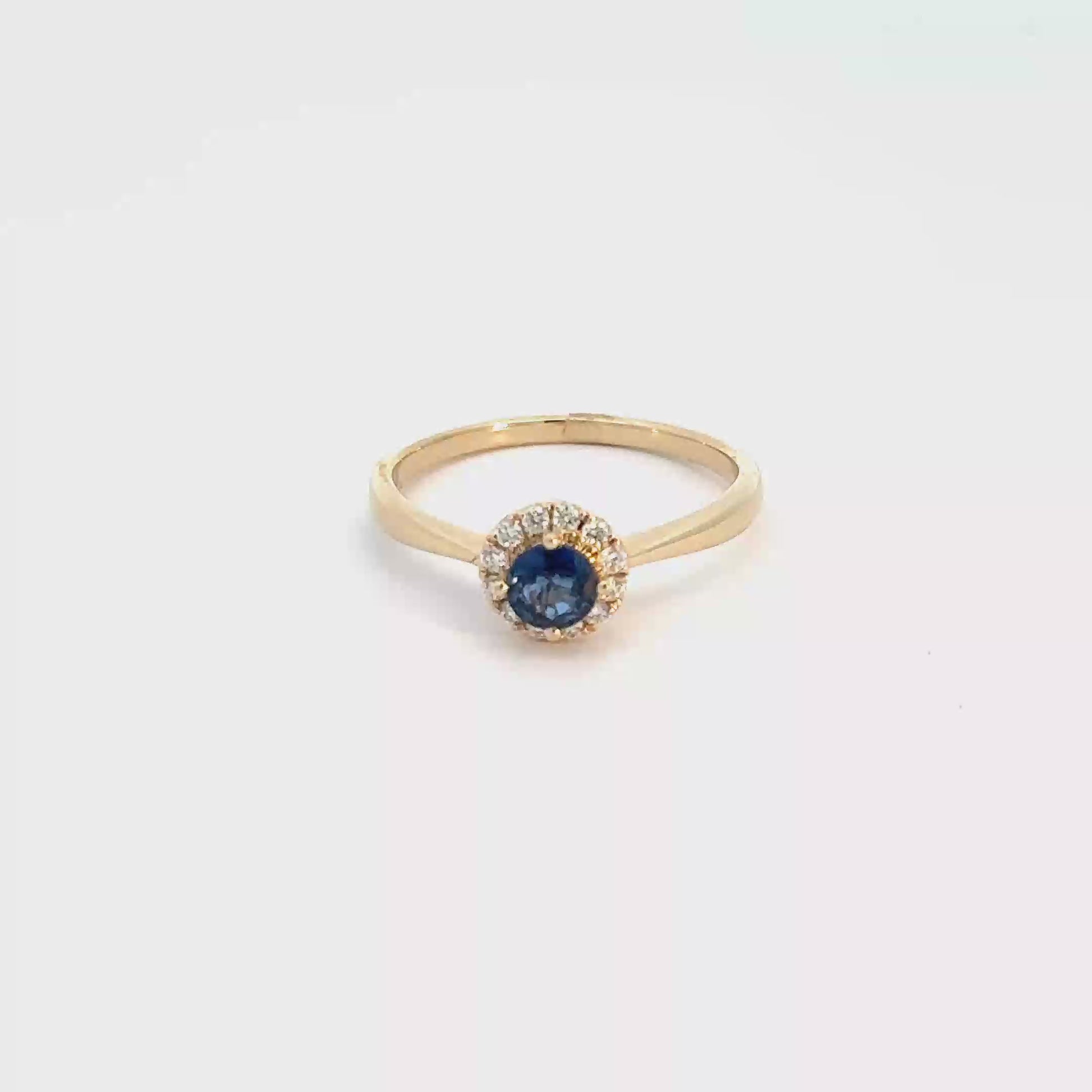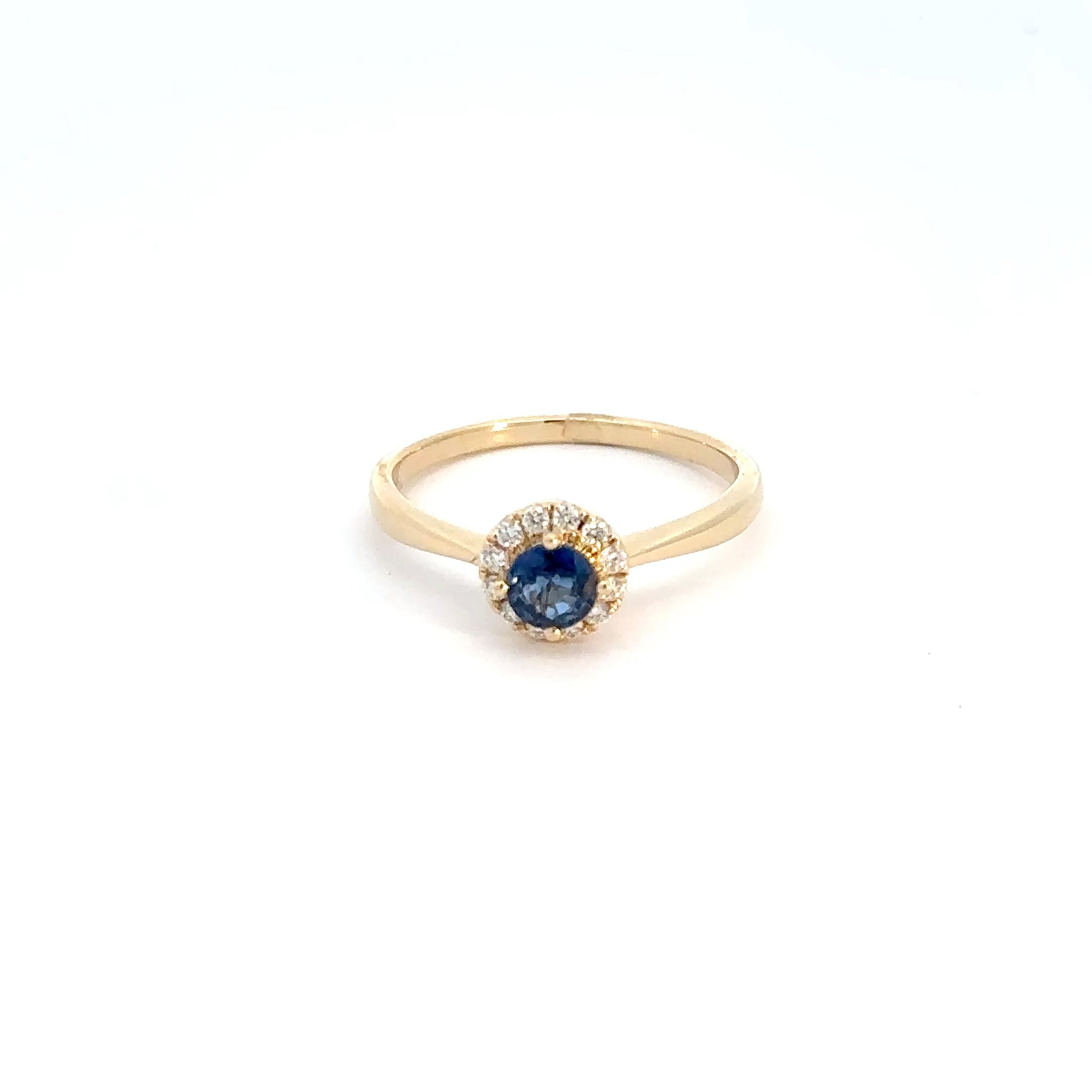 This 14k yellow gold sapphire and diamond ring features a round sapphire with an approximate weight of .42ct, accented by 12 round brilliant diamonds weighing approximately .10ct in total.