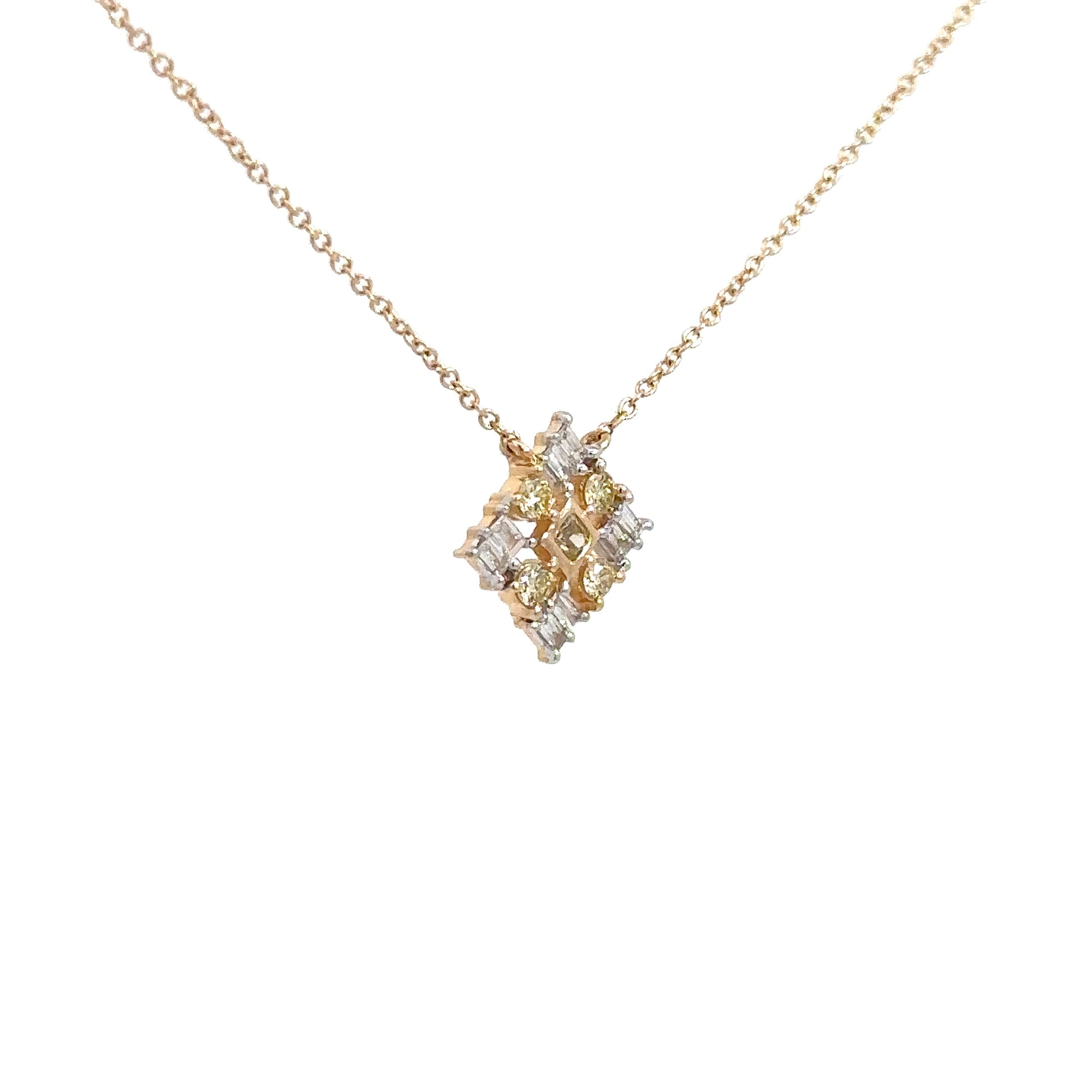 This elegant 14k yellow gold pendant features a square design adorned with a mix of white baguette diamonds and vibrant yellow round brilliant diamonds. At the center sits a stunning princess-cut yellow diamond, creating a distinctive and eye-catching look. The combined diamond weight is approximately .50 carats, adding a touch of brilliance and color to any outfit.