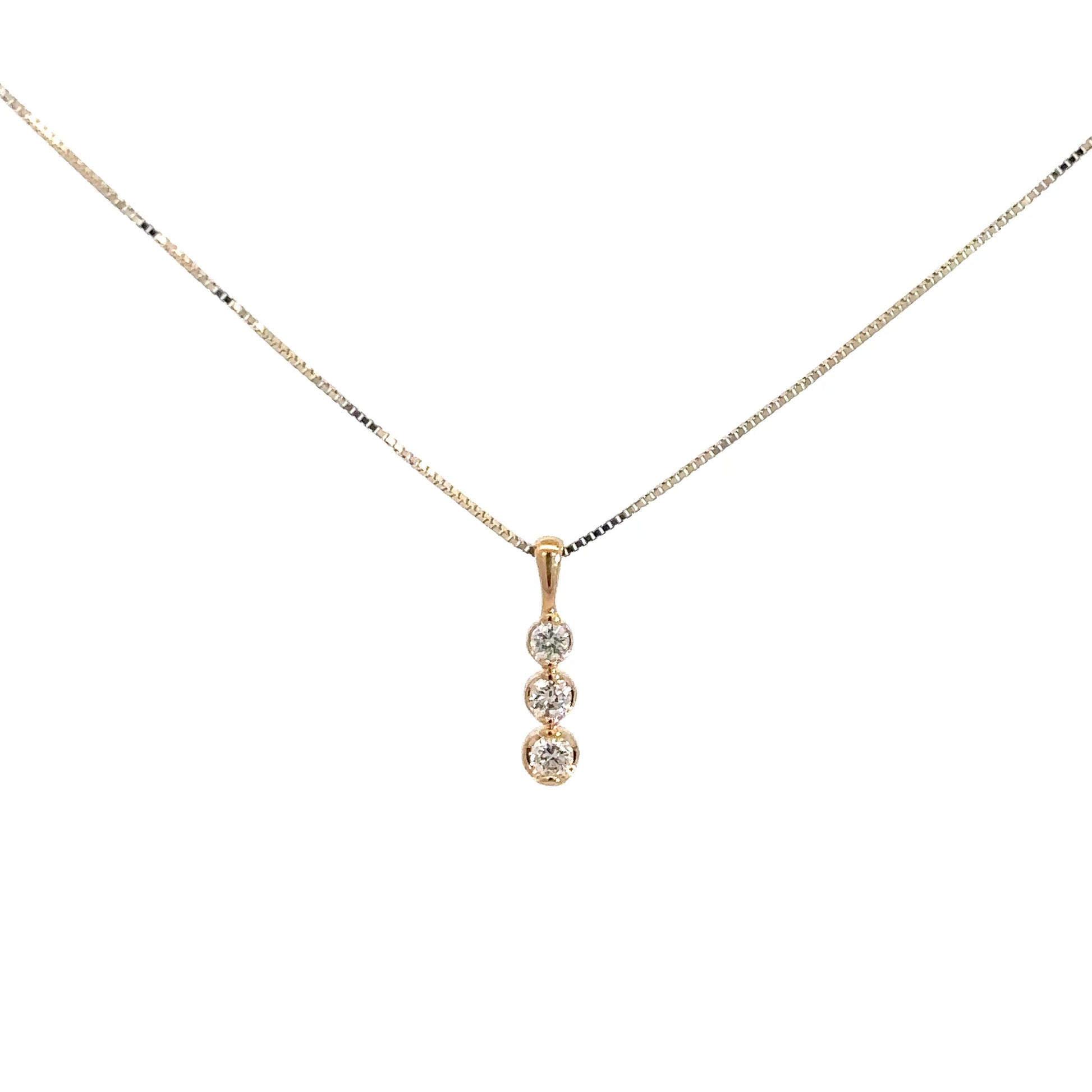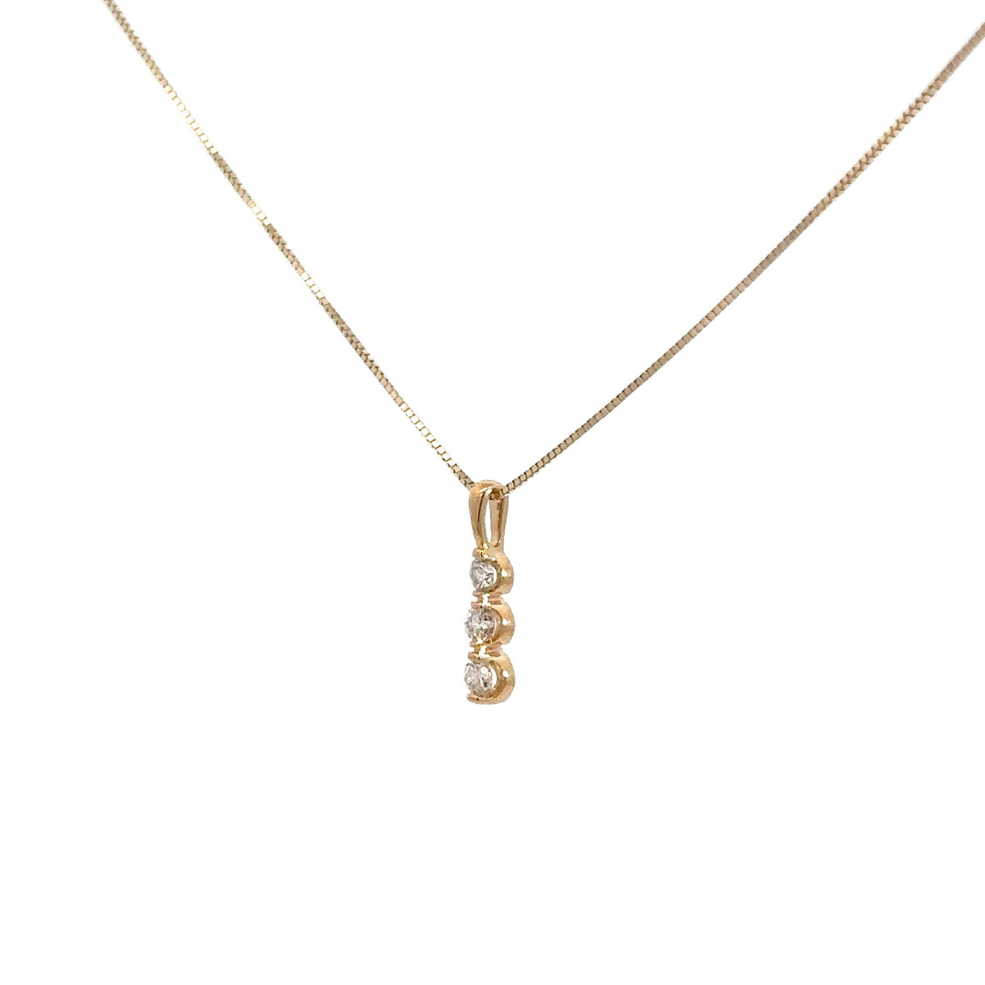 Elevate your everyday elegance with this stunning 14k yellow gold pendant featuring three radiant round brilliant diamonds. The vertical arrangement showcases approximately 1/8 carat total weight of sparkling diamonds, creating a refined silhouette that catches light beautifully. Perfect for layering or wearing solo, this timeless piece combines classic design with sophisticated appeal—a versatile addition to any jewelry collection that works for both special occasions and cherished daily wear.