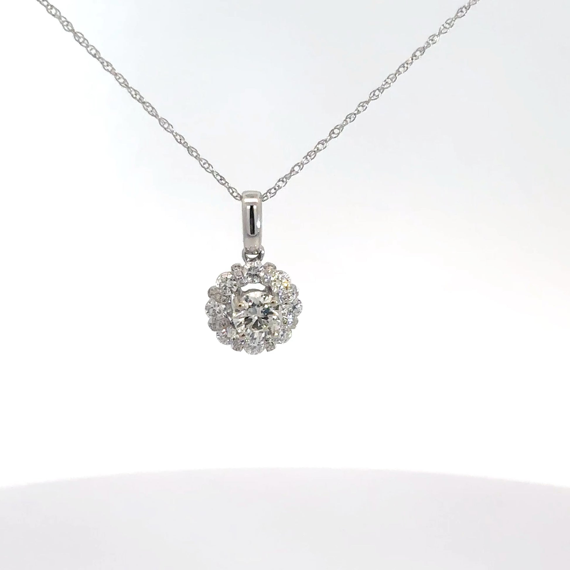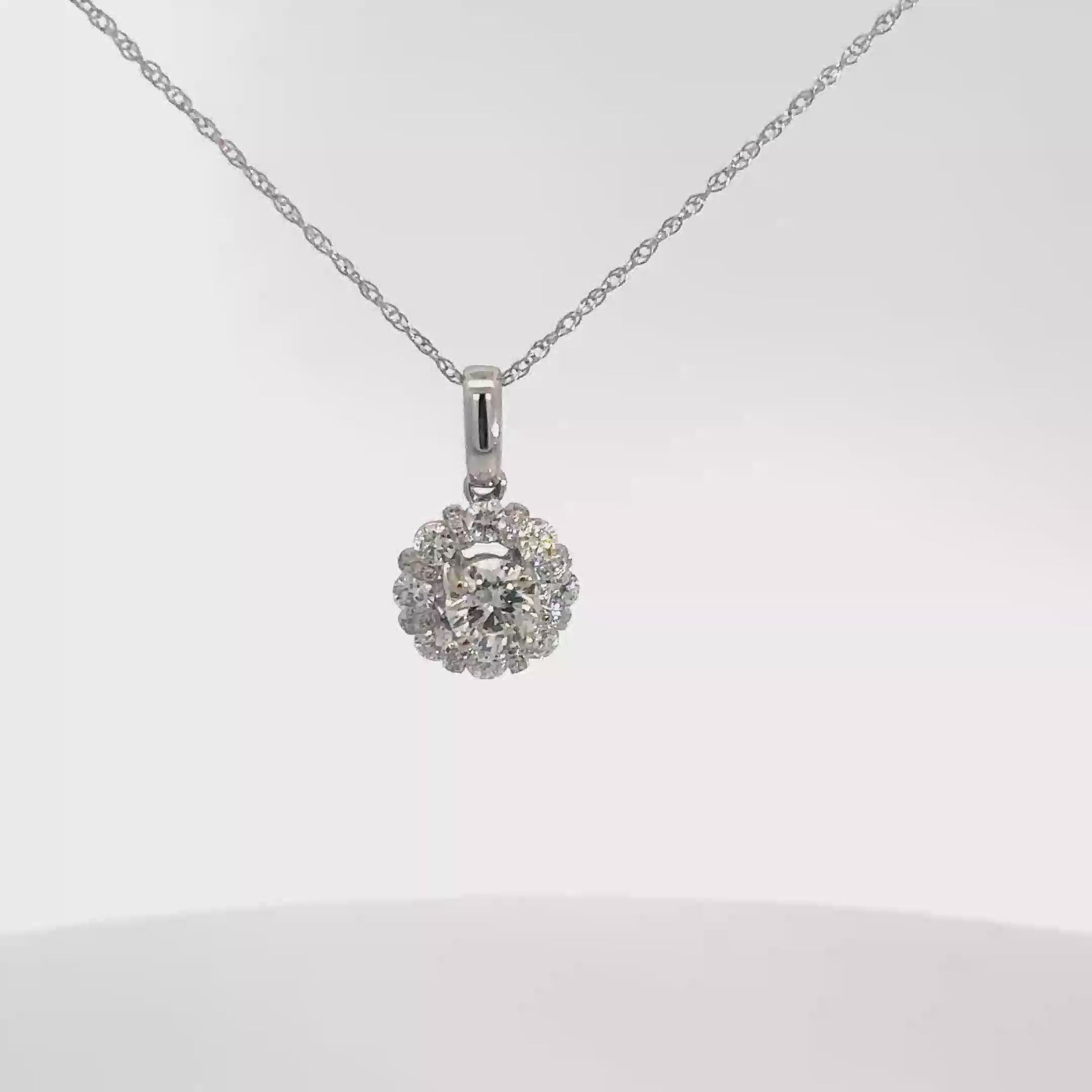 This 18k white gold diamond pendant features a round brilliant diamond center with an approximate total weight of .50cttw. The diamond has a clarity of I1 and a body color of (G-H). There is also a surrounding round brilliant diamond halo with an approximate total weight of 3/8cttw. The diamonds in the halo have a clarity of SI1 and a body color of (G-H).