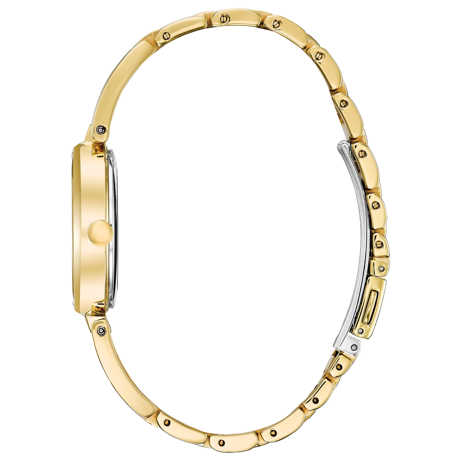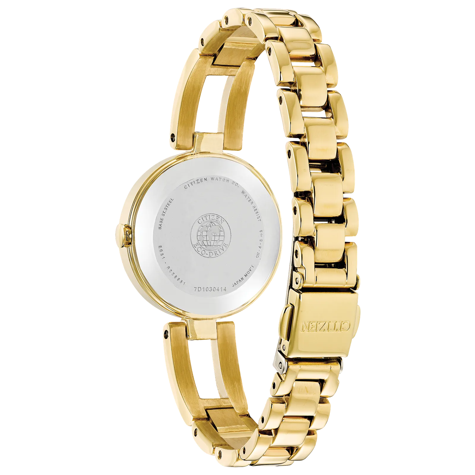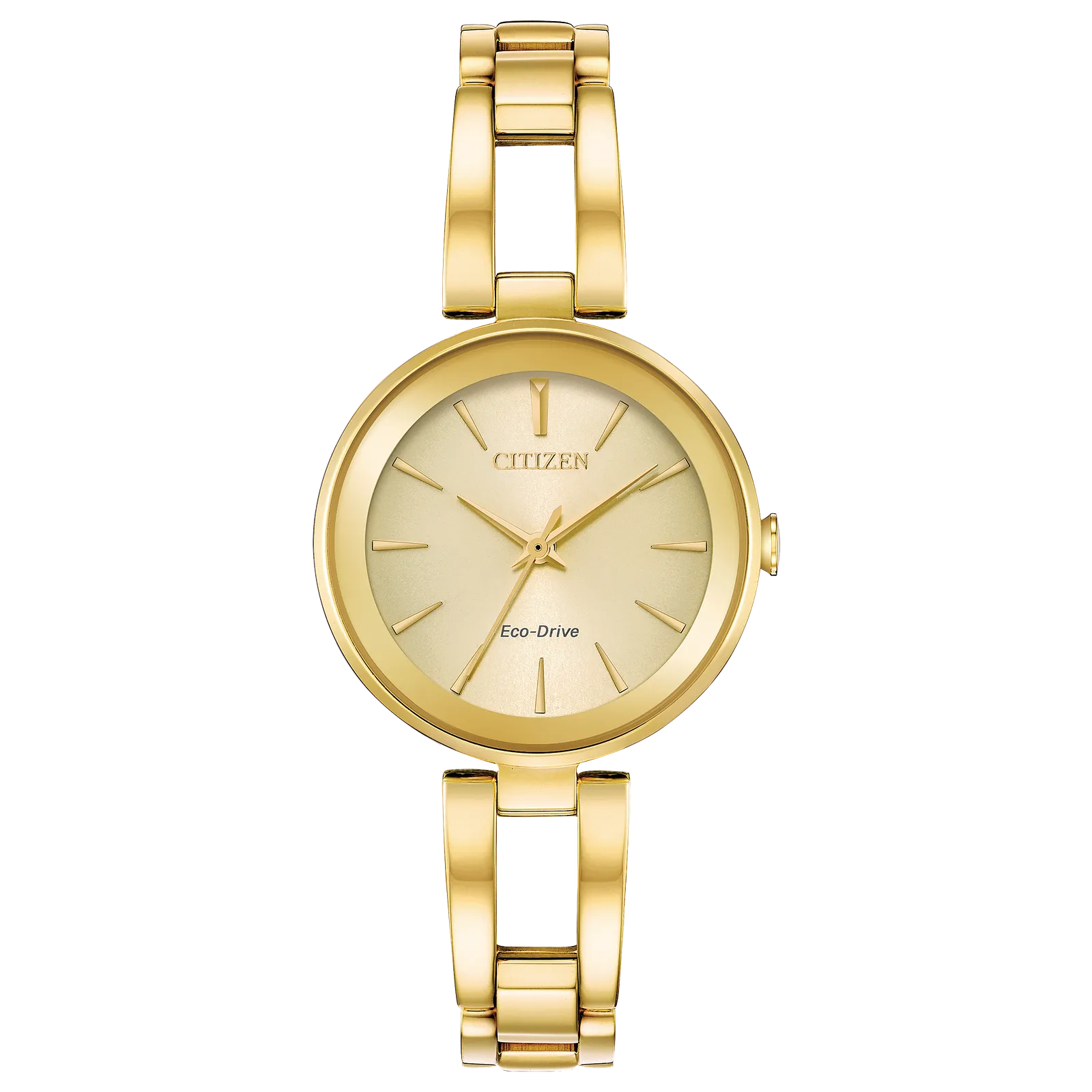 Axiom's refined yet sleek design offers a day-to-night fashion option with edge-to-edge glass design for the modern trendsetter. This timepiece, with Eco-Drive technology, features with ladies' gold-tone stainless steel case and bracelet with complementing champagne dial. Featuring our Eco-Drive technology – powered by light, any light. Never needs a battery. Caliber number E031.