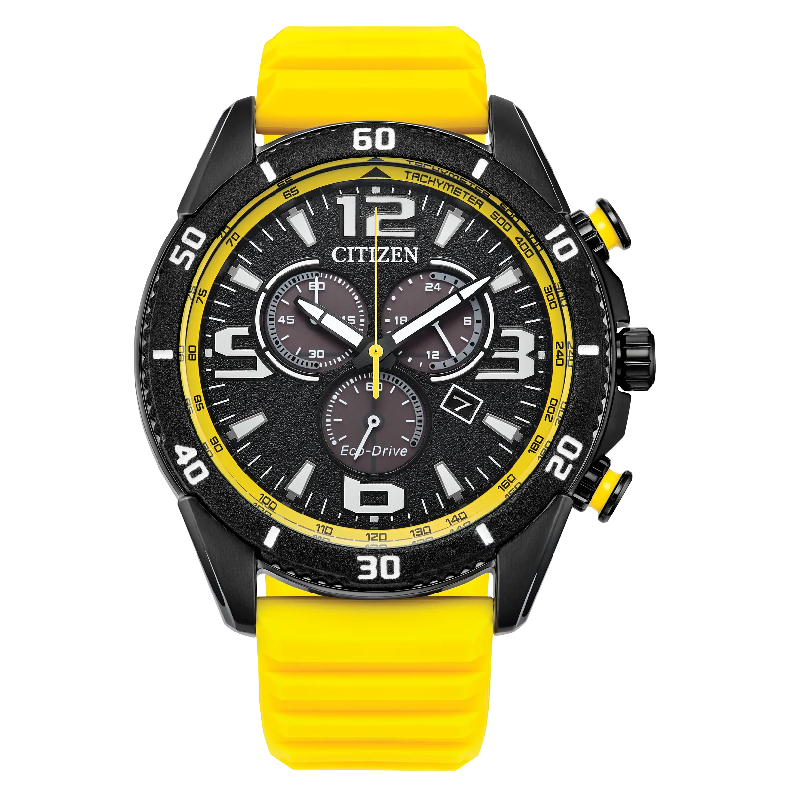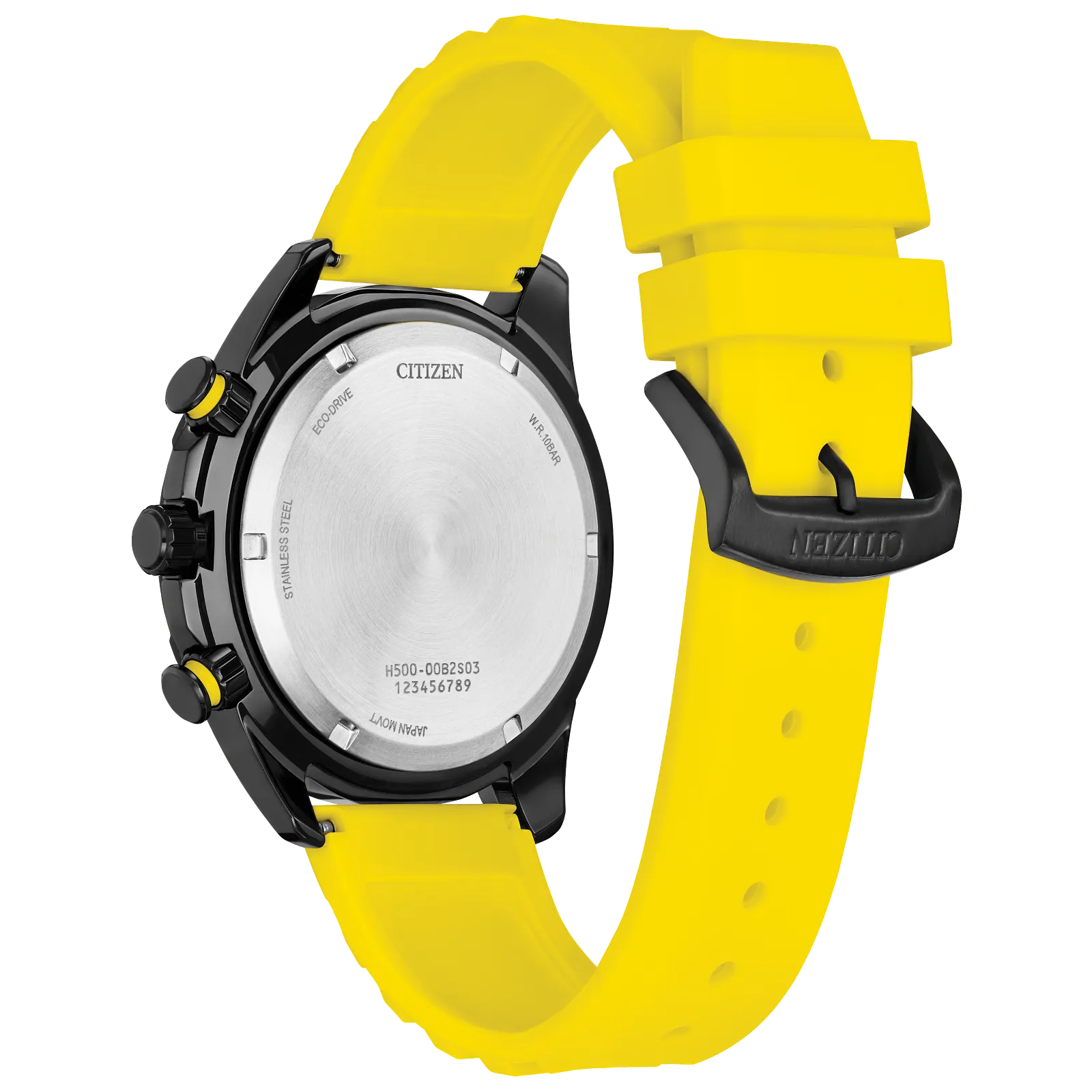 On the dial, the sporty styling continues, with lume-filled, highly legible hour markers anchoring the look, while a yellow tachymetric scale outlines the display. Advanced functions include a 1-second chronograph measuring up to 60 minutes, 12/24 hour time, and a date indicator at the 4 o'clock position. The men’s high-performance Brycen is sustainably powered by any light with Citizen's proprietary Eco-Drive technology that never needs a battery. Water resistant up to 100 meters. Caliber H500.