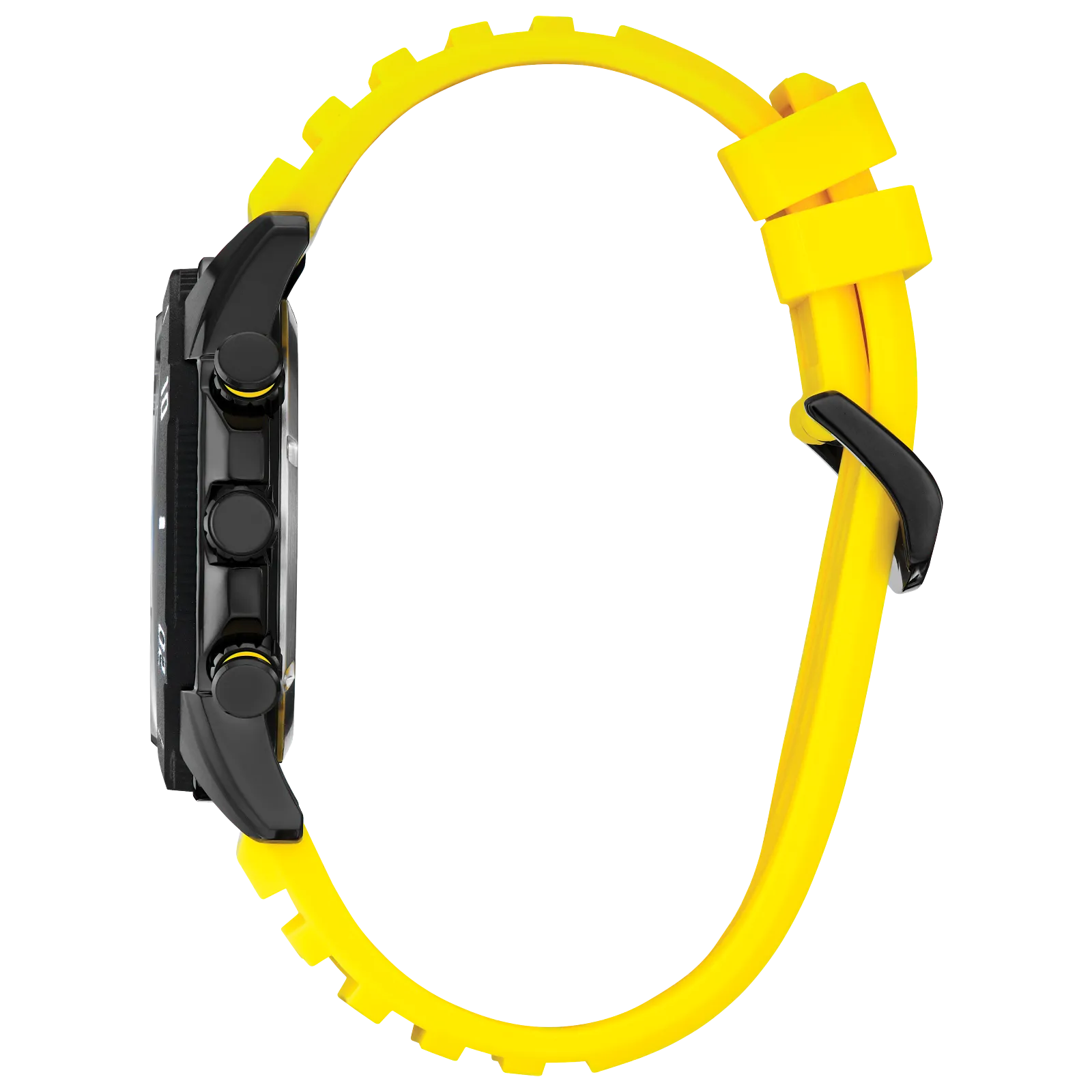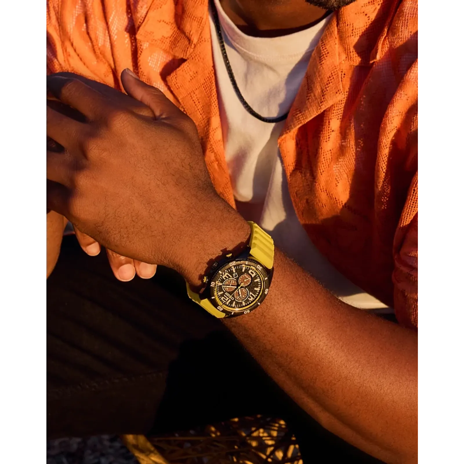 Bold and sporty, this new Brycen chronograph is ready for any adventure. The watch wears boldly at 44.8mm, with a black-tone stainless steel case accented with yellow details on its racing-style pushers. A rotating 60-minute bezel adds to its functionality, while a durable yellow silicone strap secures the timepiece to the wrist.