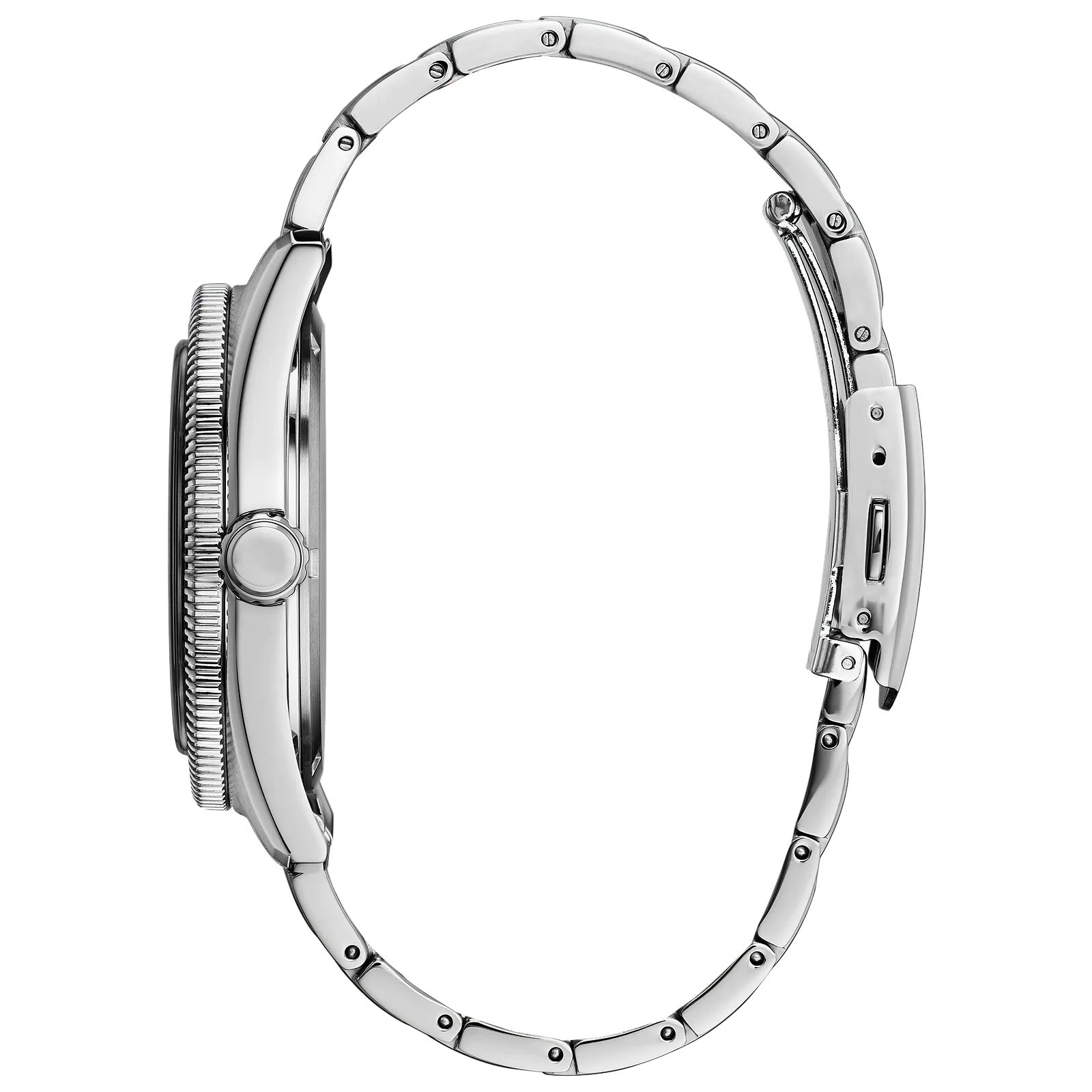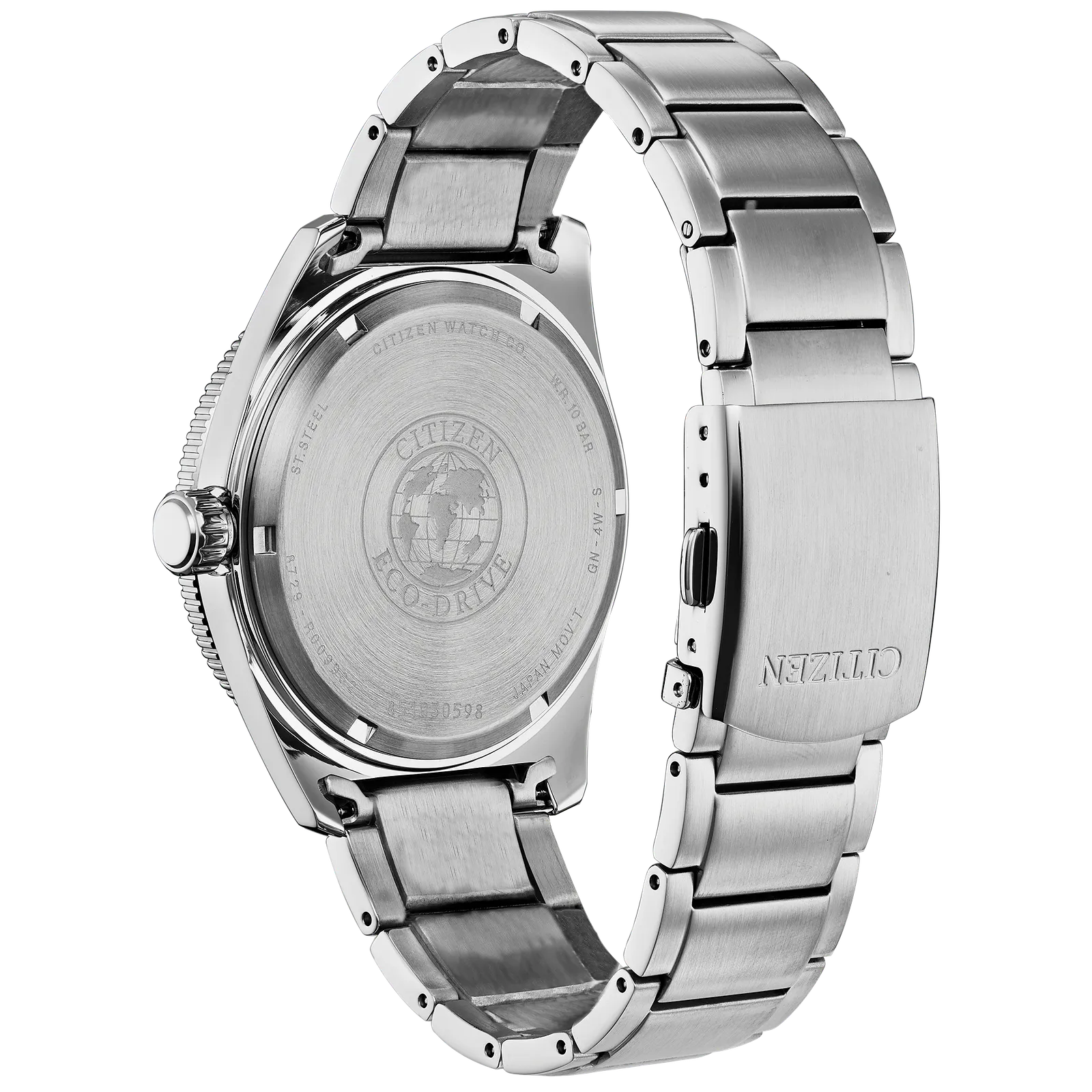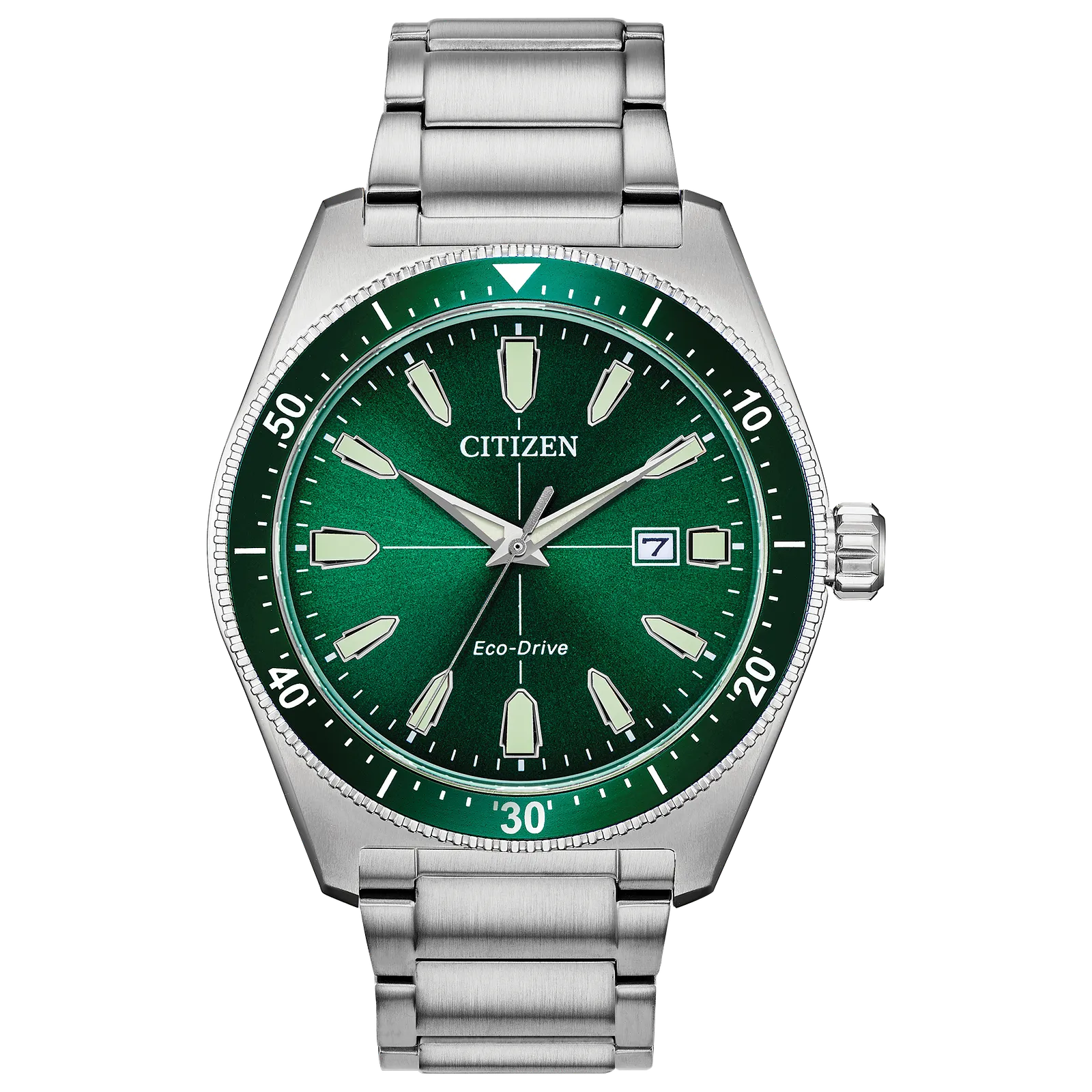 Nothing says classic better than a vintage throwback, and the redesigned Citizen Vintage Brycen Sport timepiece is just that, with distinguished features sure to stand out on your wrist. This stylish watch in a stainless steel case with pine green dial and bezel, stainless steel bracelet and date. Featuring our Eco-Drive technology – powered by light, any light. Never needs a battery. Caliber number J810.