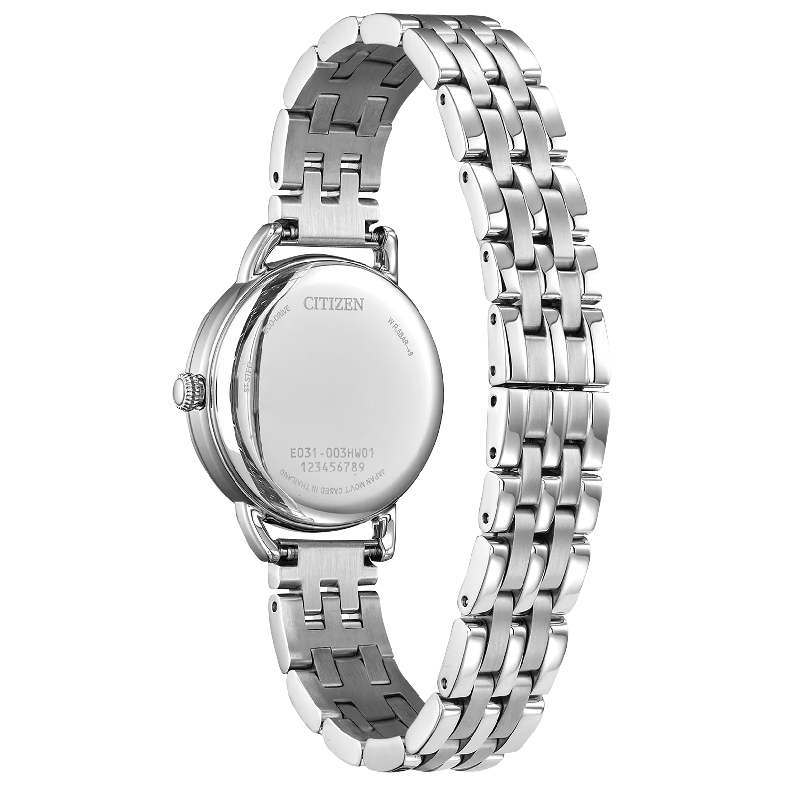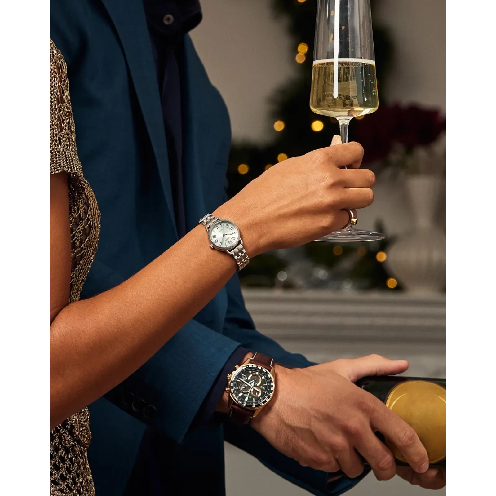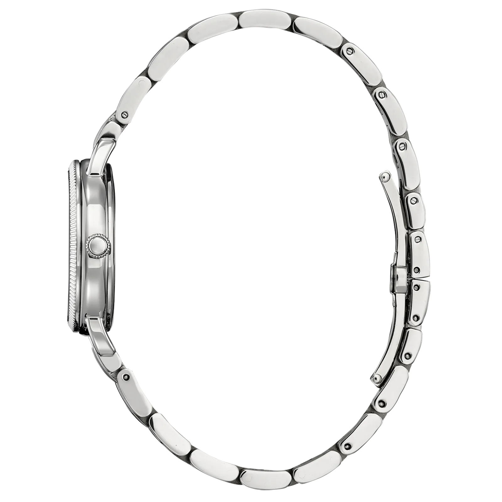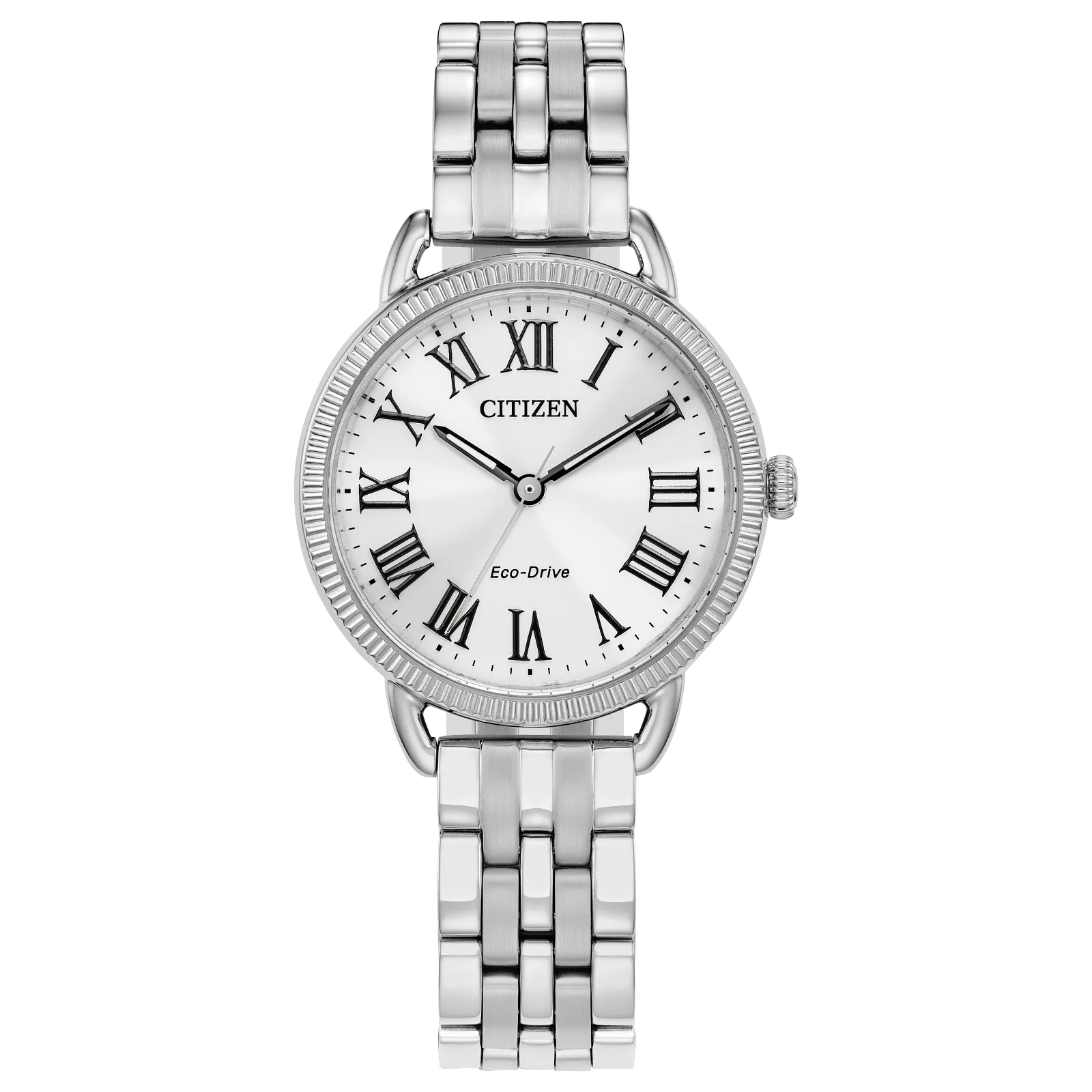 A modern twist on a classic design. Featuring an elegant silver-tone case with a textured, coin edge bezel and silver-tone 3-hand dial with bold Roman numerals, this sleek watch stands out from the crowd while remaining understated. A silver-tone stainless steel fold-over clasp fastens this watch for a minimalist look. Sustainably powered by light with Eco-Drive technology, this watch never needs a battery and offers a refined look and upscale feel.