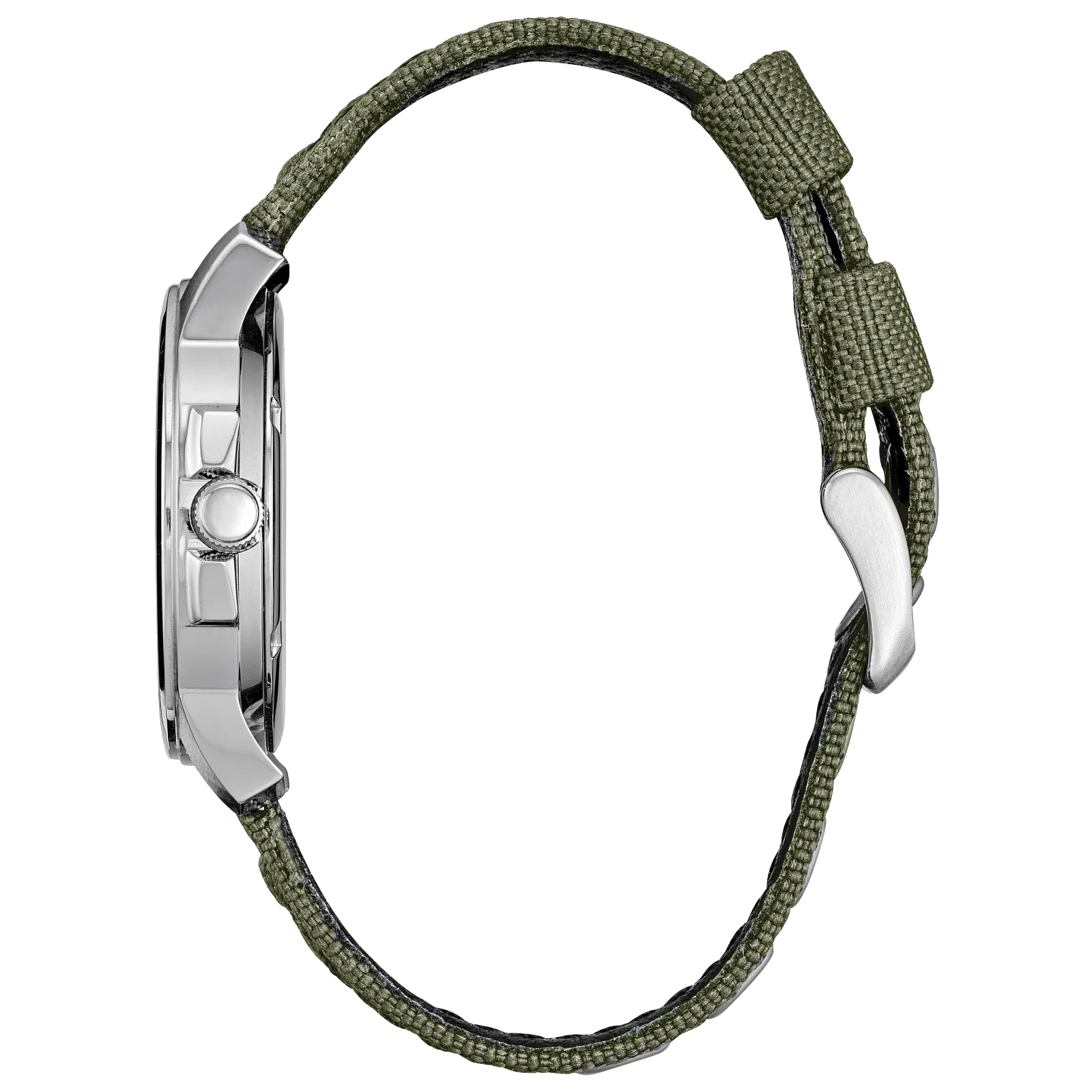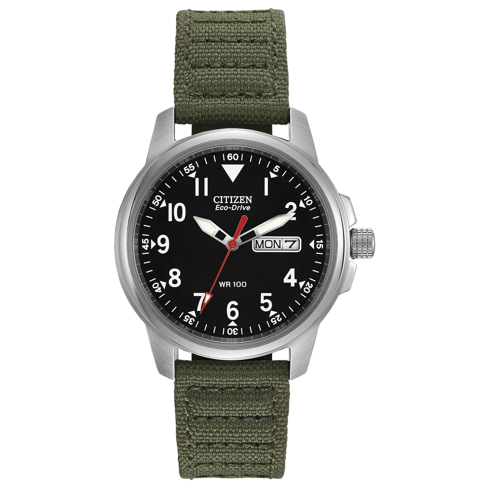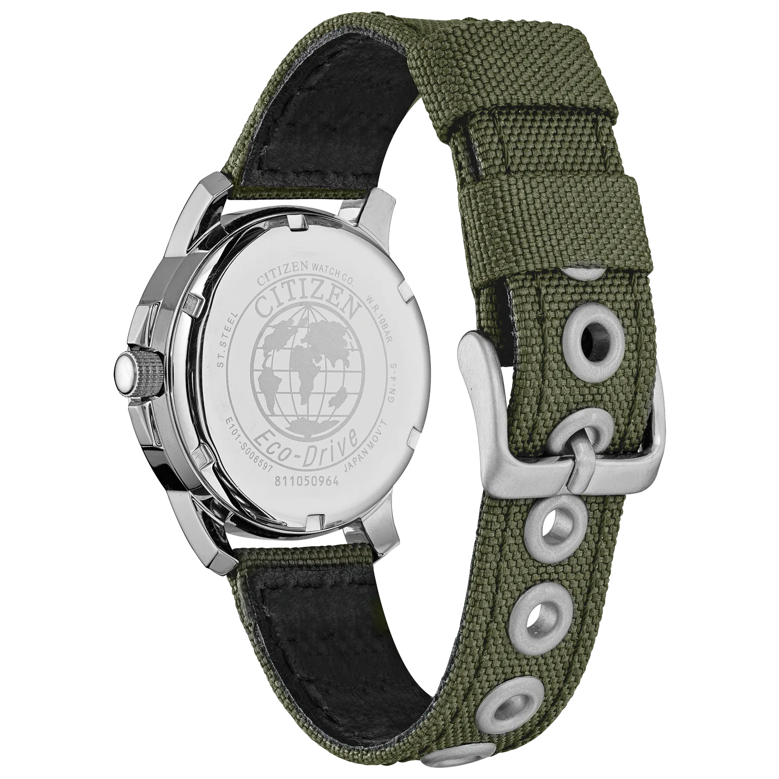 For a rugged look with a comfortable fit, this military-inspired timepiece fits the bill. with a day-date indicator, luminous hands, 37mm screw-back case, and 100M WR. The black dial provides a backdrop for simple Arabic numerals, housed in a stainless steel case along with a woven green strap with patterned stitching and a buckle clasp. Featuring our Eco-Drive technology – powered by light, any light. Never needs a battery. Caliber number E100.