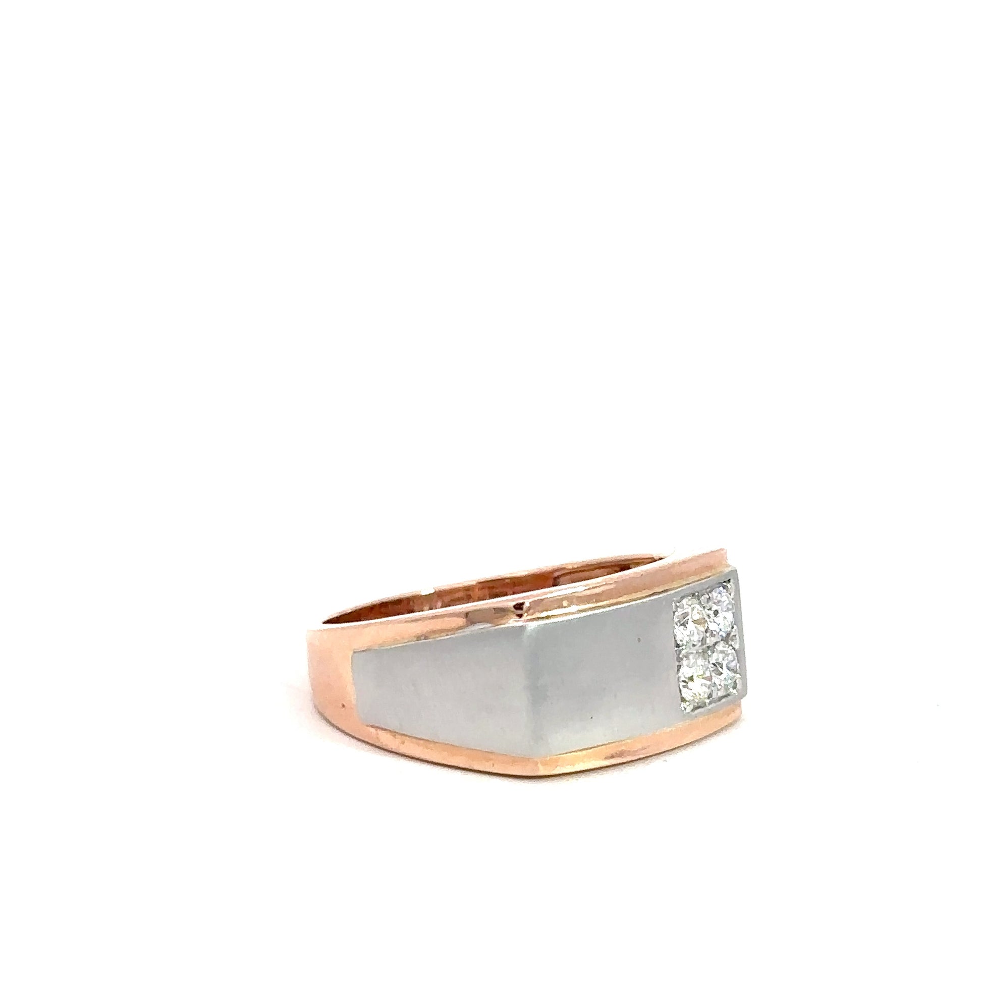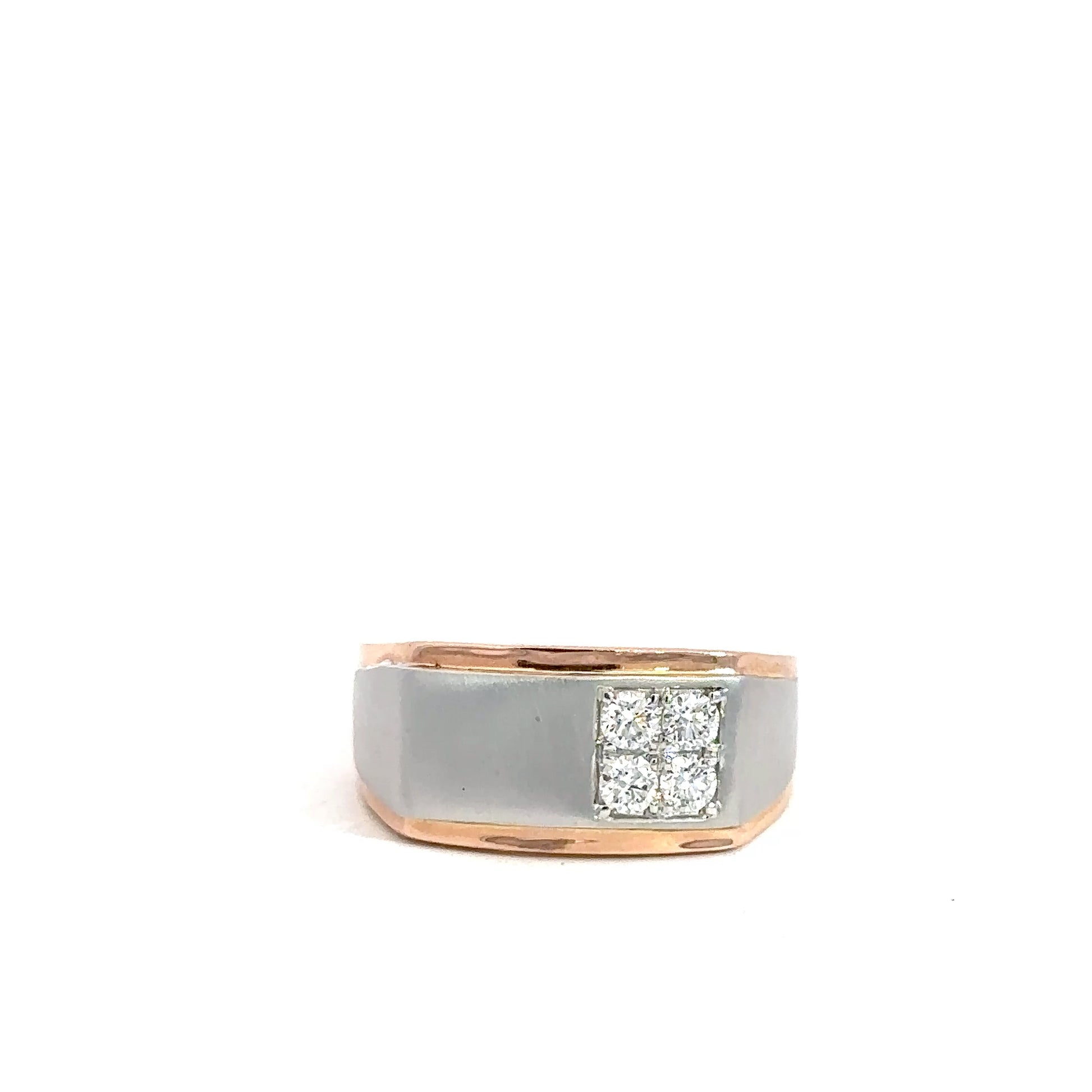 This men's 14k two-tone diamond ring features a satin-finished white gold center framed by rose gold edges and back. It showcases four round brilliant diamonds arranged in an offset square, totaling approximately 0.50 carats. The diamonds offer VS clarity and a near-colorless body tone between E and G, delivering exceptional sparkle and timeless style.