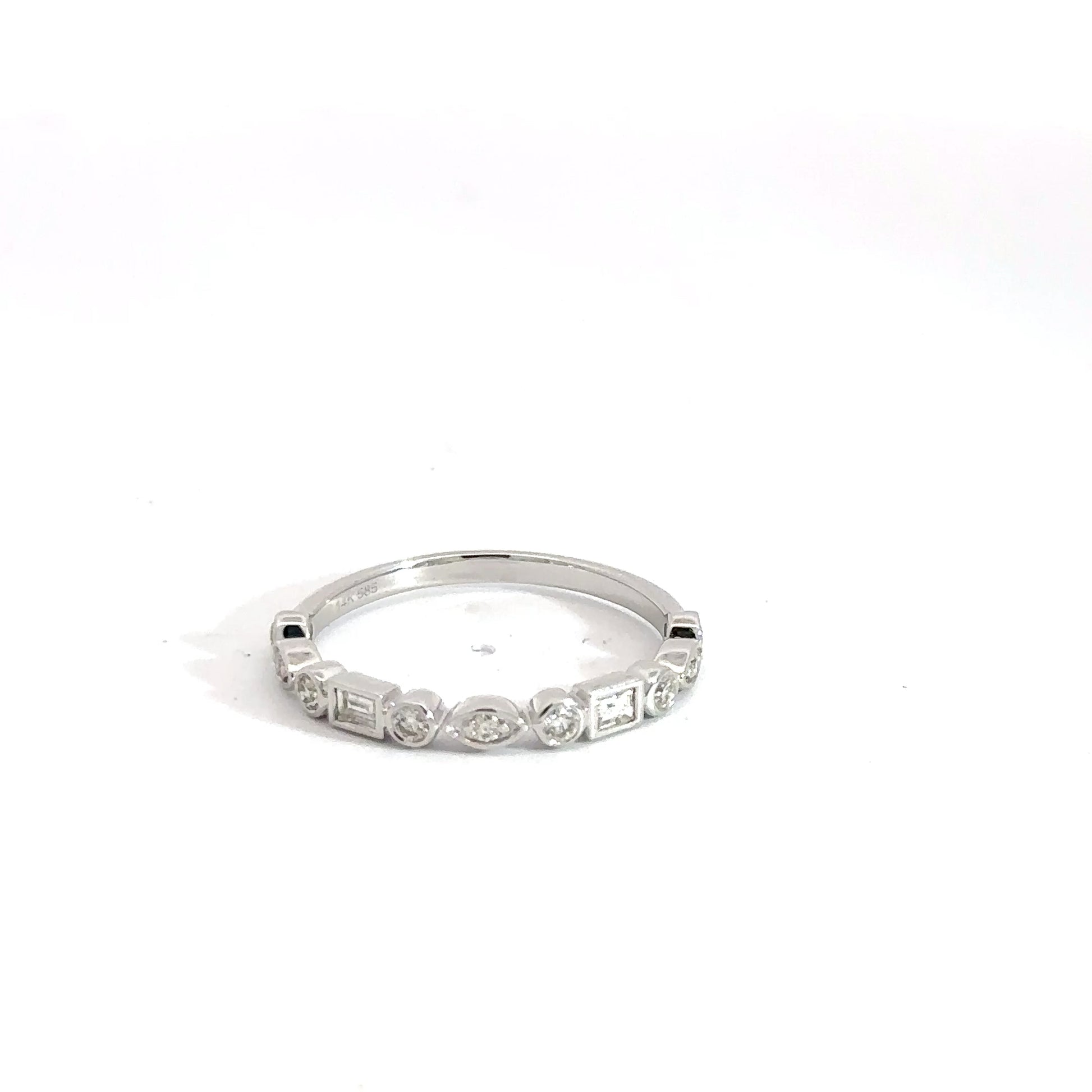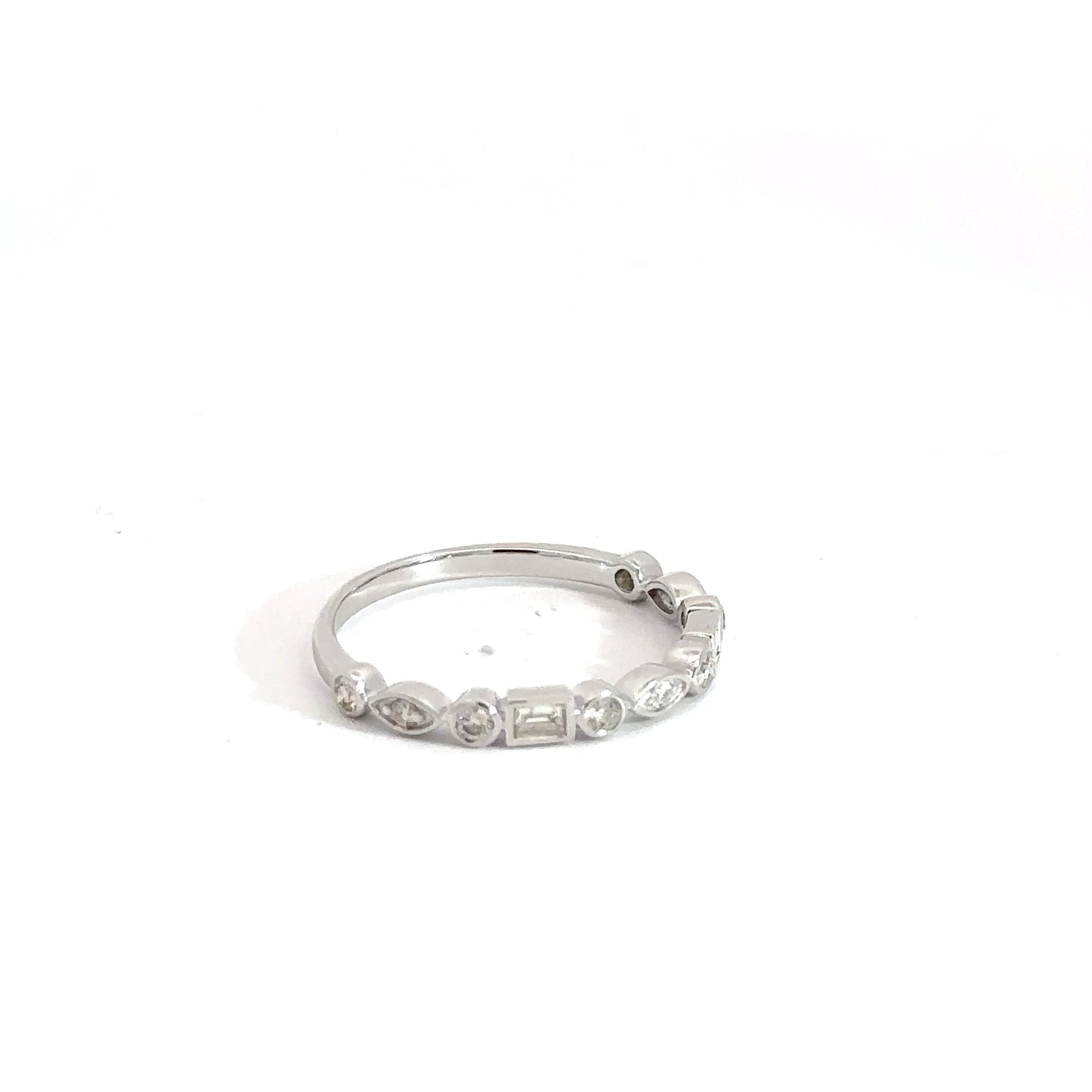 This elegant lady’s band is crafted from 14k white gold and features a total of nine round brilliant diamonds weighing approximately 0.17 carats. Complementing these are two baguette-cut diamonds totaling about 0.09 carats. The round diamonds are uniquely set to create the illusion of varied shapes. Altogether, the diamonds weigh approximately 0.26 carats, with clarity grades ranging from SI1 to SI2 and a near-colorless G-H body color, offering both sparkle and sophistication.