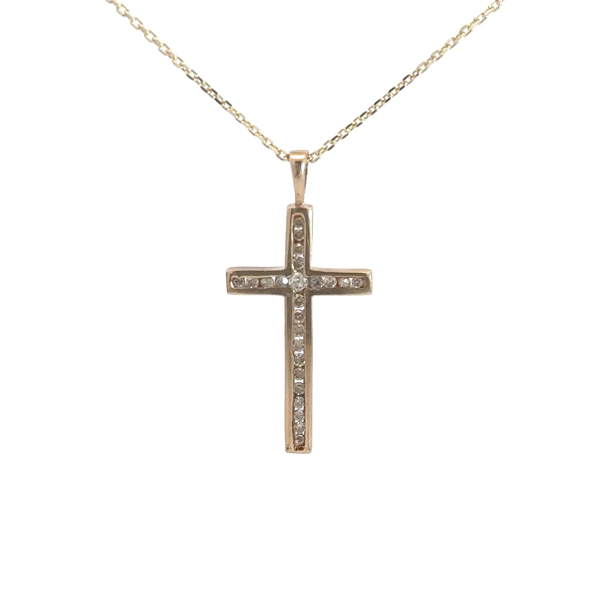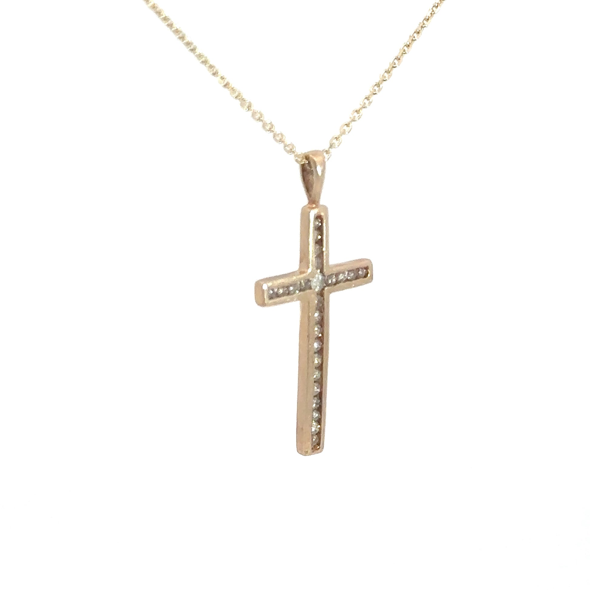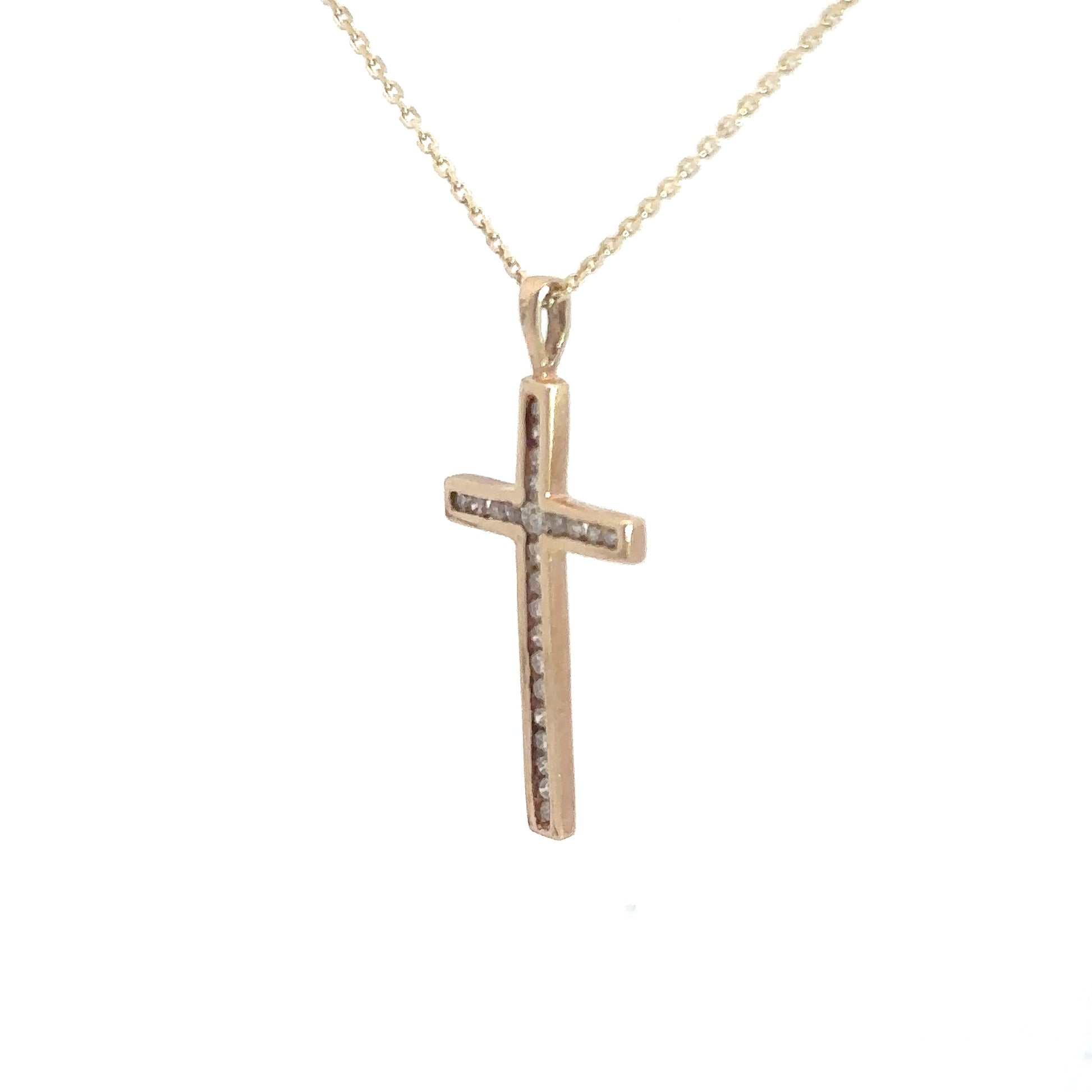 This elegant lady’s pendant features a cross crafted from 14k yellow gold, adorned with 26 sparkling round brilliant diamonds totaling approximately .24 carats. Its refined design adds a timeless touch of sophistication to any outfit.