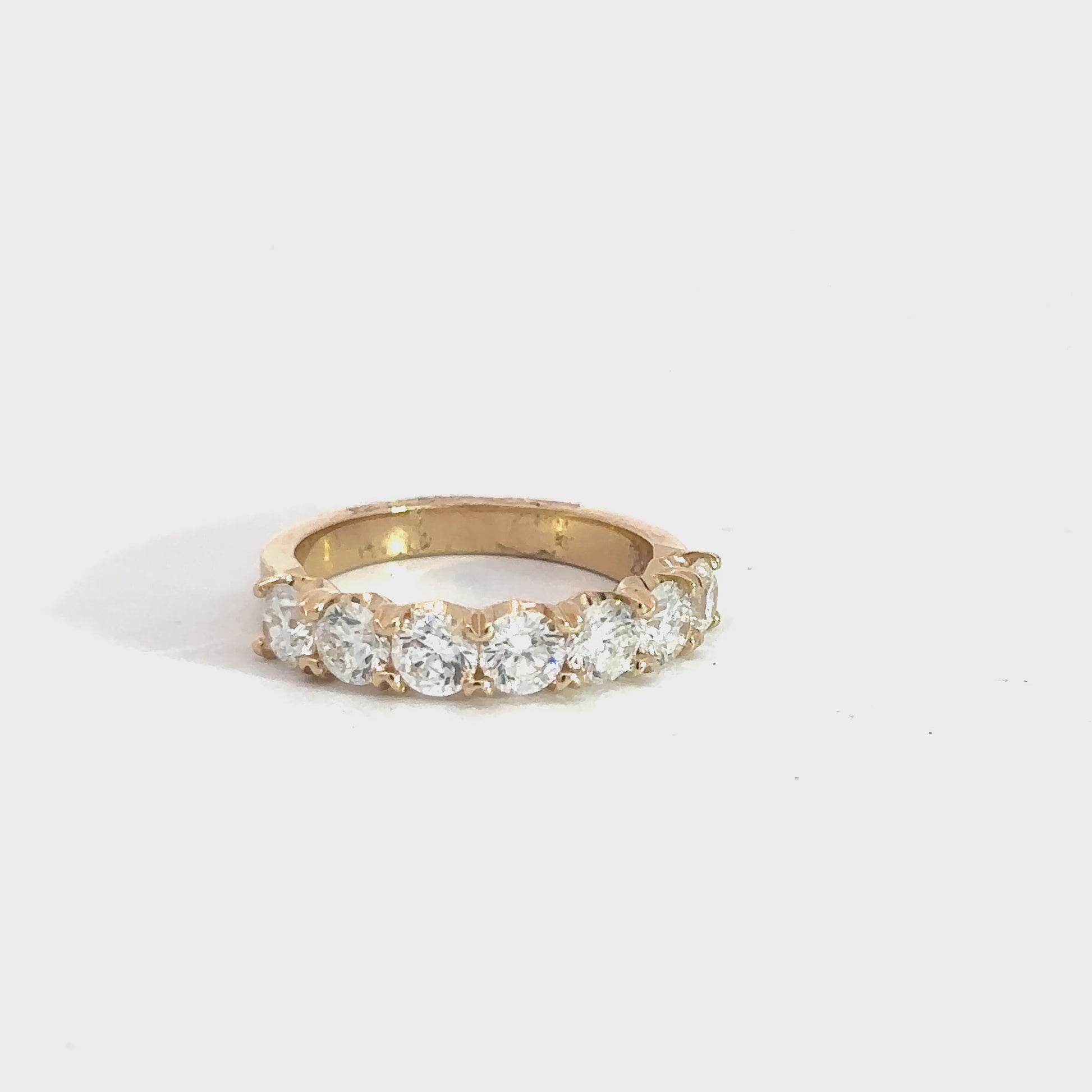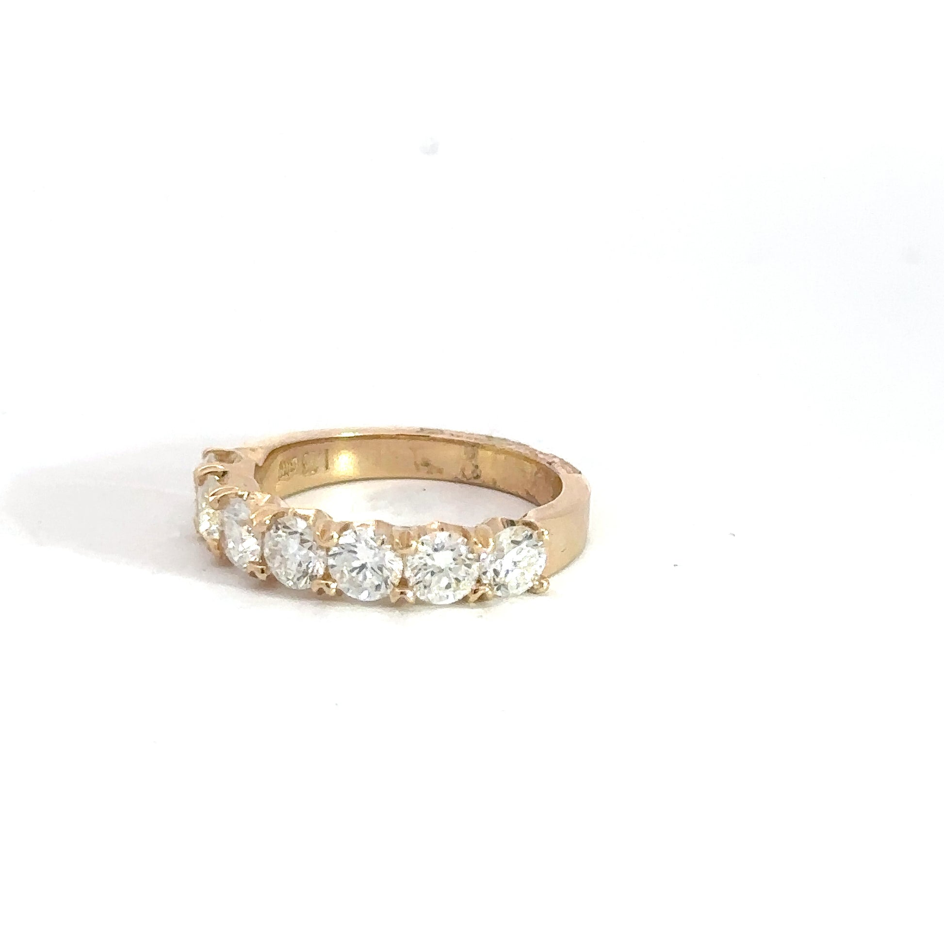 This elegant lady’s band is crafted from 14k yellow gold and features seven dazzling round brilliant diamonds, totaling approximately 1.73 carats. Its timeless design adds a touch of sophistication and sparkle to any occasion.