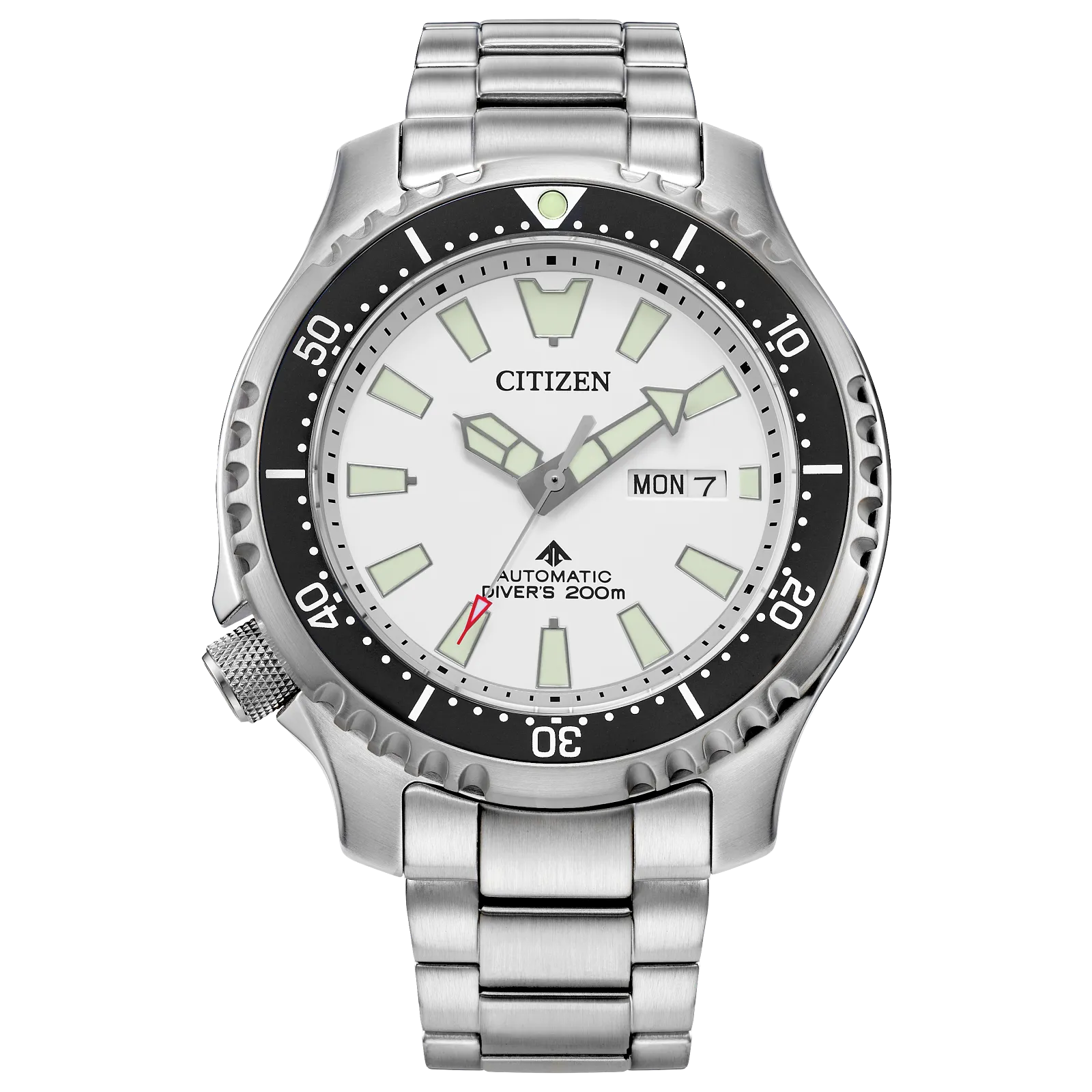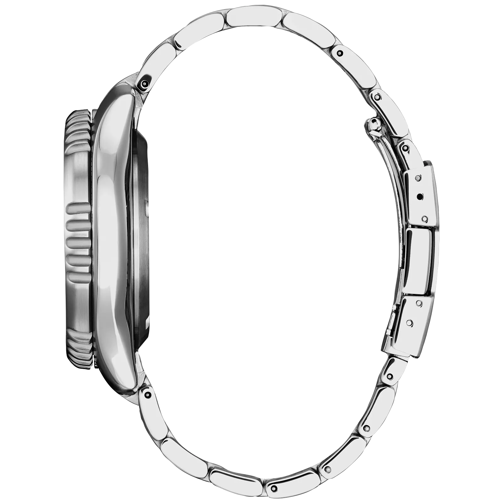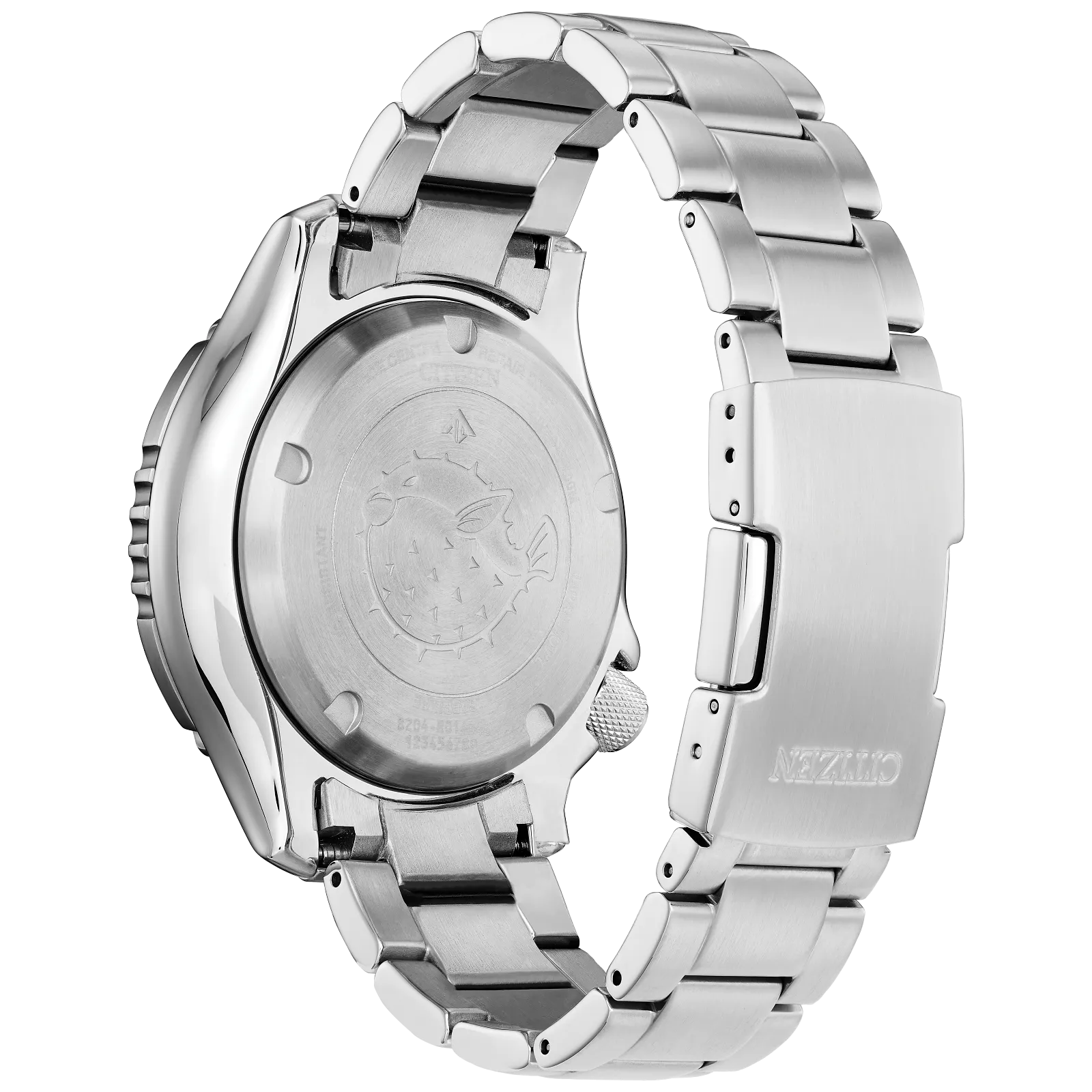 An iconic classic is reimagined in the polished style of the new Promaster Dive Automatic men’s watch. Going deeper into history of the original version of this diving watch, it was used by the Italian Navy and released in 1989 for the new generation of dive watch enthusiasts. A design element that stands out is the distinctive, serrated bezel design that was inspired by a fugu, the Japanese name for pufferfish. Featuring a 3-piece, 44mm case, a sapphire crystal, and a silver-tone stainless steel case and bracelet, the black rotating bezel with an easy-grip aluminum ring surrounds the white dial and luminous hands and markers, while the case back features an engraving of a fugu or pufferfish. This technically advanced and stylish sport watch comes in an exclusive collector’s dive tank box and is ISO compliant with a screw-down crown and water resistant to 200 meters. Caliber 8204.