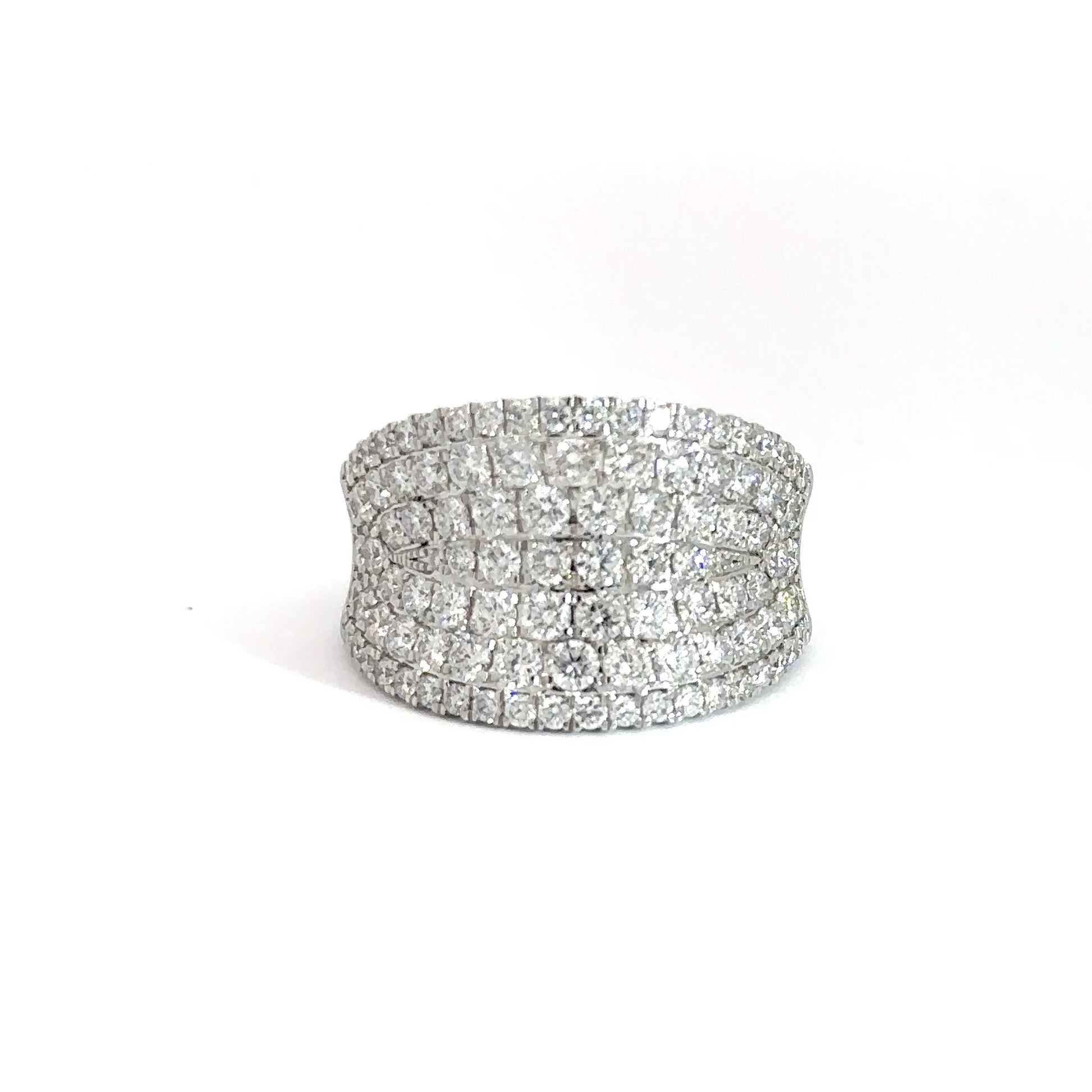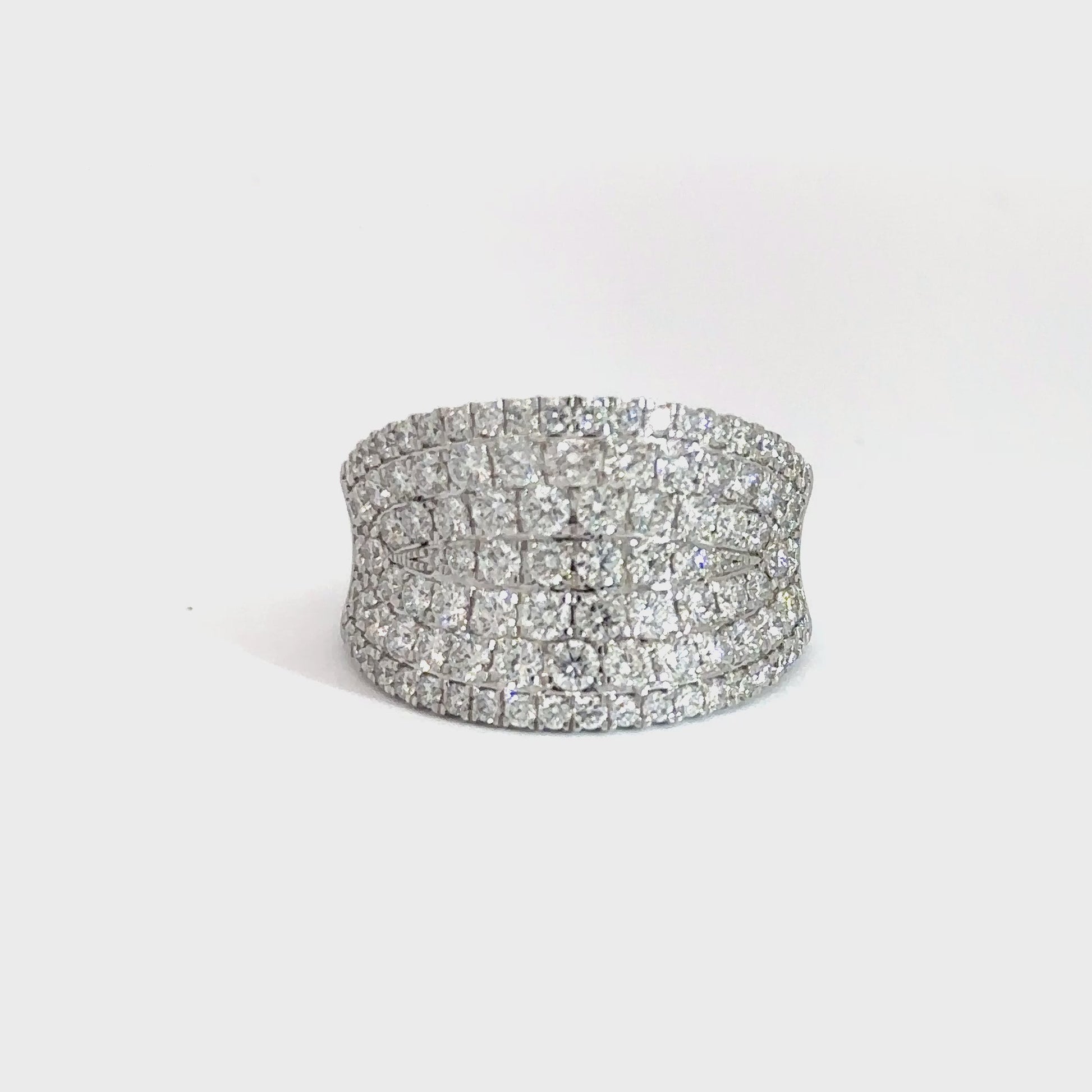 Crafted in 14k white gold, this stunning diamond band features multiple rows of round brilliant pave set diamonds. Boasting a combined weight of 3.13cttw, these diamonds have a clarity of SI1 and a body color of (F-G), making for an exquisite and luxurious choice for any occasion.