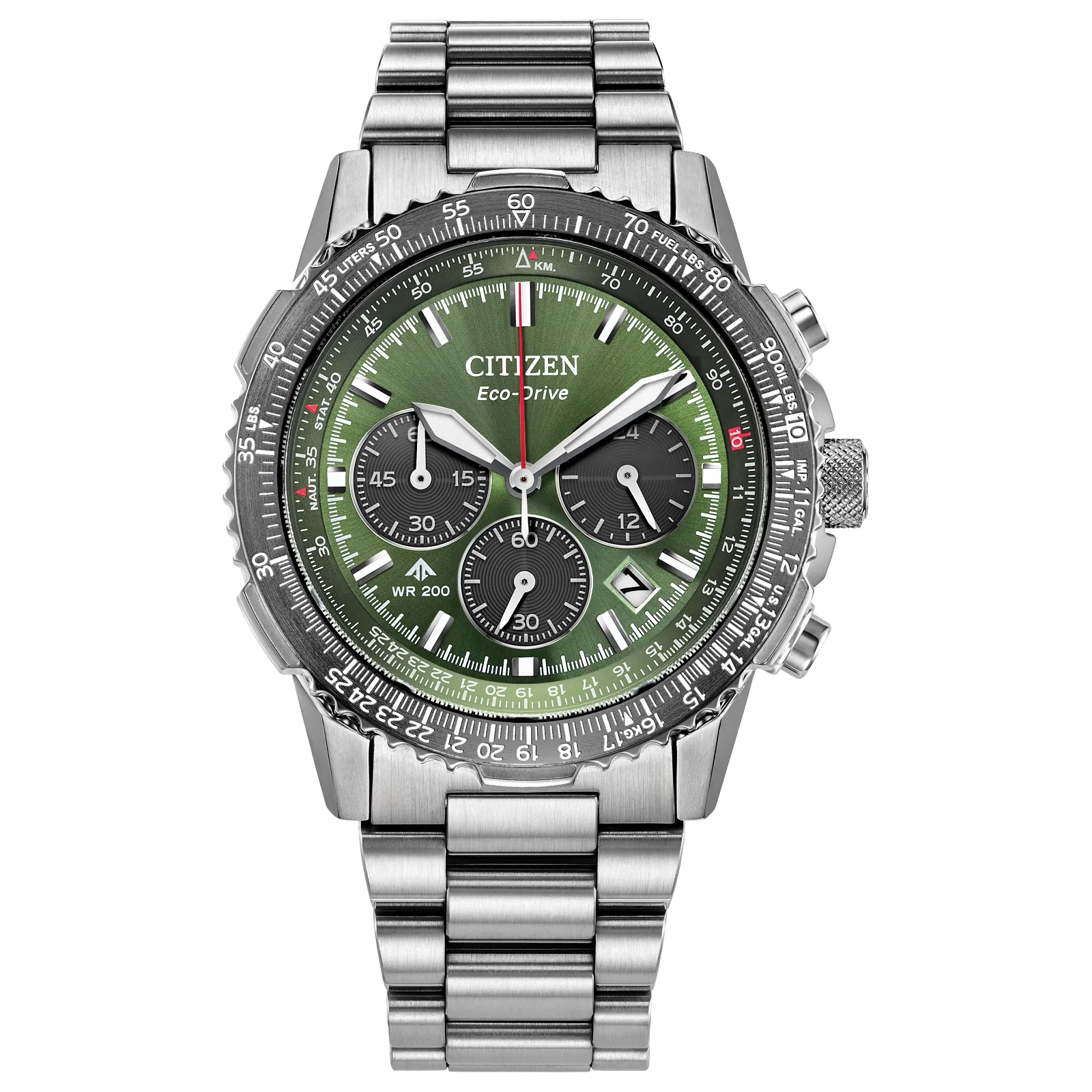 On the dial, a khaki green colorway with red, black, and white accents adds to the watch's superior legibility, while a sapphire crystal and 200m of water resistance protect it all. Functions include a 1/5 second chronograph measuring up to 60 minutes, 12/24 hour time displays, and a date indicator, all powered by our Eco-Drive technology – sustainably powered by light and never needing a battery. Caliber B620.