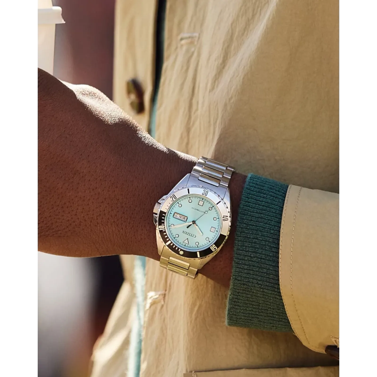 Experience the fusion of sporty style and everyday functionality with the Sport Automatic, the latest timepiece in our Automatics Collection featuring a high-performance movement. A 42mm silver-tone stainless steel case provides the foundation of the watch, with smartly integrated crown guards, a bold two-tone 60-minute bezel, and a silver-tone stainless steel bracelet adding to its sporty credentials. Underneath a sapphire crystal, the light blue dial makes a striking statement with a sunray finish paired with bold geometric appliques for an aesthetic that’s as legible as it is captivating. With a retro-cool day-date display at 3 o’clock and water resistance up to 100 meters, this timepiece offers charm and practicality for your daily adventures. Caliber 8200.