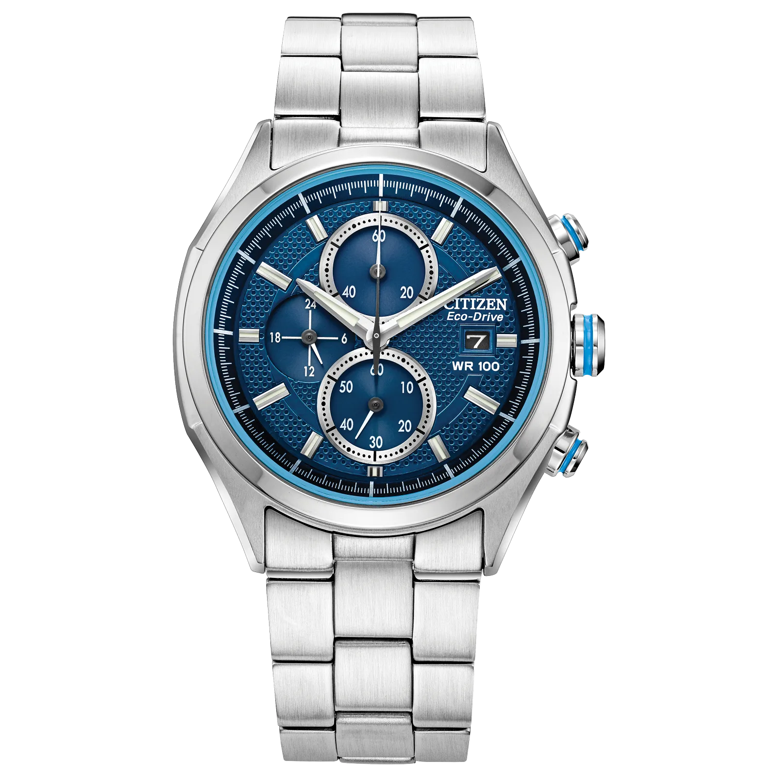With modern styling and bold color accents, a Drive from Citizen watch is the perfect timepiece for the modern man. Using Eco-Drive technology, it is powered by light — any light — and will never require a new battery, and also features a chronograph, 12/24 hour time and the date. The stainless-steel bracelet is paired with a 41mm stainless steel case and blue dial, for a sporty look that will be at home on any arm.