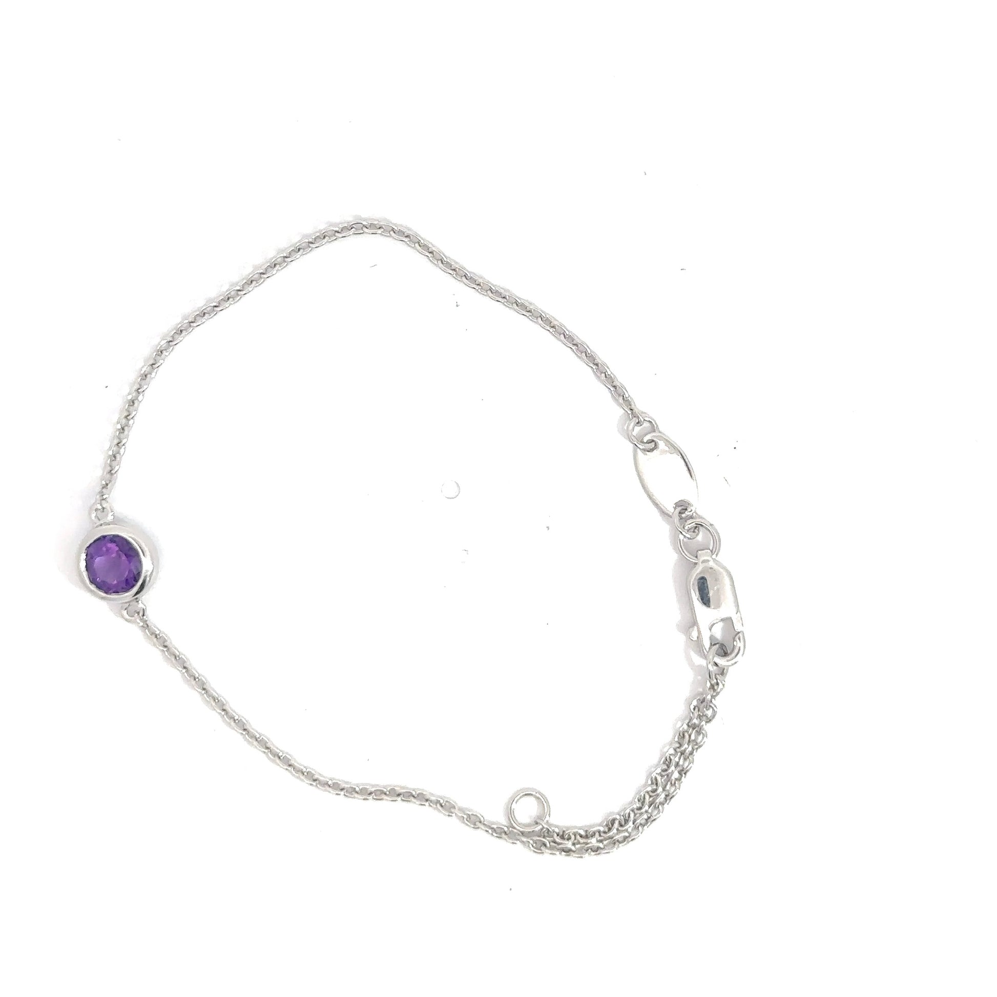 A touch of elegance and sophistication adorns your wrist with this beautiful sterling silver bracelet featuring a bezel set single amethyst stone. A must-have addition to your jewelry collection.