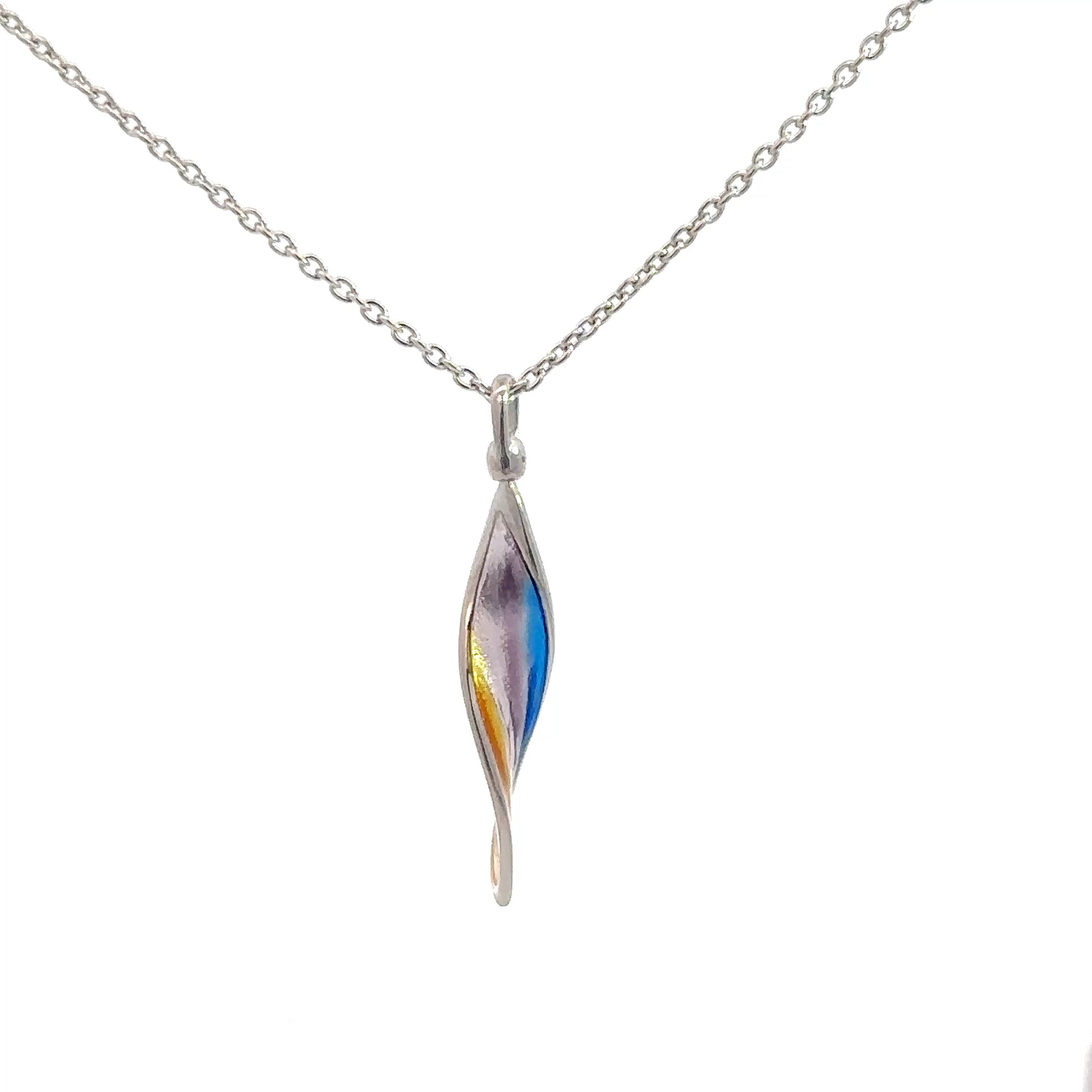 This elegant ladies' pendant features sterling silver with a hand-enameled design capturing the beauty of an aurora sunset.