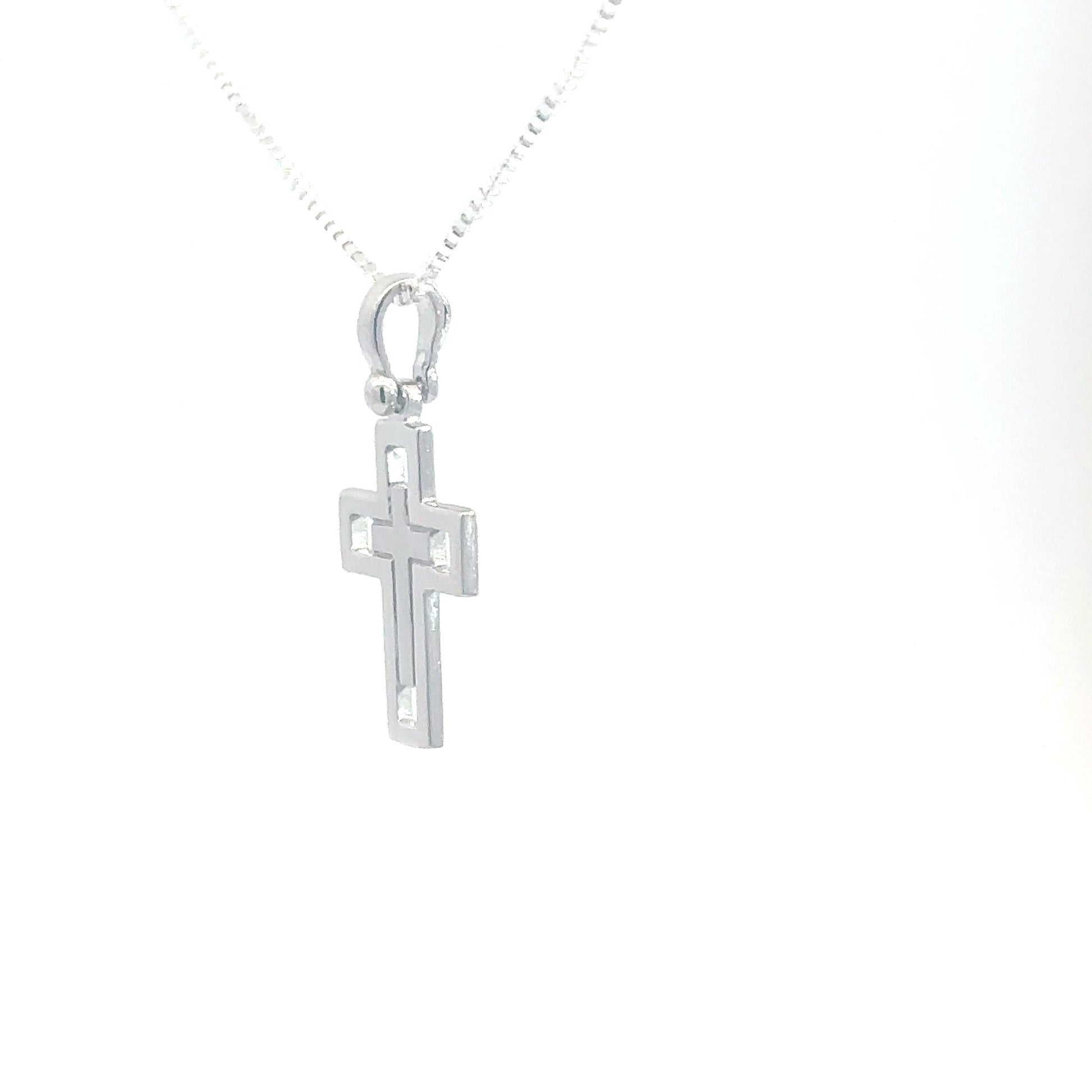 This sterling silver cross features an elegant cut-out design, adding a distinctive touch to a classic symbol.