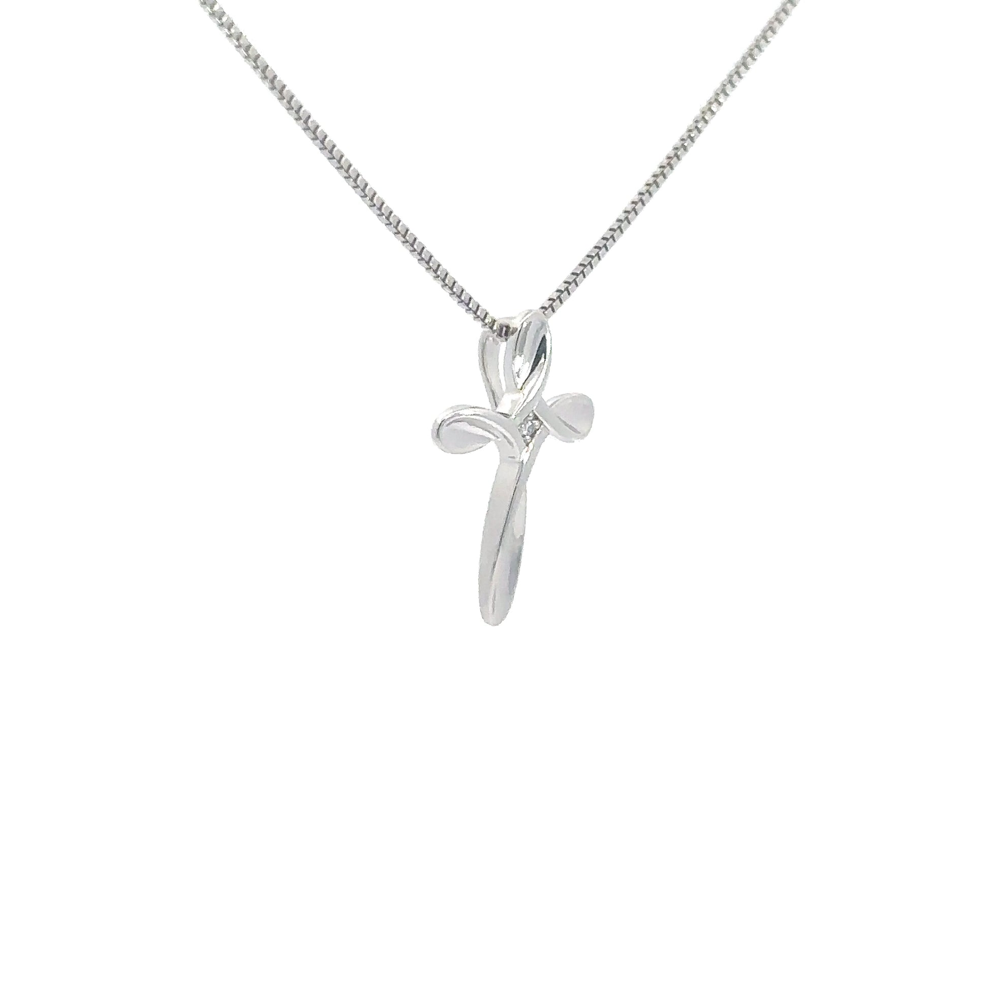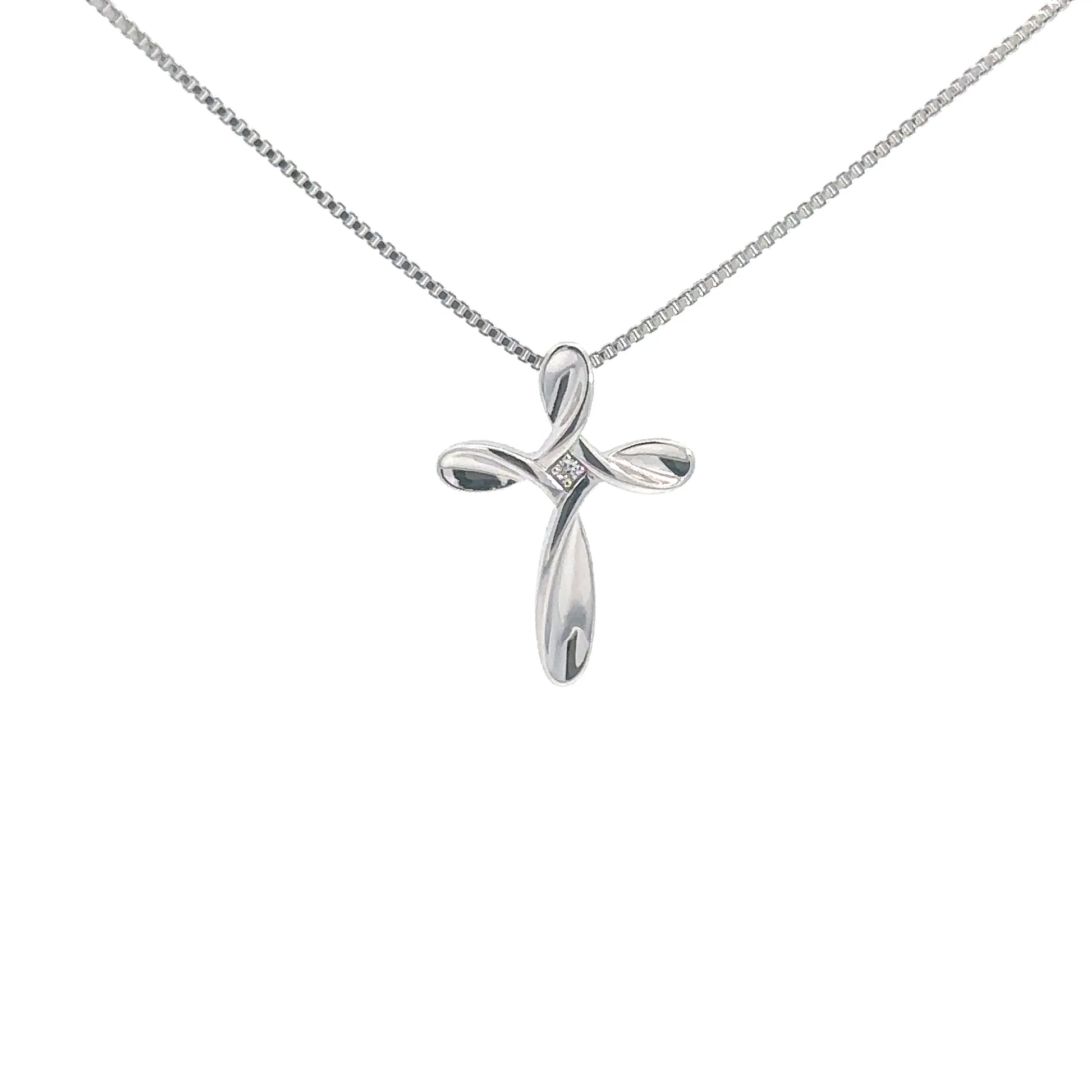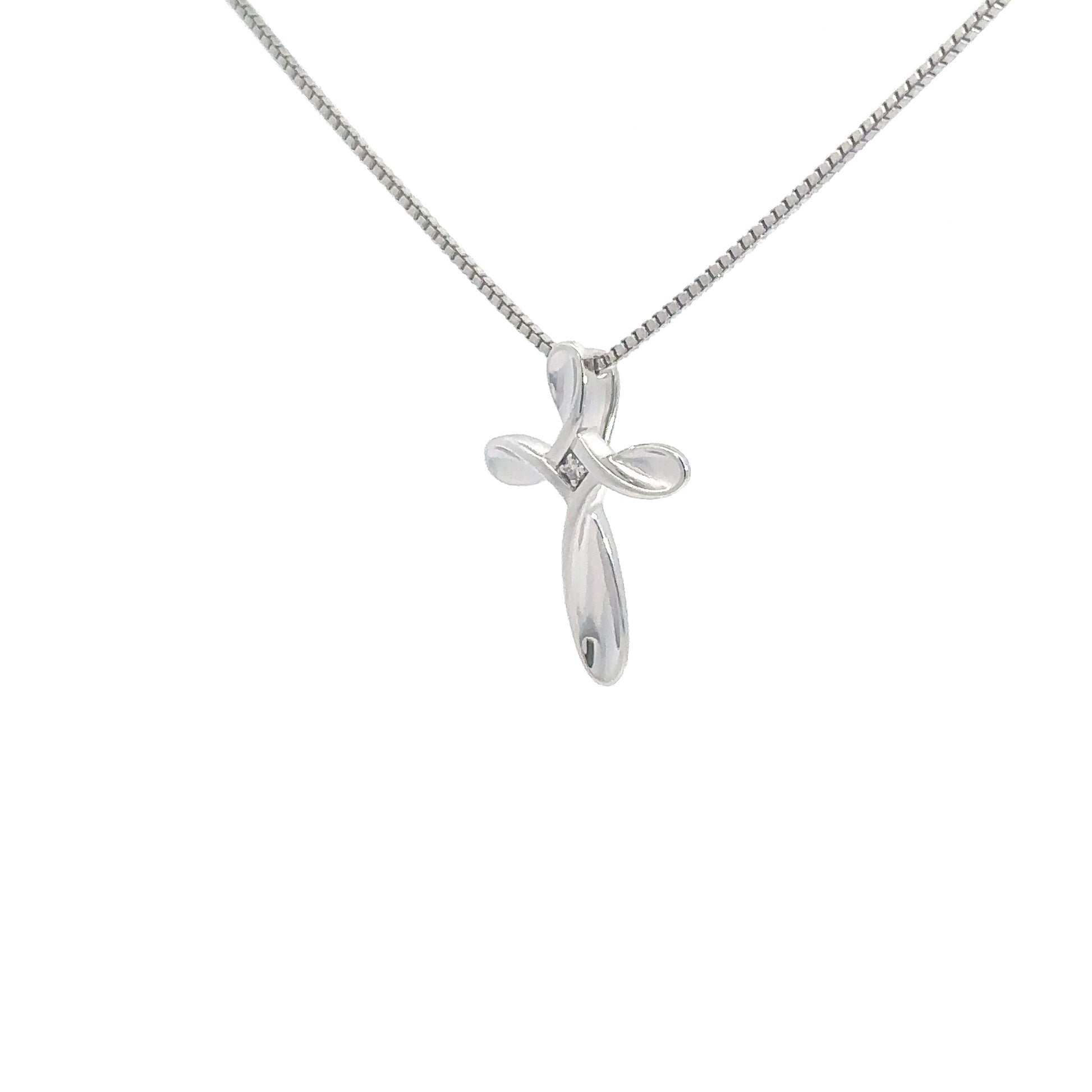 This elegant lady’s cross is crafted from sterling silver and features a sparkling round brilliant diamond totaling approximately .01 carats, adding a delicate touch of brilliance to a timeless design.