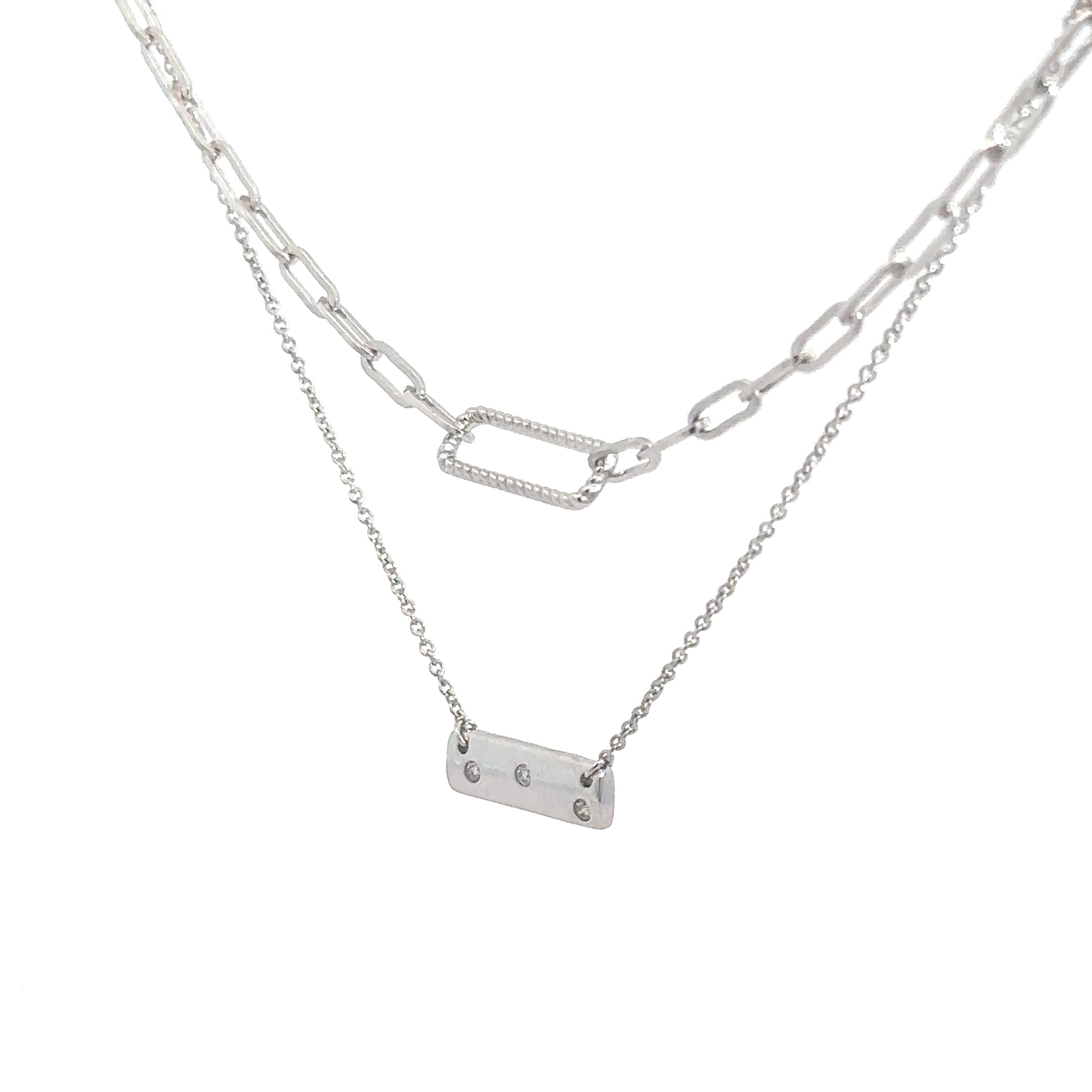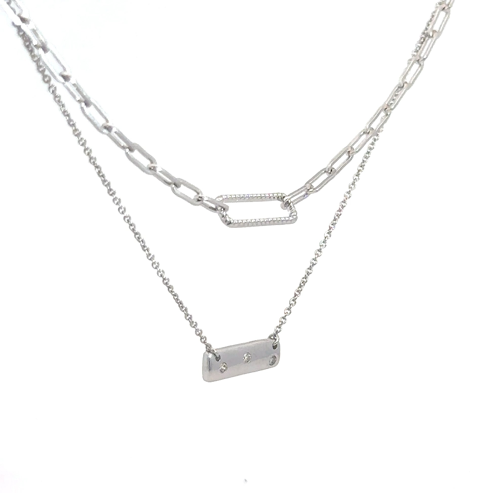 Elevate your everyday elegance with this stunning sterling silver double row necklace, where modern design meets timeless sophistication. The distinctive paperclip chain pairs beautifully with a delicate bar adorned with scattered diamonds totaling approximately .04 carats, creating an eye-catching layered effect that catches the light from every angle. Perfect for adding dimension to any outfit, this versatile piece transitions seamlessly from day to night, making it an essential addition to your jewelry collection.