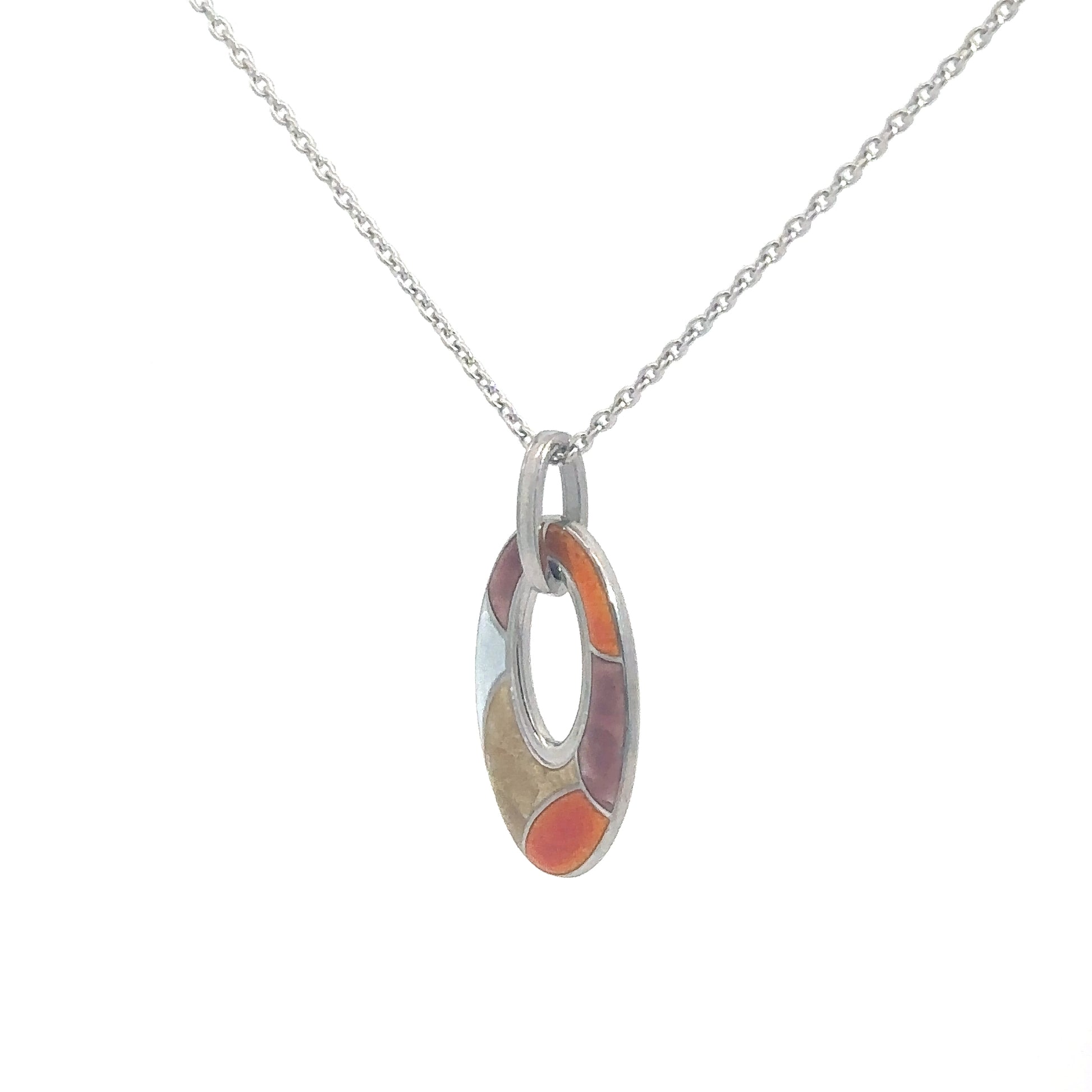 This sterling silver oval pendant features hand-applied enamel in rich fall colors, creating a beautifully crafted and unique accessory.