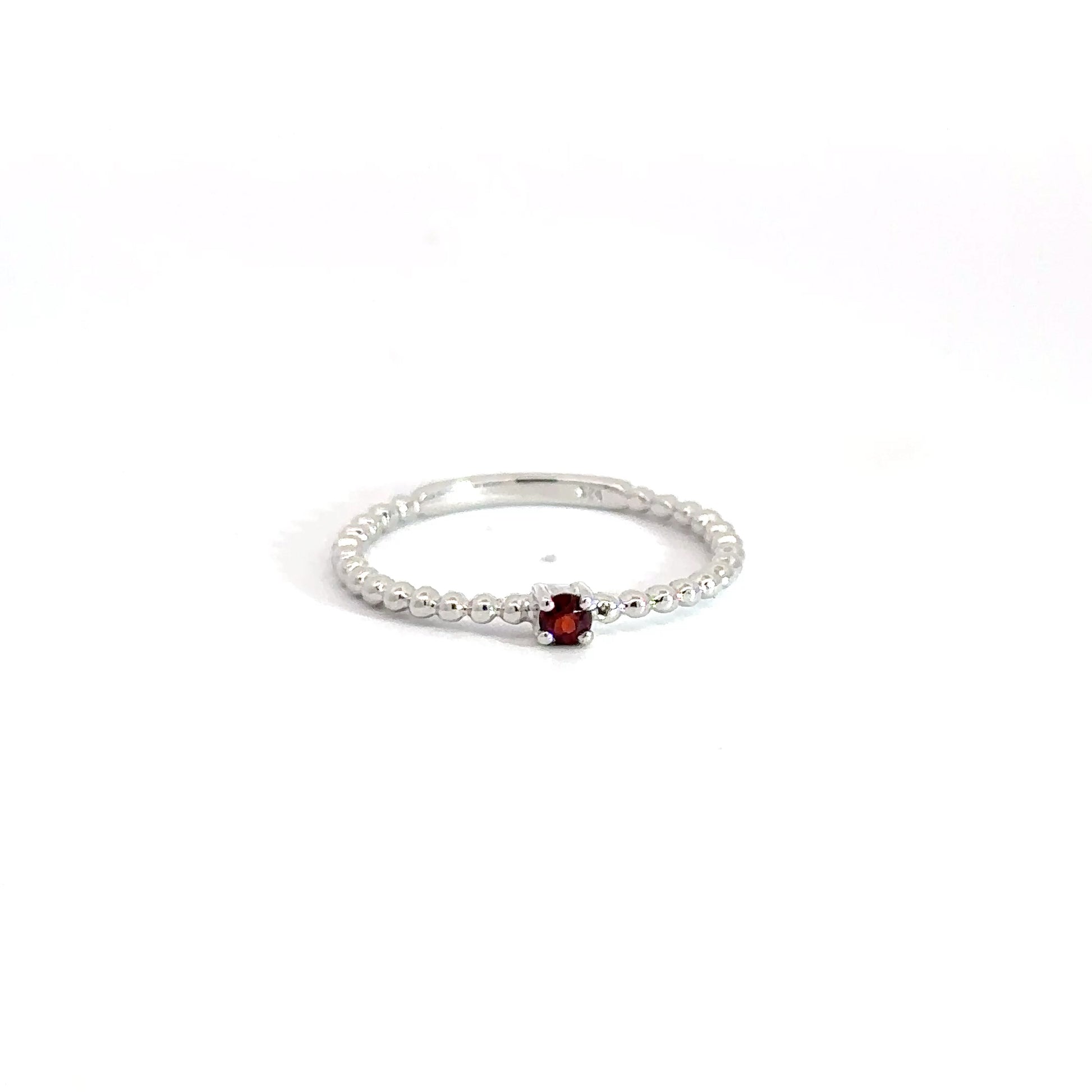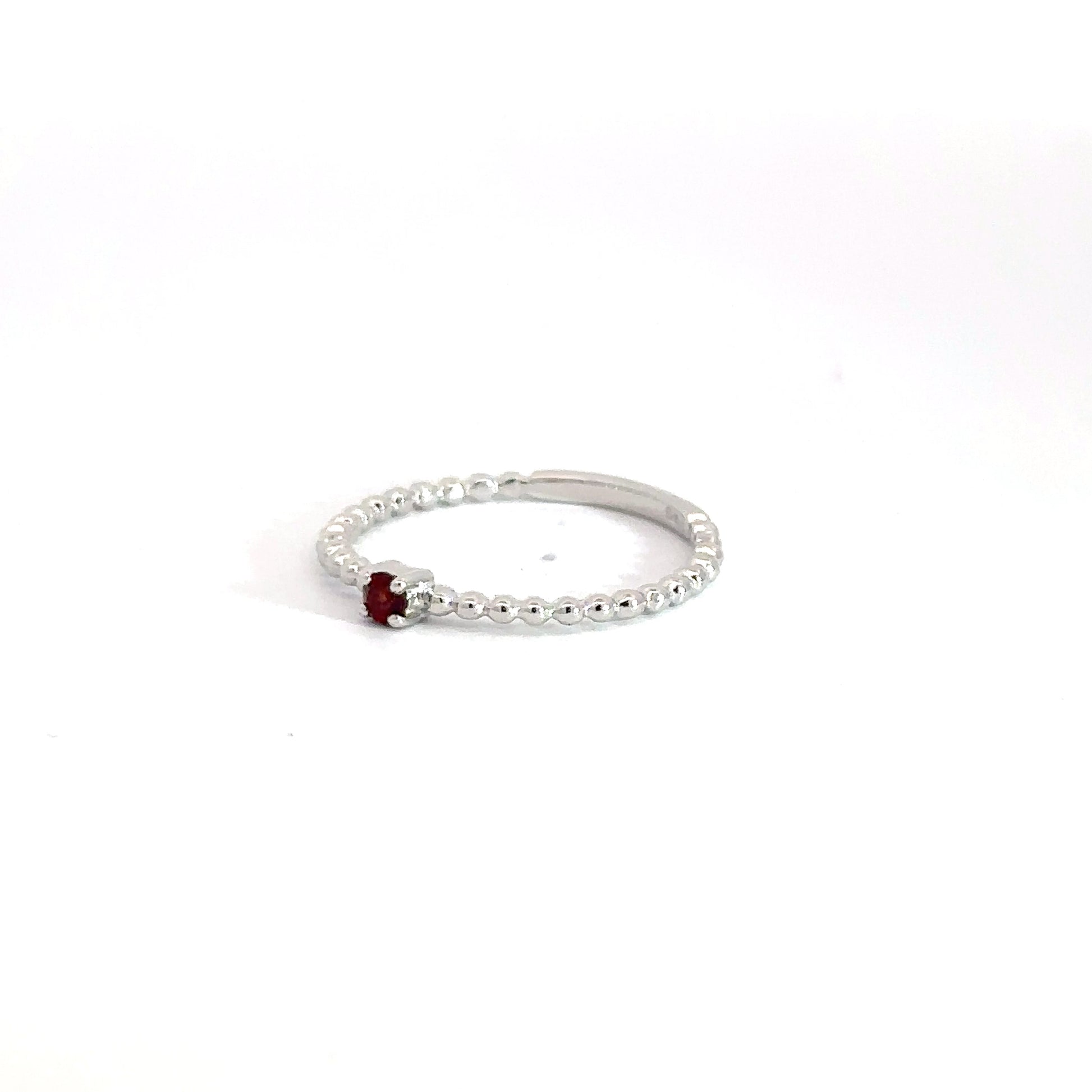 Transform any outfit into a statement piece with this stunning sterling silver garnet ring. The round garnet is beautifully showcased on a beaded band, creating a unique and eye-catching design. Elevate your style and confidence with this luxurious accessory.