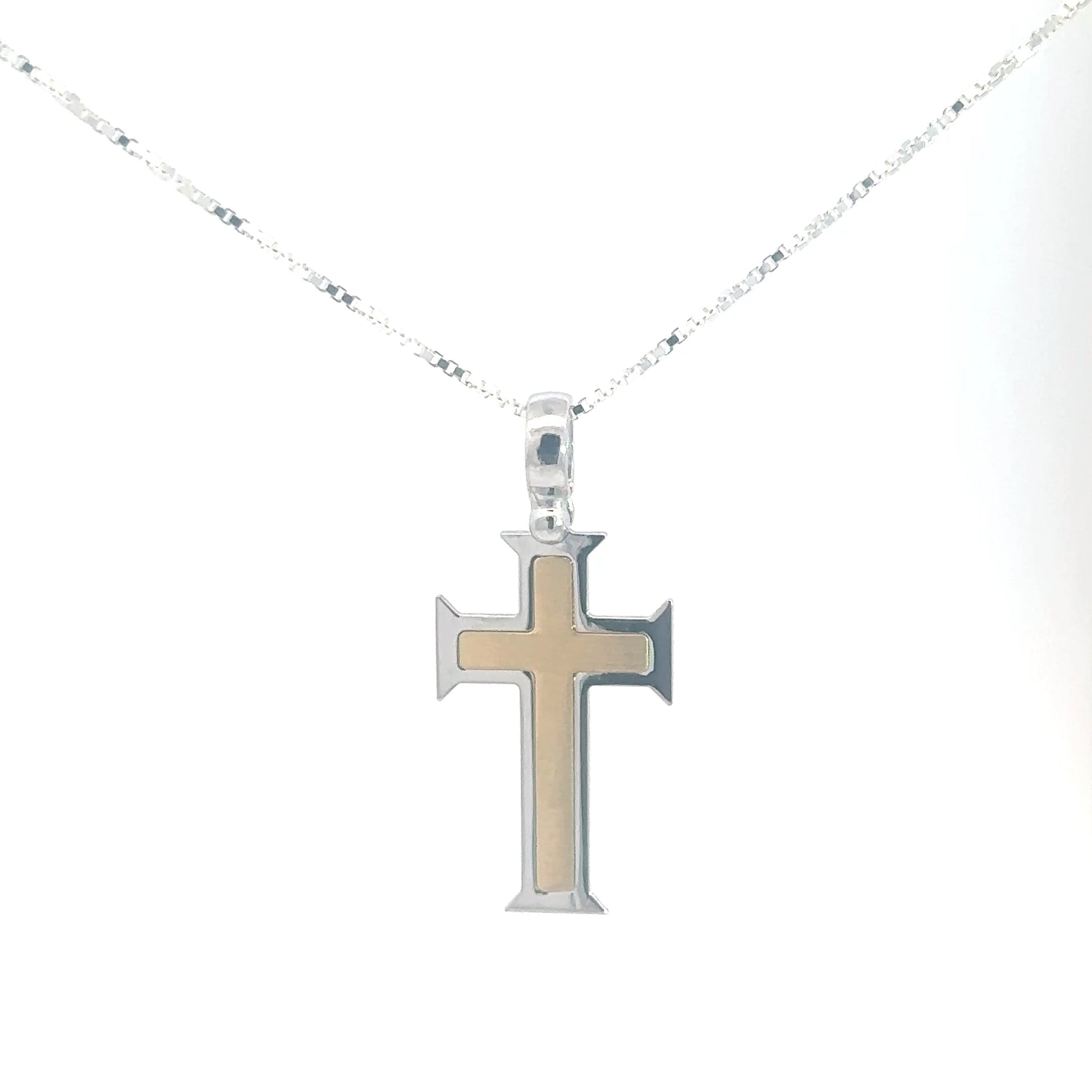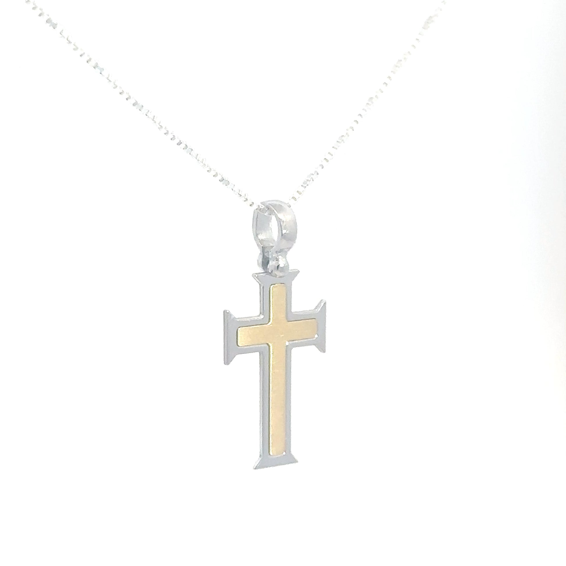 Crafted from sterling silver, this cross is beautifully accented with a rich gold vermeil plating, offering a striking blend of elegance and durability.