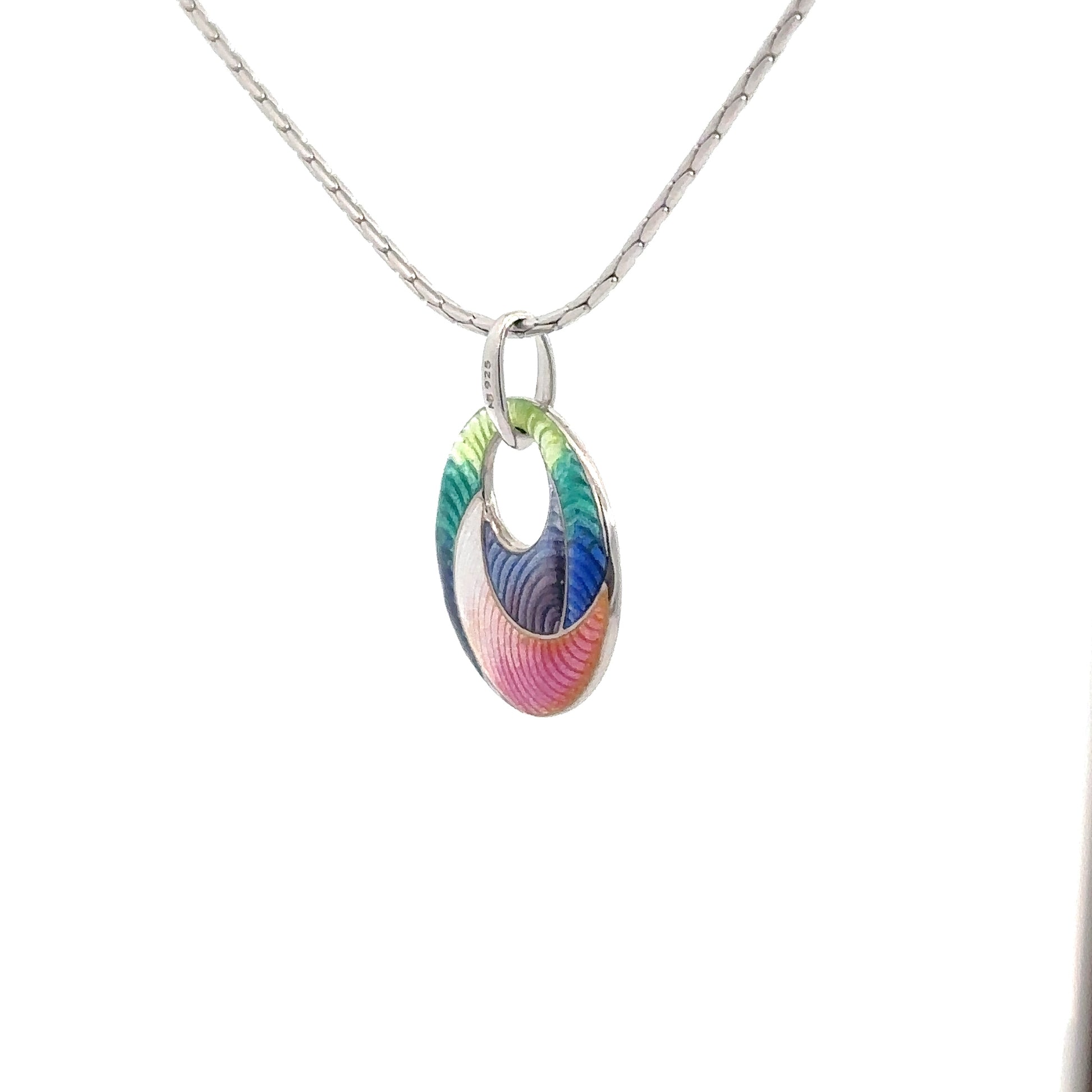 This exquisite lady’s pendant features a sterling silver circle hand enameled in vibrant, multi-colored Rio tones, perfect for adding a unique touch to any outfit.