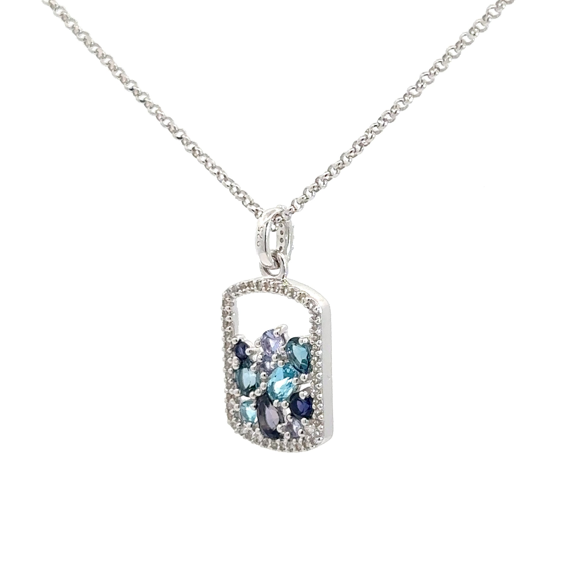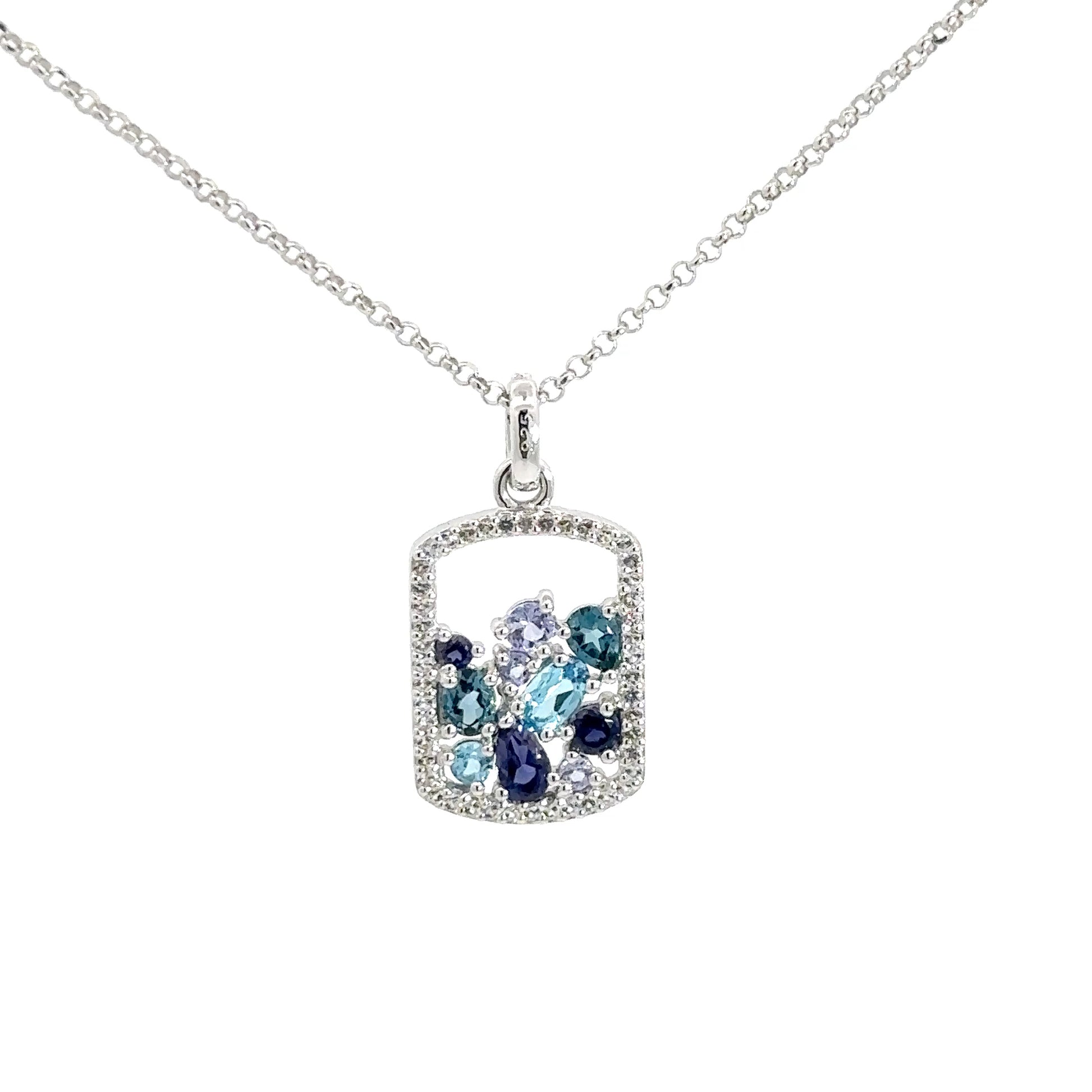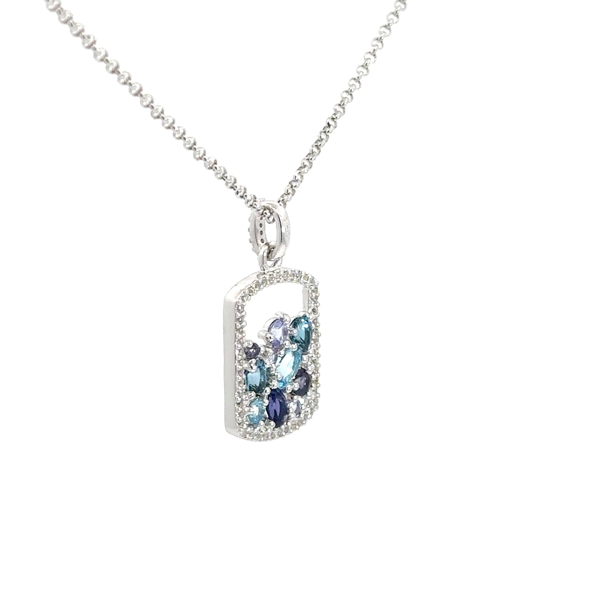 Add a pop of color to your everyday look with our stunning sterling silver multi-color cubic zirconia pendant. The pendant showcases a variety of elegant blue hues in unique shapes, surrounded by a sparkling white cubic zirconia halo. Elevate any outfit with this versatile and eye-catching piece!