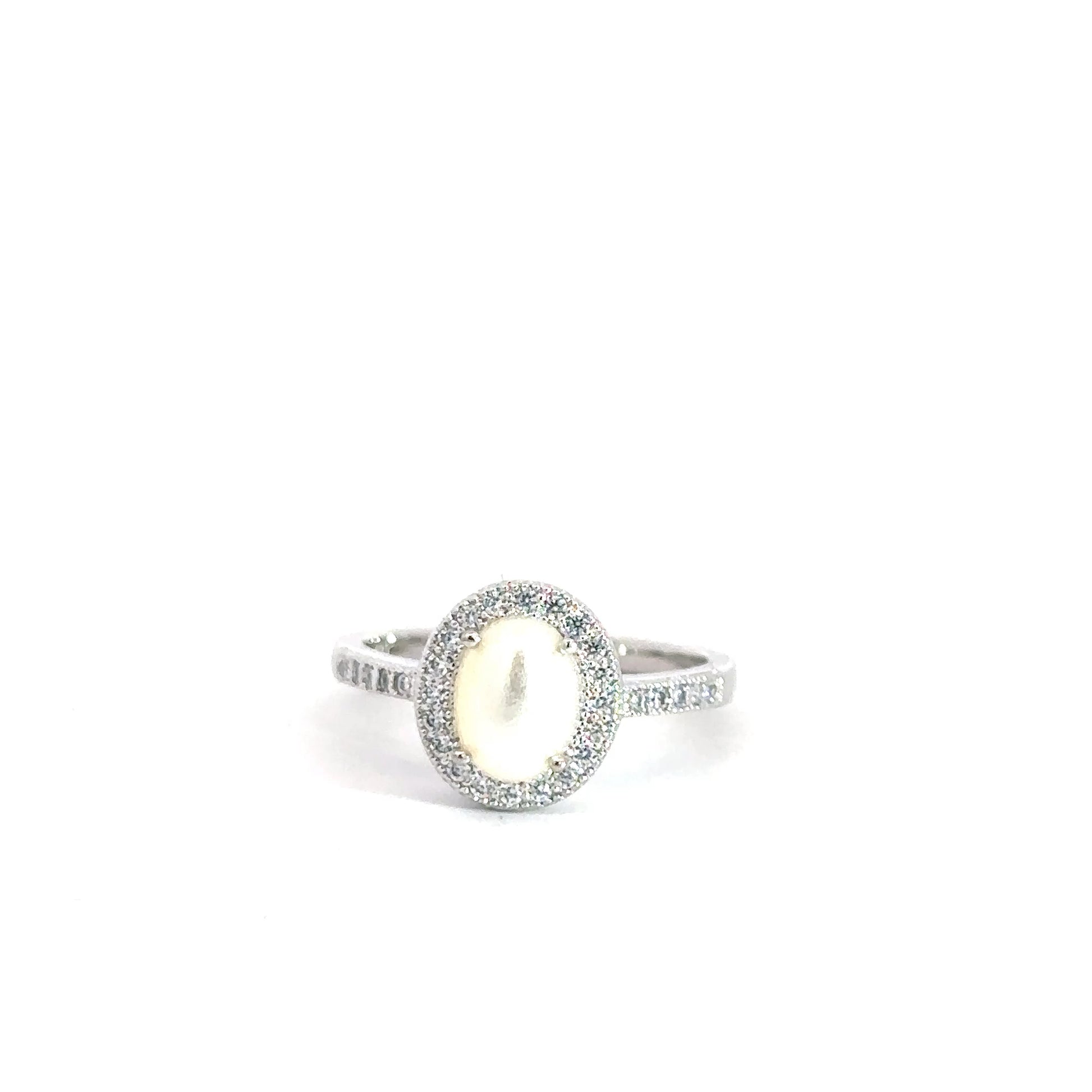 Elevate your everyday elegance with this stunning sterling silver ring, featuring a lustrous pearl at its heart surrounded by a shimmering halo of simulated diamonds. Delicate micropaved accents along the sides add sophisticated sparkle and dimension. Perfect for those who appreciate timeless beauty with a modern twist, this piece combines the organic warmth of pearl with brilliant diamond-like radiance. A versatile treasure that transitions seamlessly from day to night.